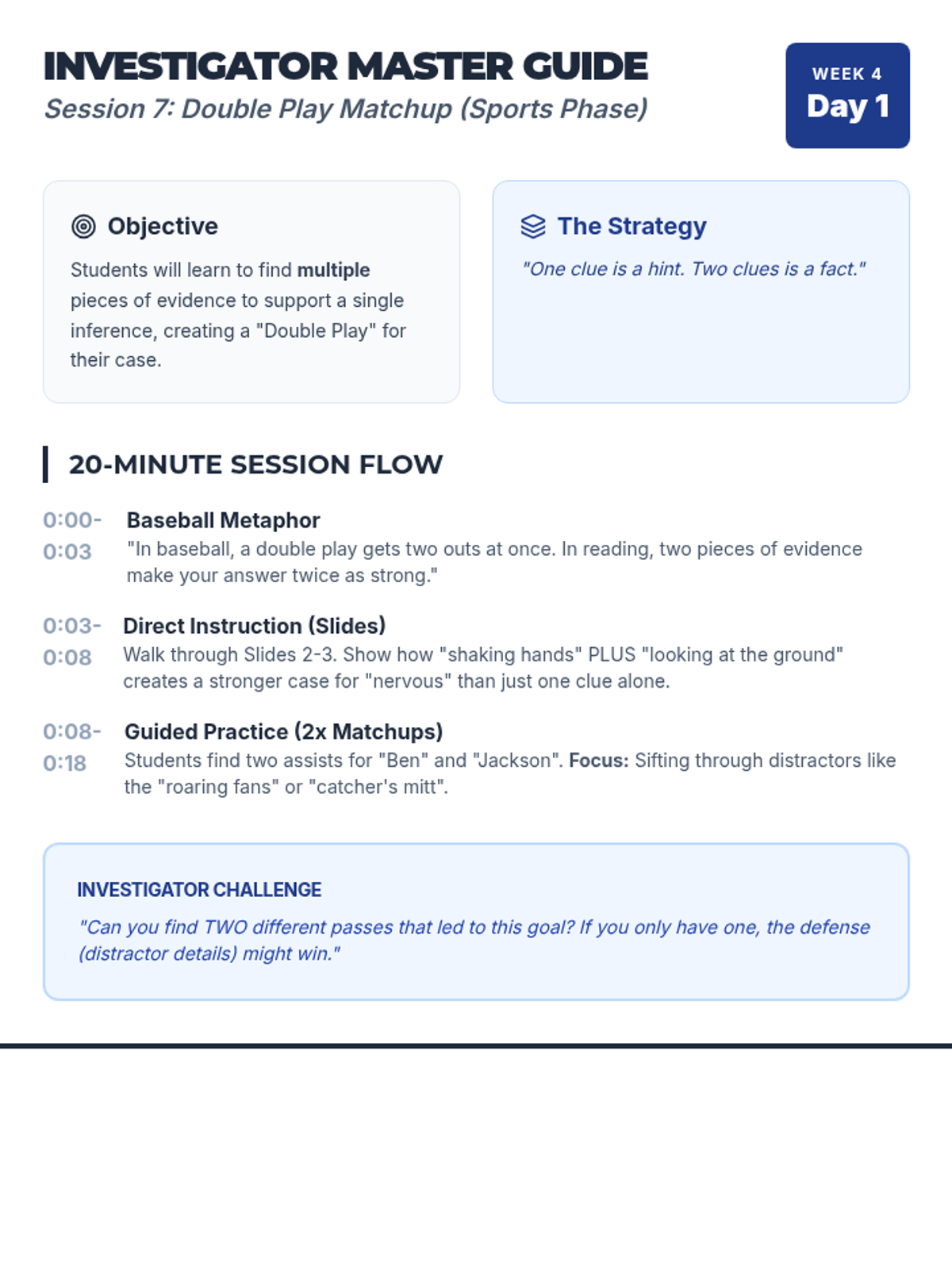 Students learn to find multiple pieces of evidence (a "double play") to support a single inference about a baseball game.