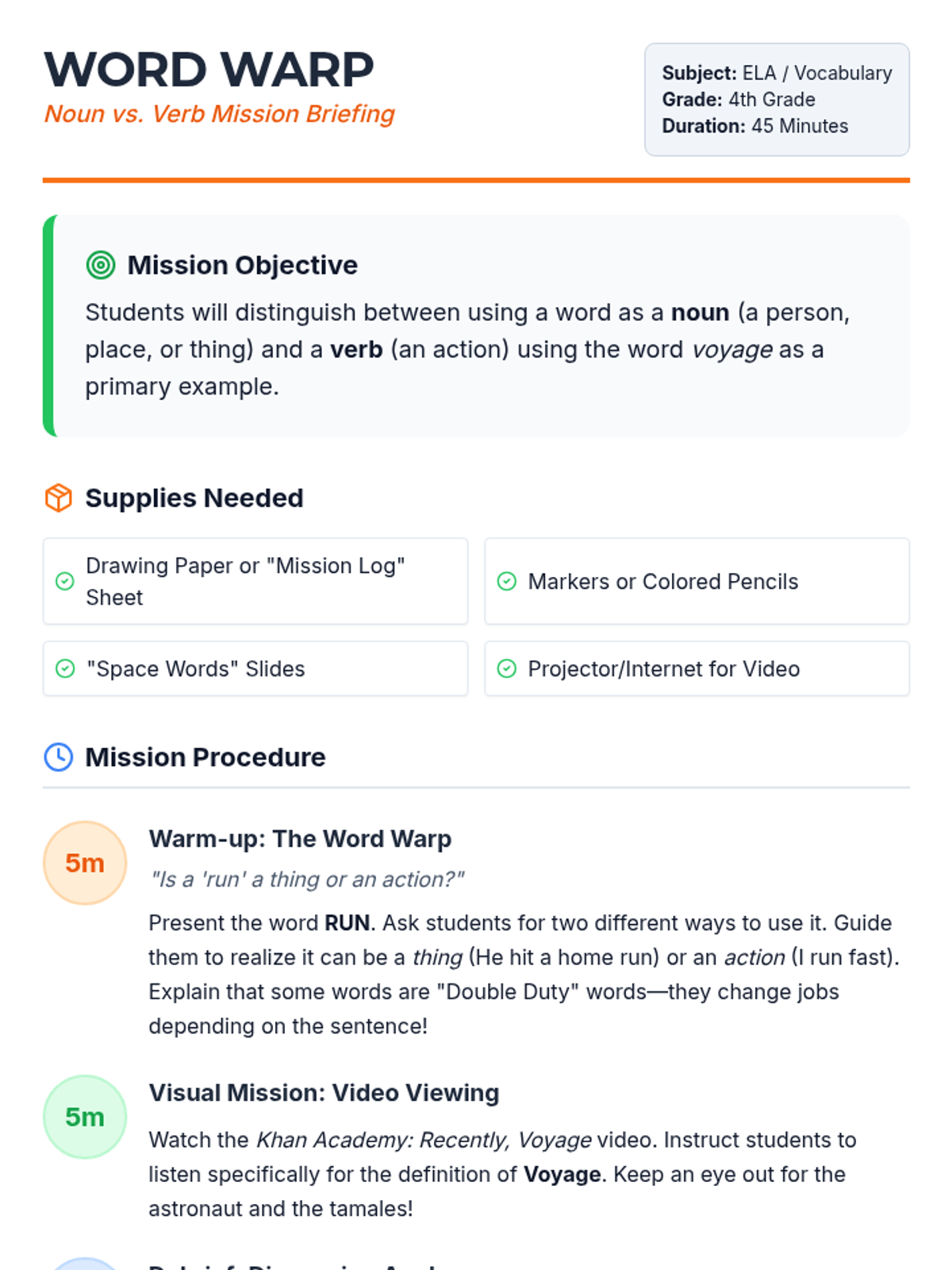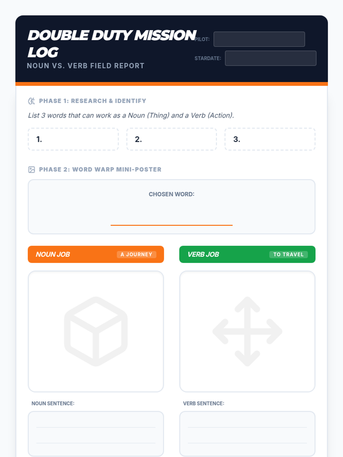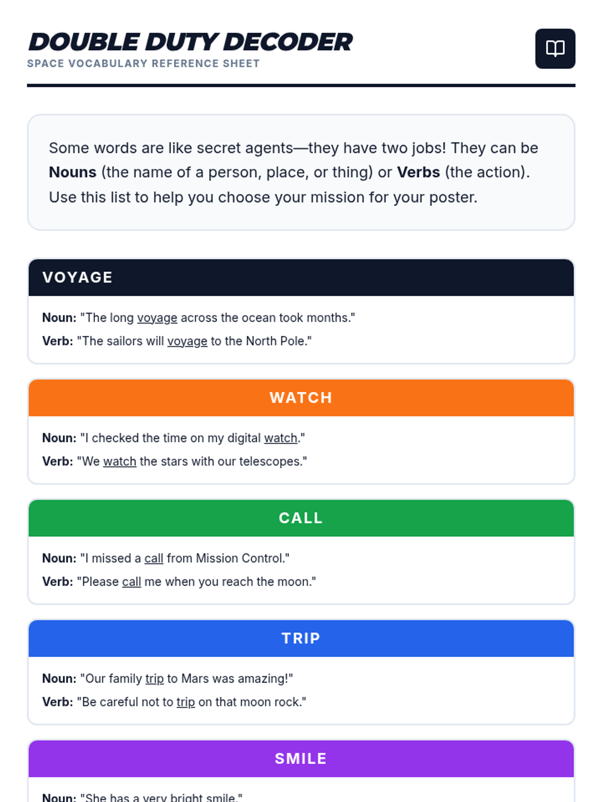 Students explore words with 'double duty' jobs as both nouns and verbs, inspired by a space-themed vocabulary video about the word 'voyage.'
