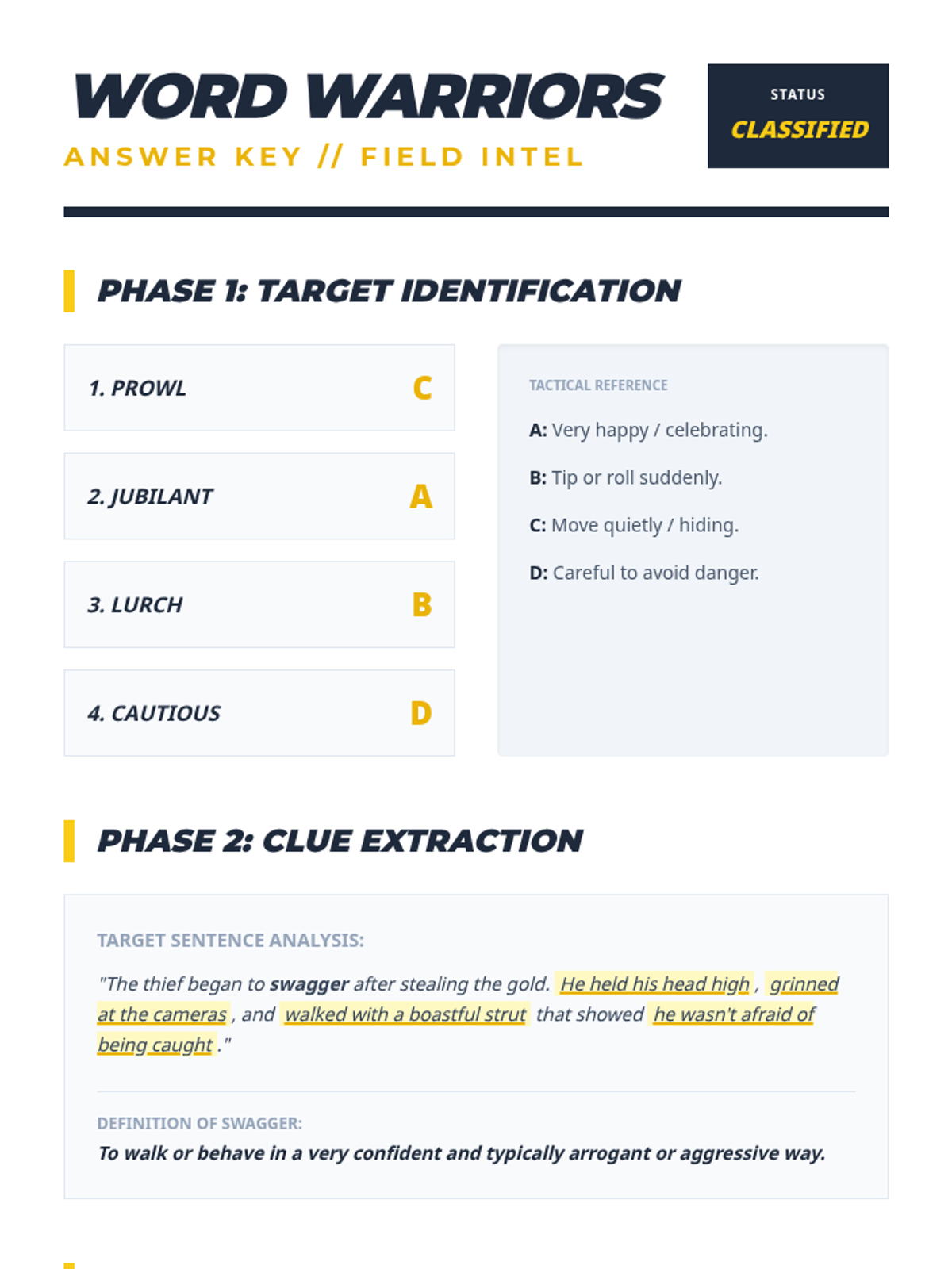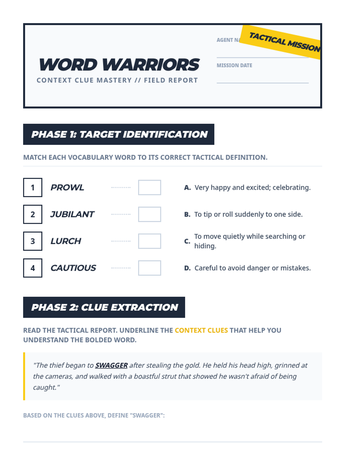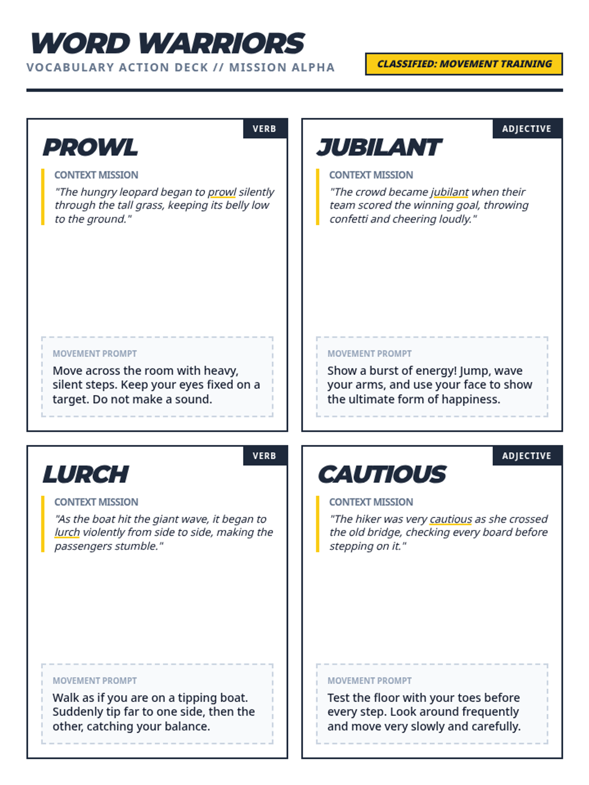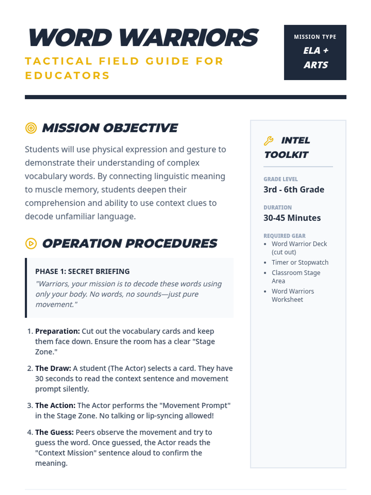 In this high-energy ELA and Arts integration lesson, students transform into 'Word Warriors' to master vocabulary through movement. They will analyze context clues and translate abstract meanings into physical gestures and expressions, reinforcing both linguistic comprehension and creative communication.