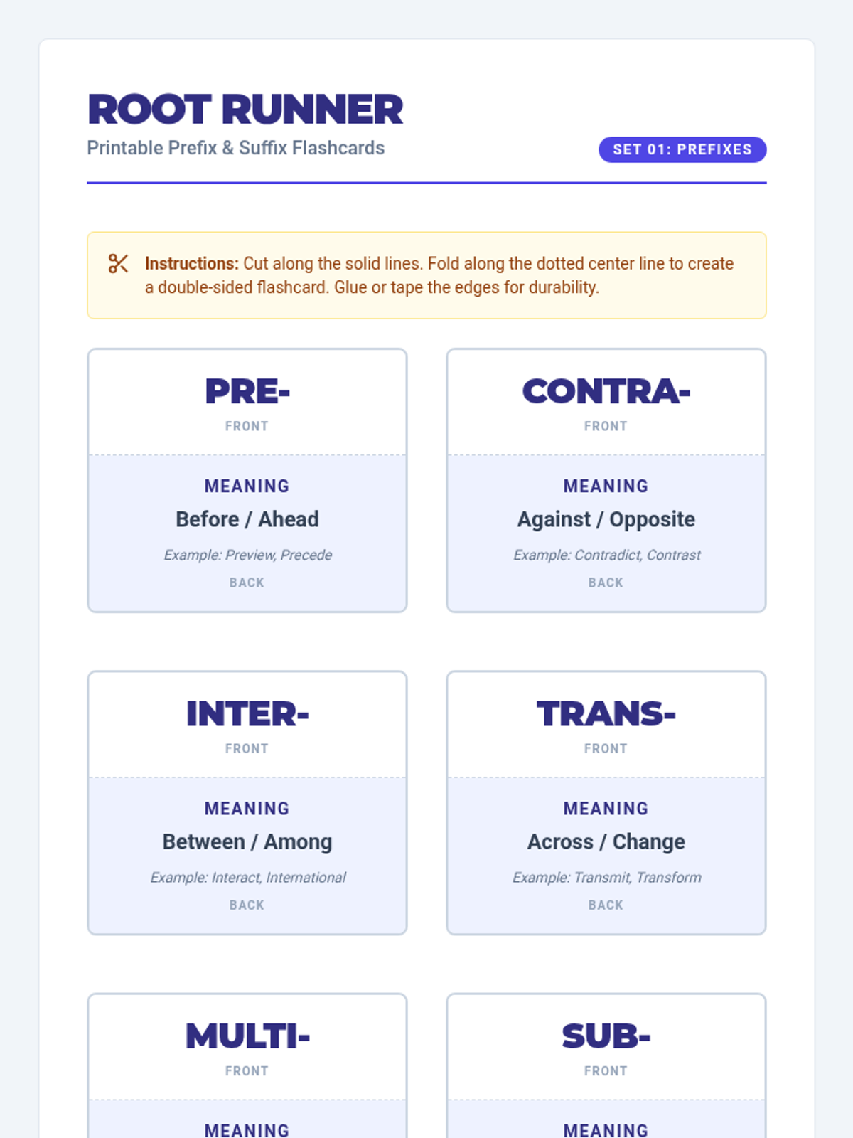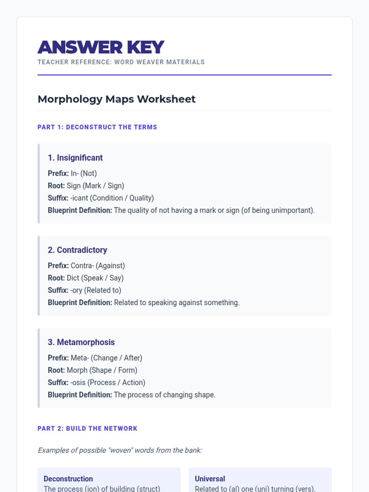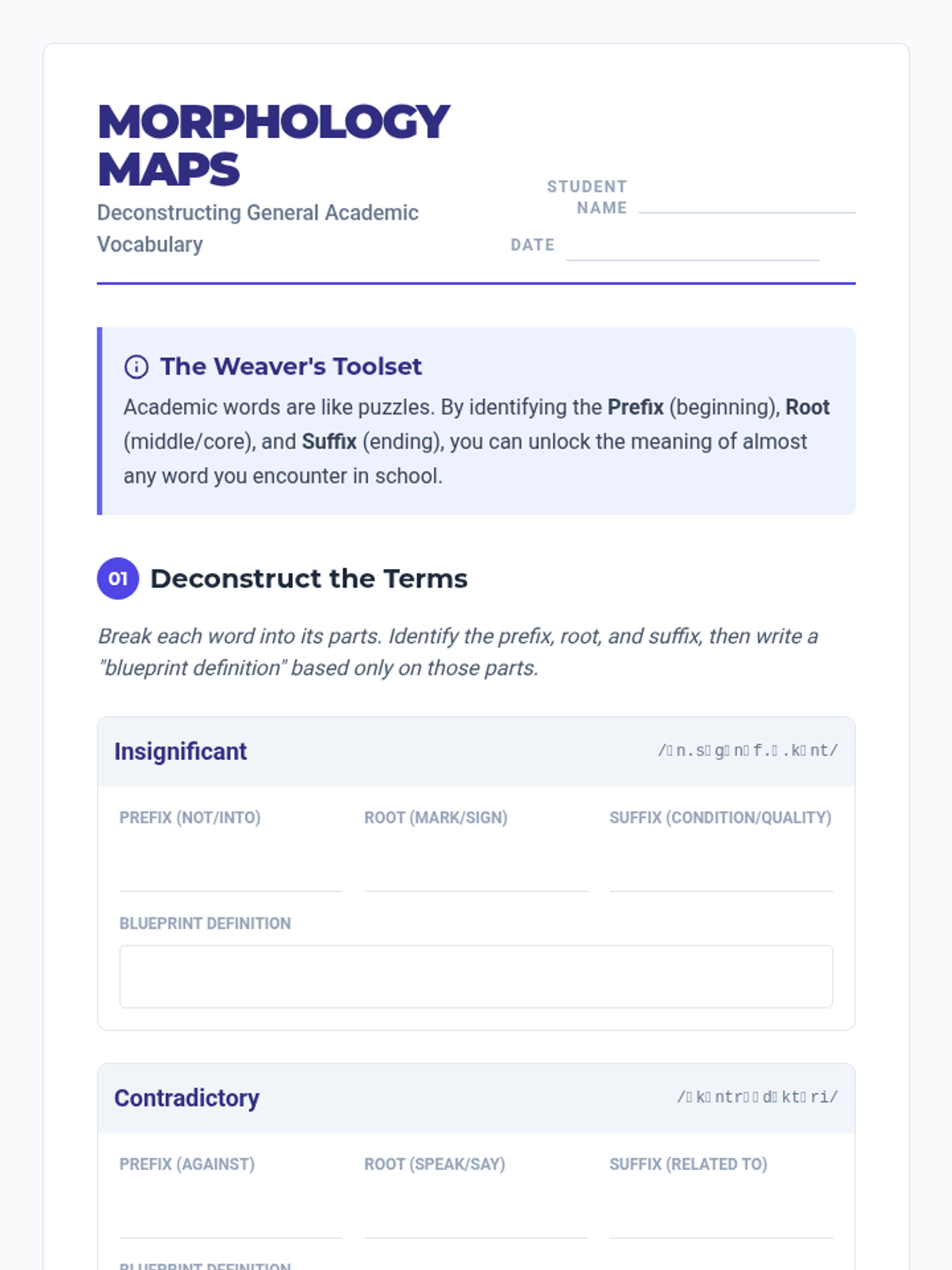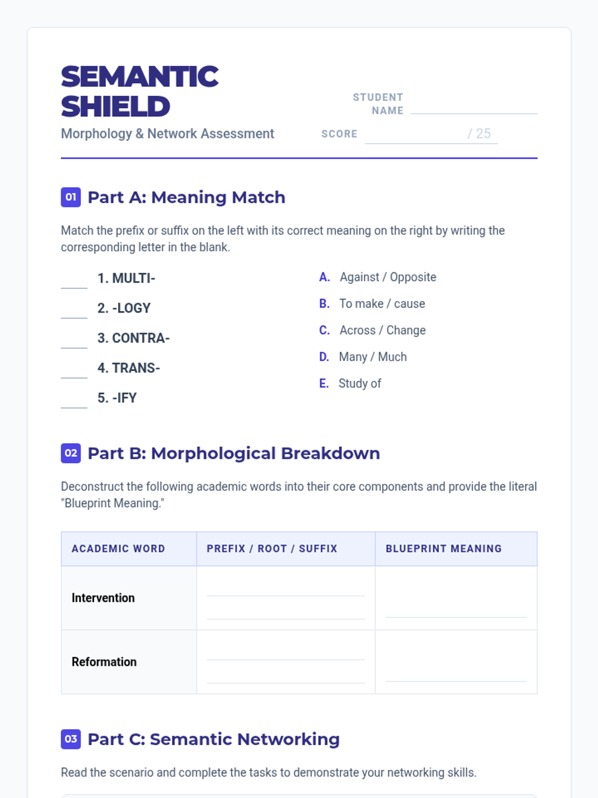 A lesson focused on breaking down academic vocabulary into prefixes, suffixes, and roots to build semantic networking skills. Students will learn to decode unfamiliar terms by analyzing their morphological components.