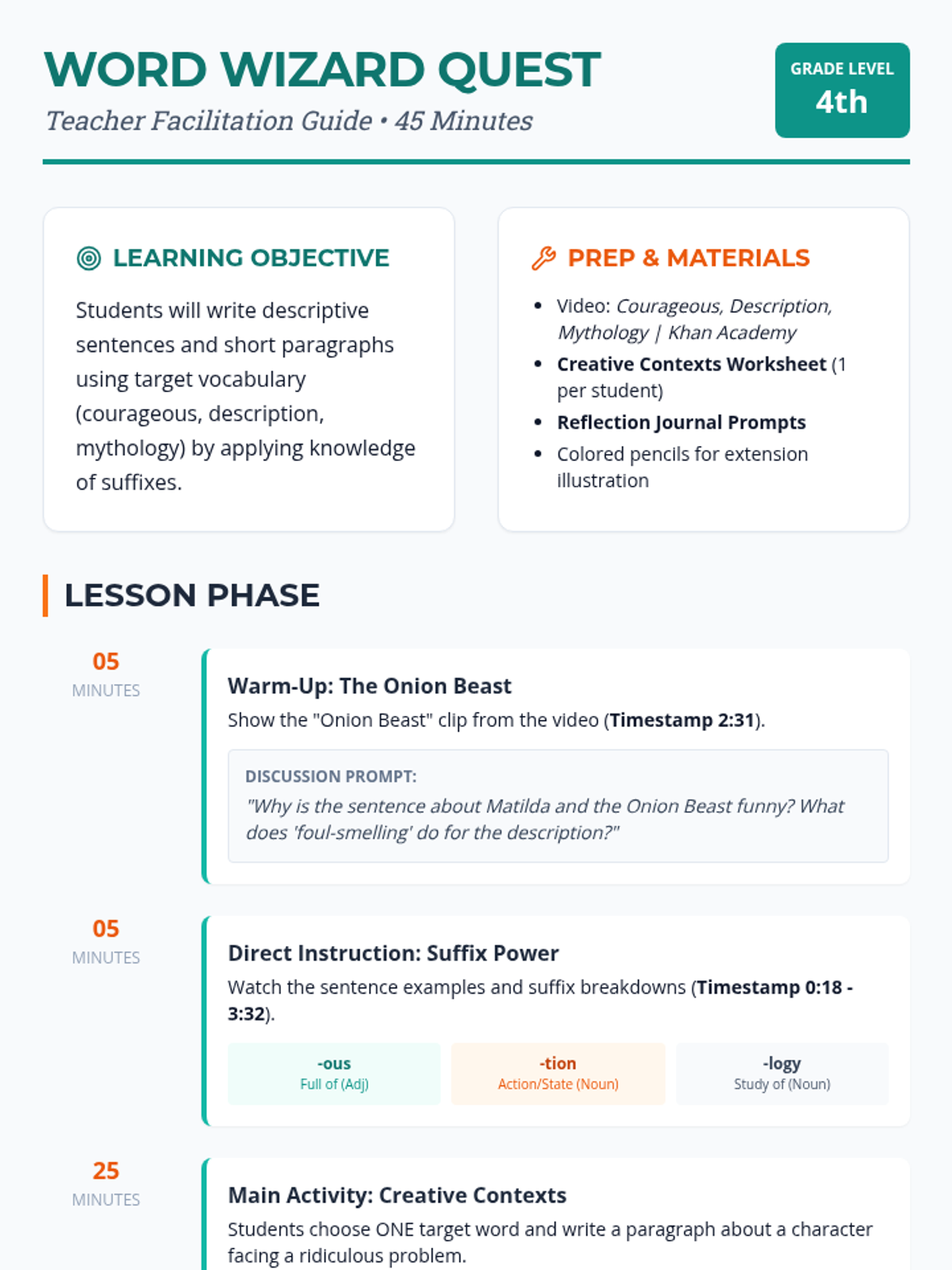 A high-energy vocabulary lesson where 4th graders master 'courageous', 'description', and 'mythology' through suffix analysis and creative storytelling about ridiculous monsters and mishaps.