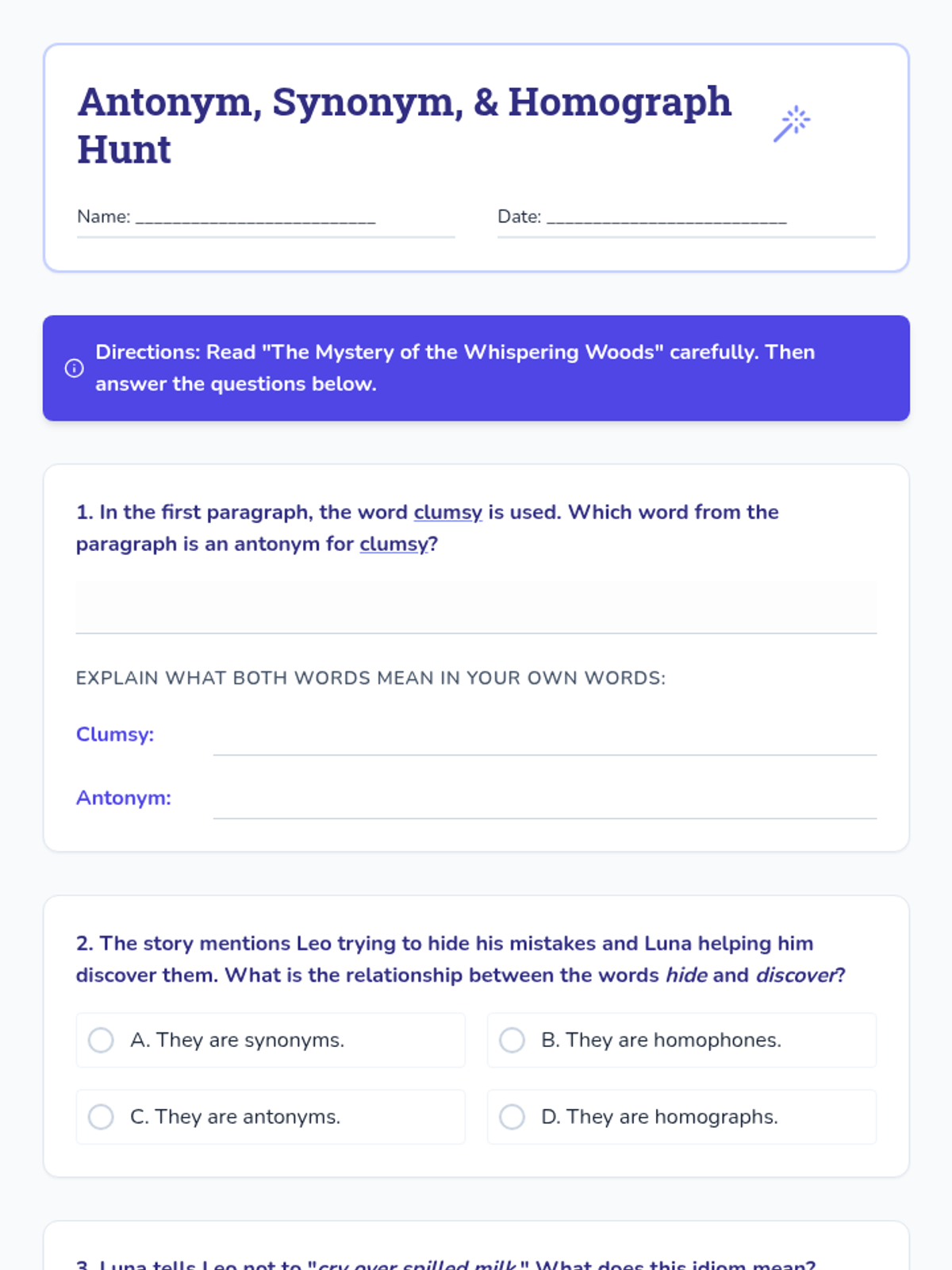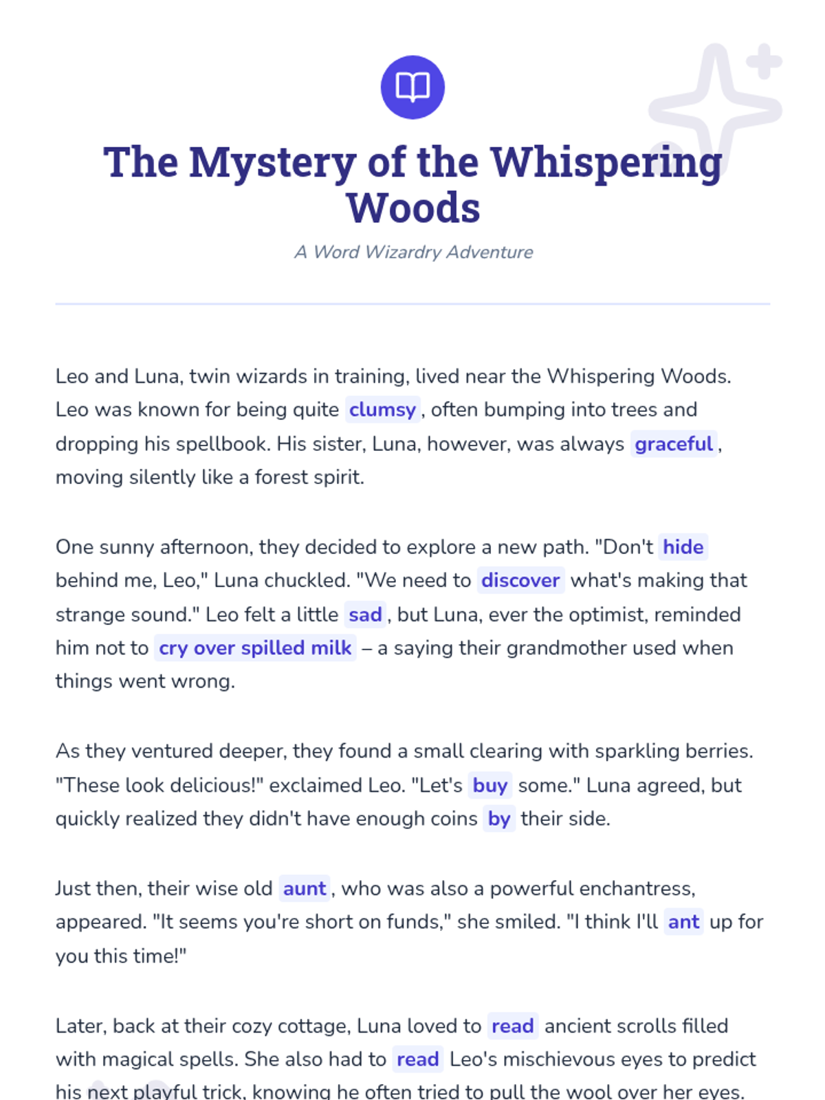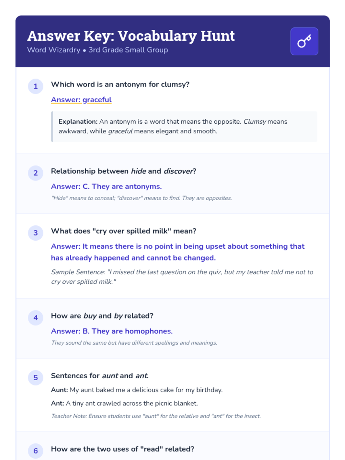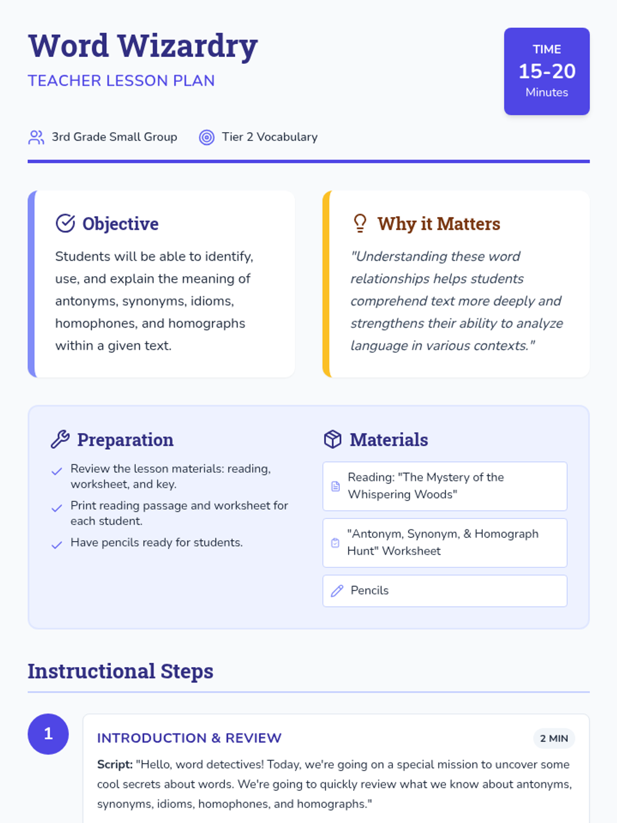 A Tier 2 small group intervention focused on identifying and using antonyms, synonyms, idioms, homophones, and homographs within a magical narrative context.