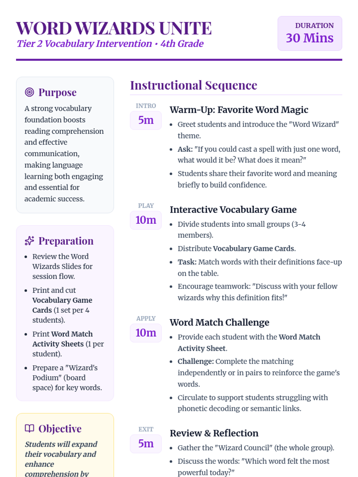 A 30-minute Tier 2 vocabulary intervention for 4th graders, focusing on high-frequency academic words through magical themed games and collaborative matching activities.