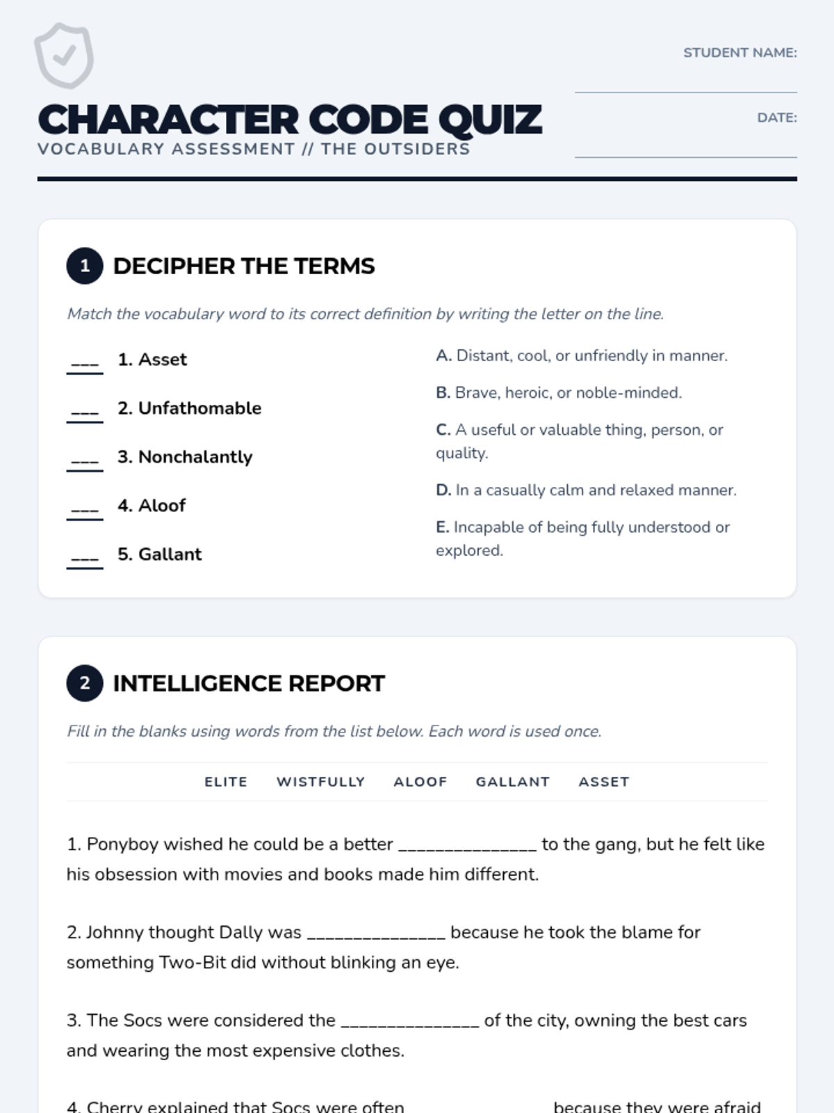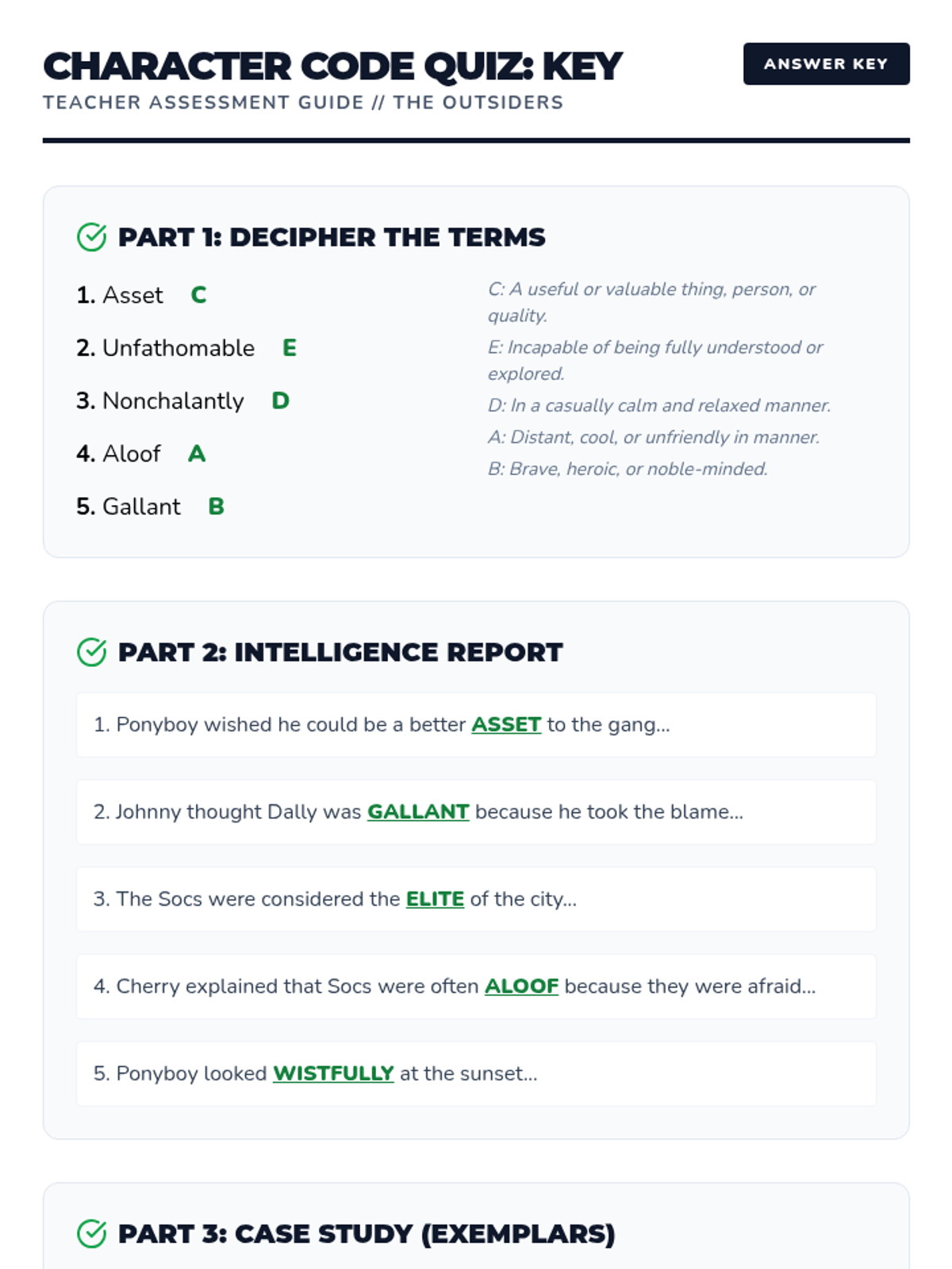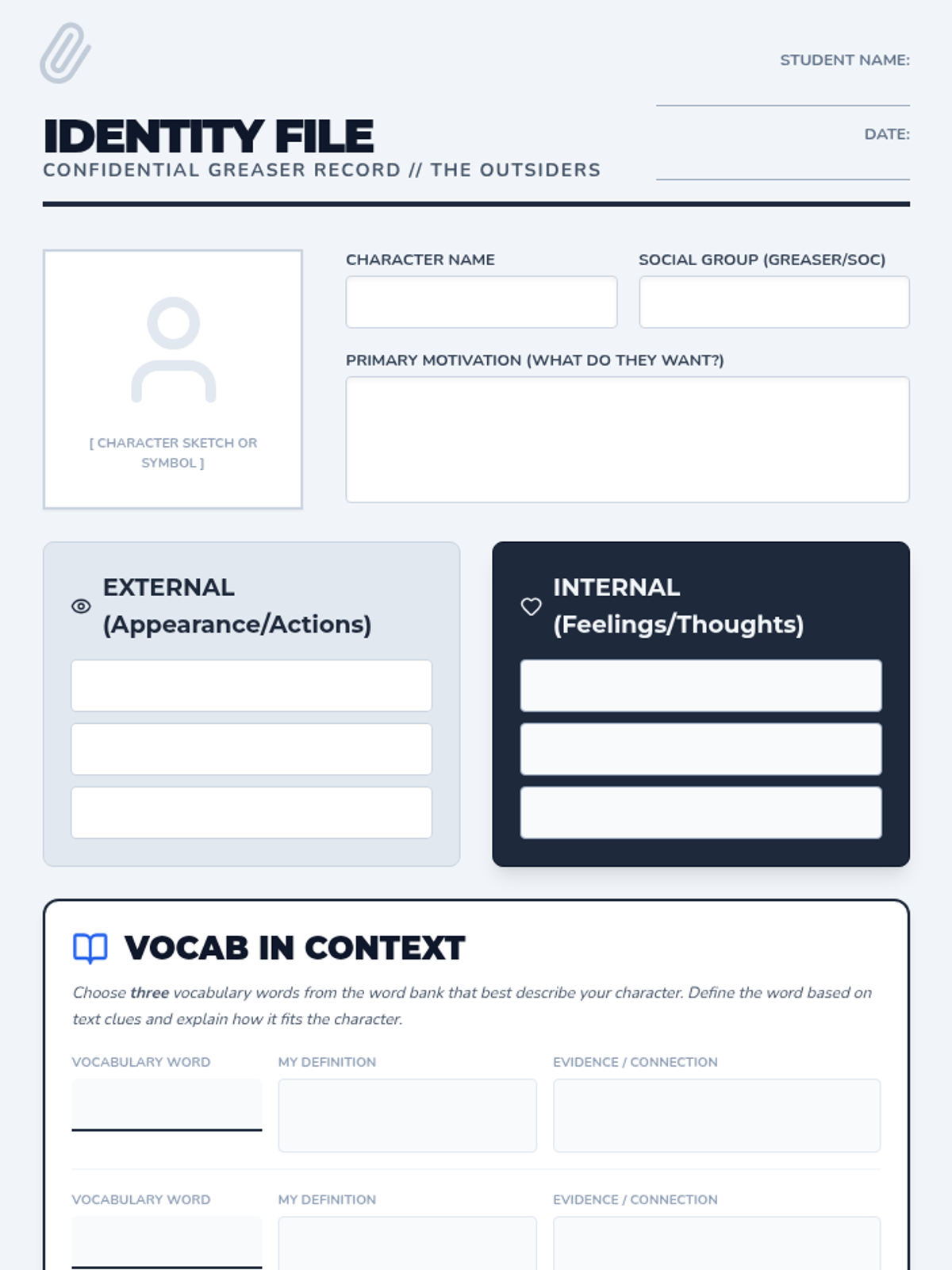 Students analyze key characters from The Outsiders while exploring how specific vocabulary words describe their personality and social standing.
