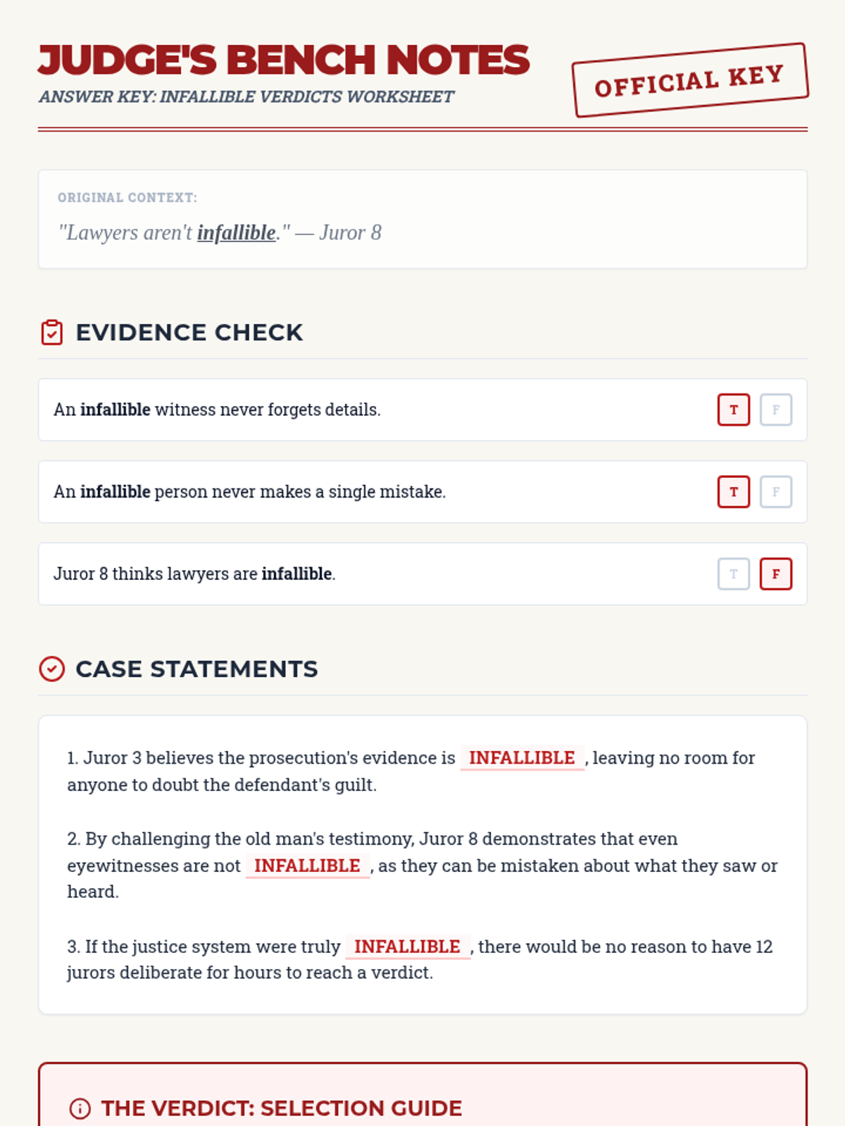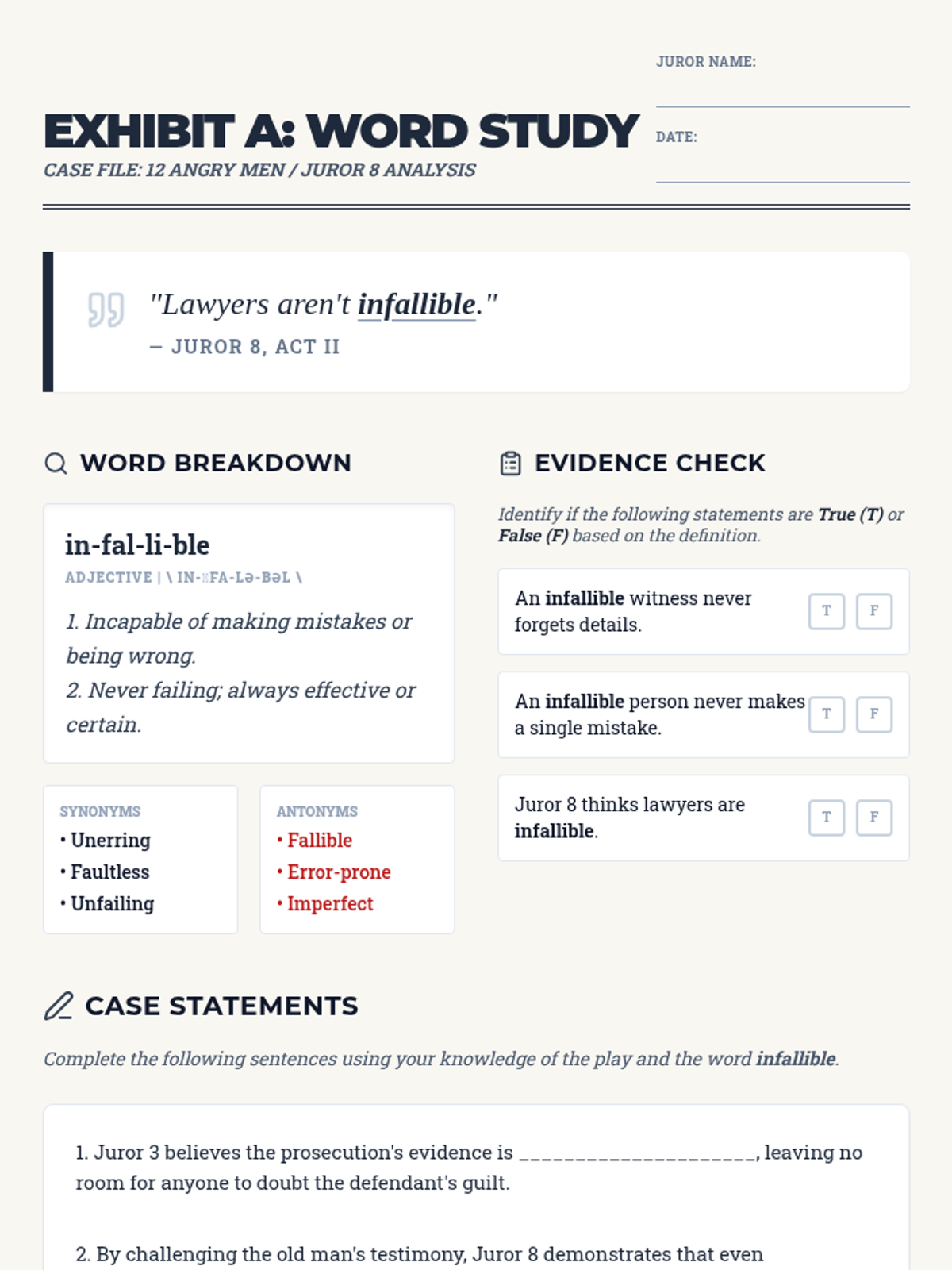 A vocabulary and context-based exploration of Juror 8's arguments in '12 Angry Men', focusing on the concepts of infallibility and reasonable doubt.
