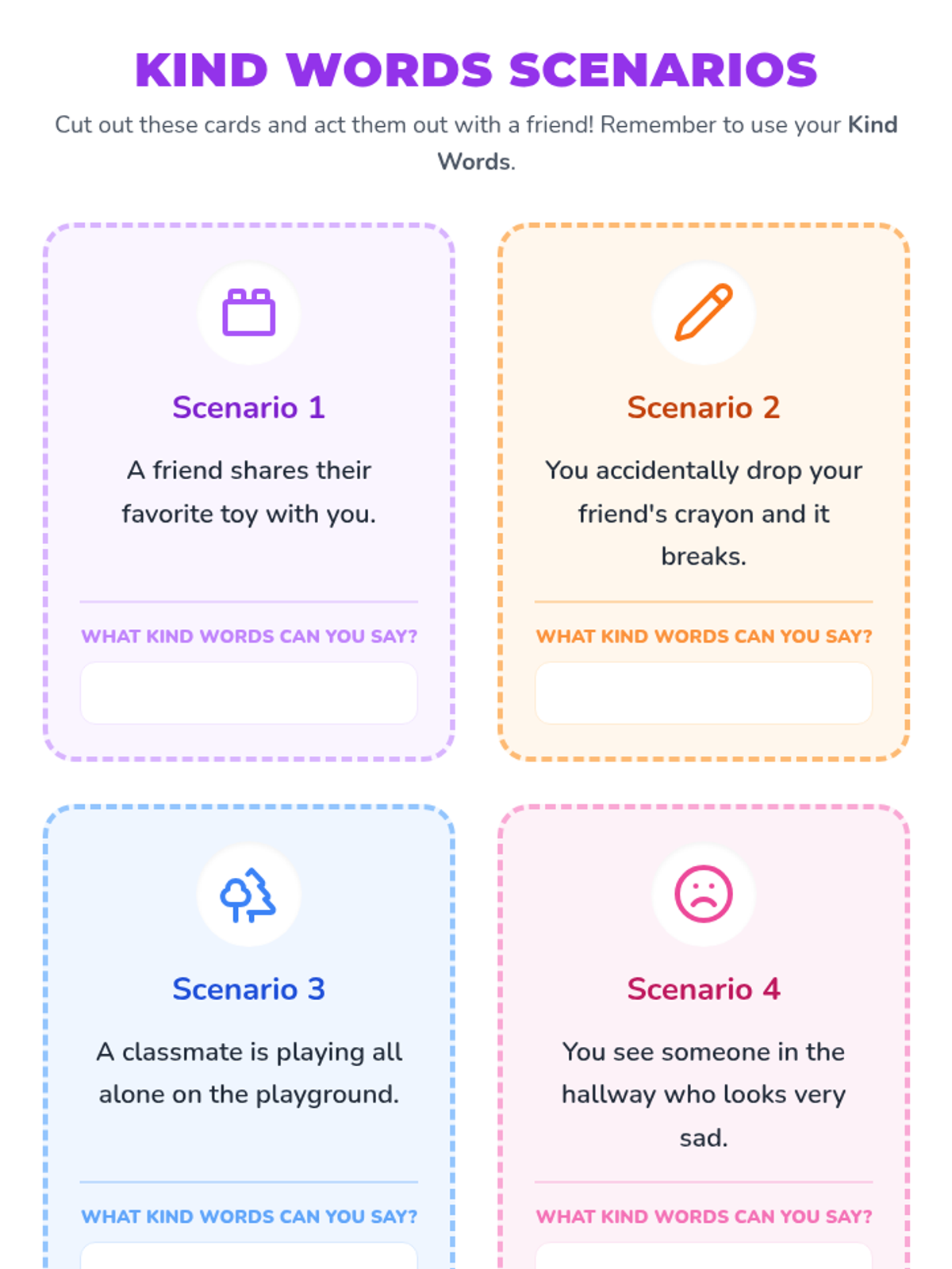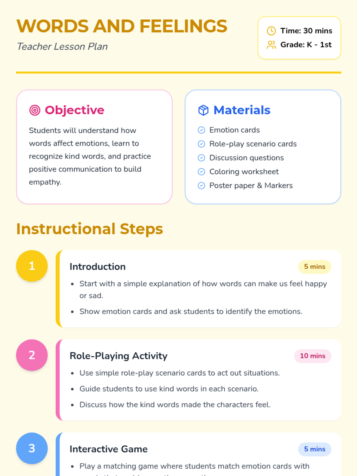 A social-emotional learning lesson for young learners focusing on the power of kind words and recognizing emotions. Students engage in role-play, discussion, and creative activities to build empathy.