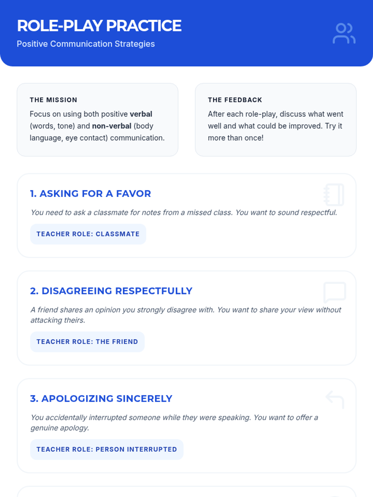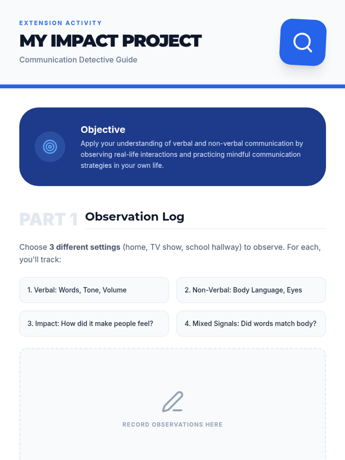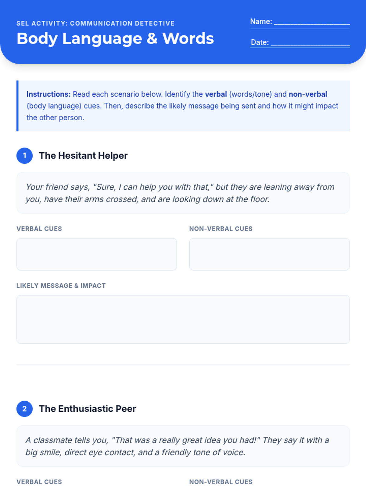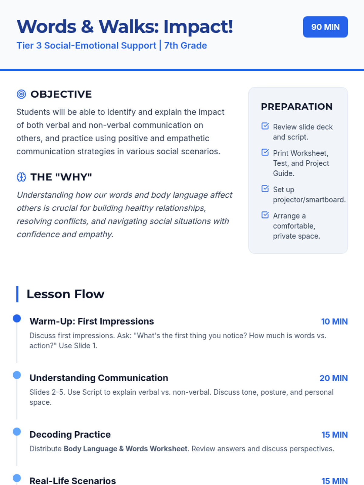 A 90-minute Tier 3 SEL lesson for 7th graders focused on the impact of verbal and non-verbal communication. Students learn to decode body language, practice active listening, and use positive communication strategies.