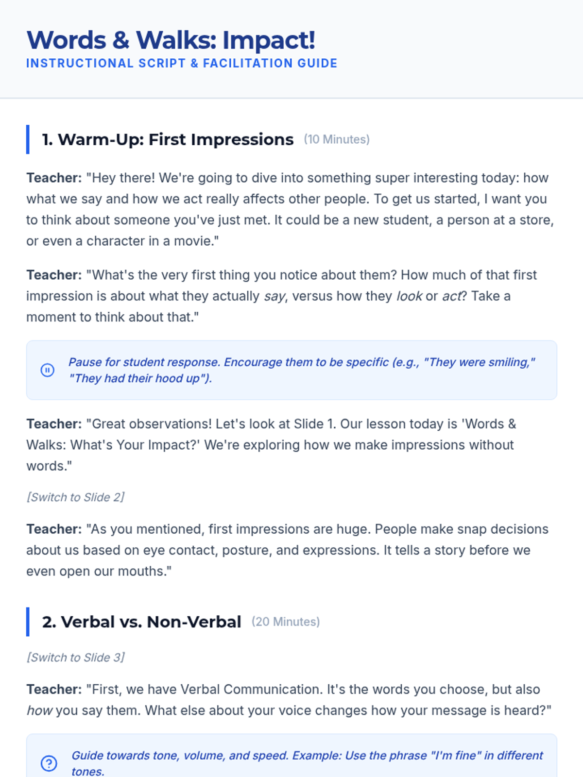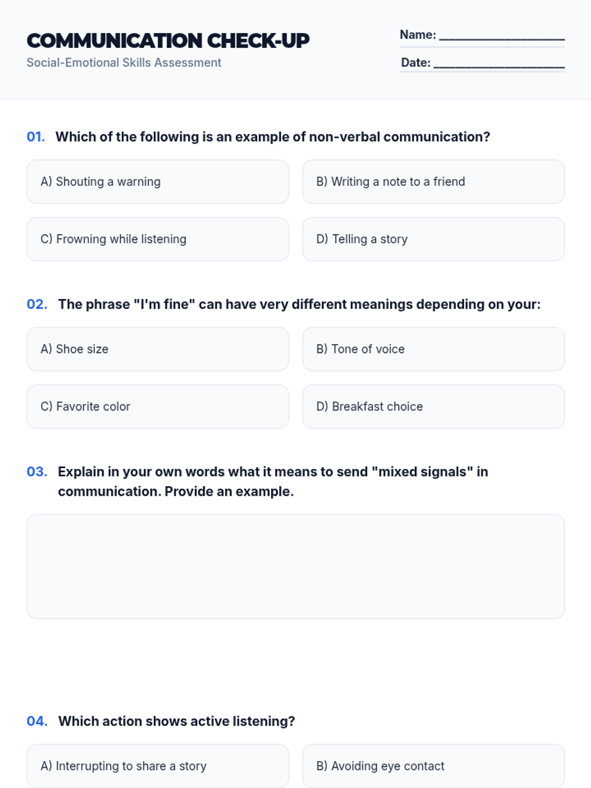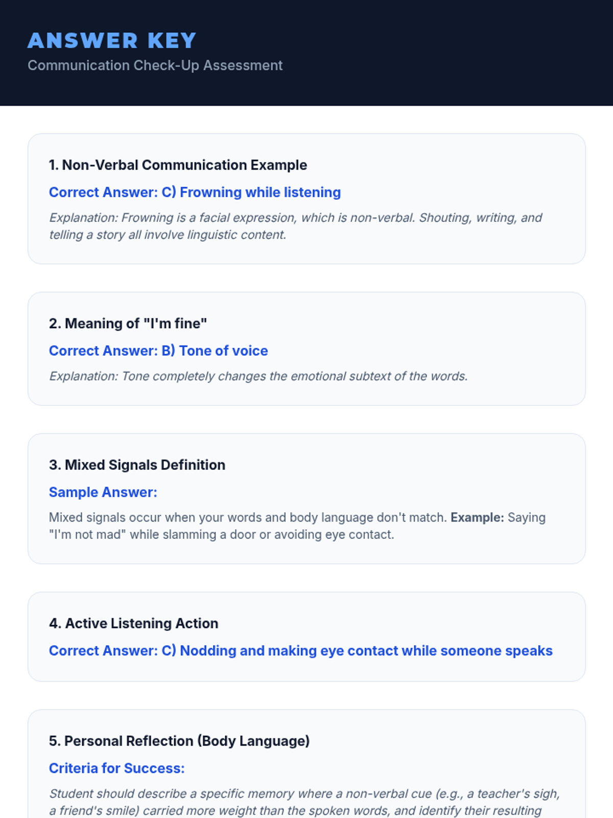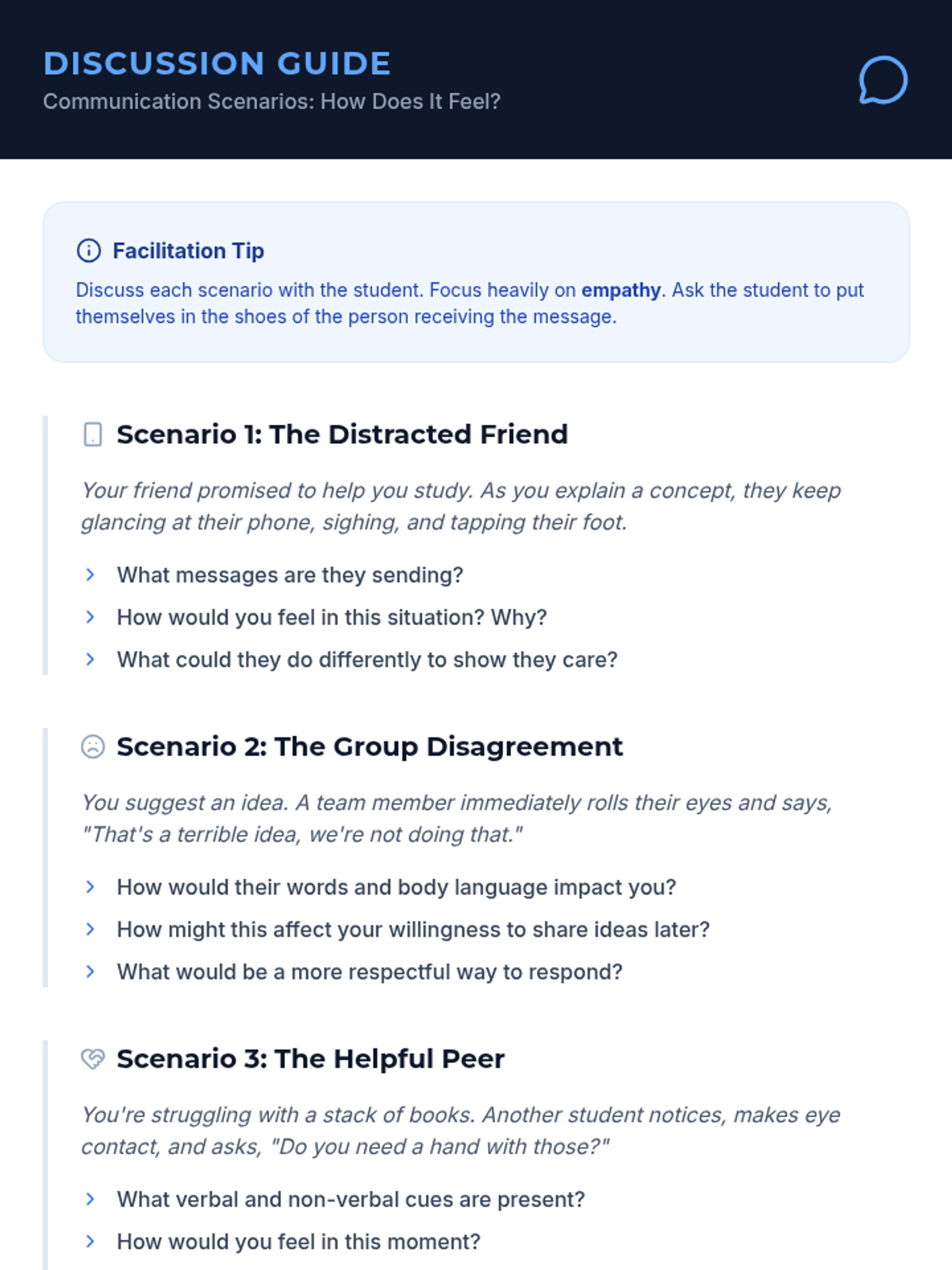 A 90-minute Tier 3 SEL lesson for 7th graders focused on the impact of verbal and non-verbal communication. Students learn to decode body language, practice active listening, and use positive communication strategies.