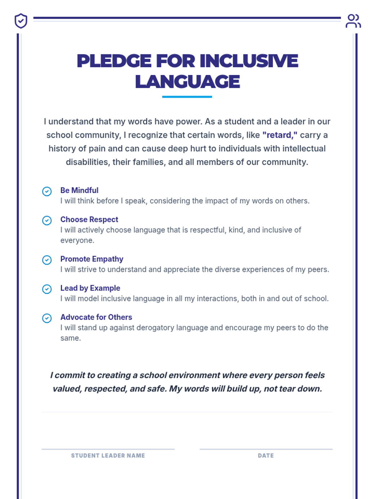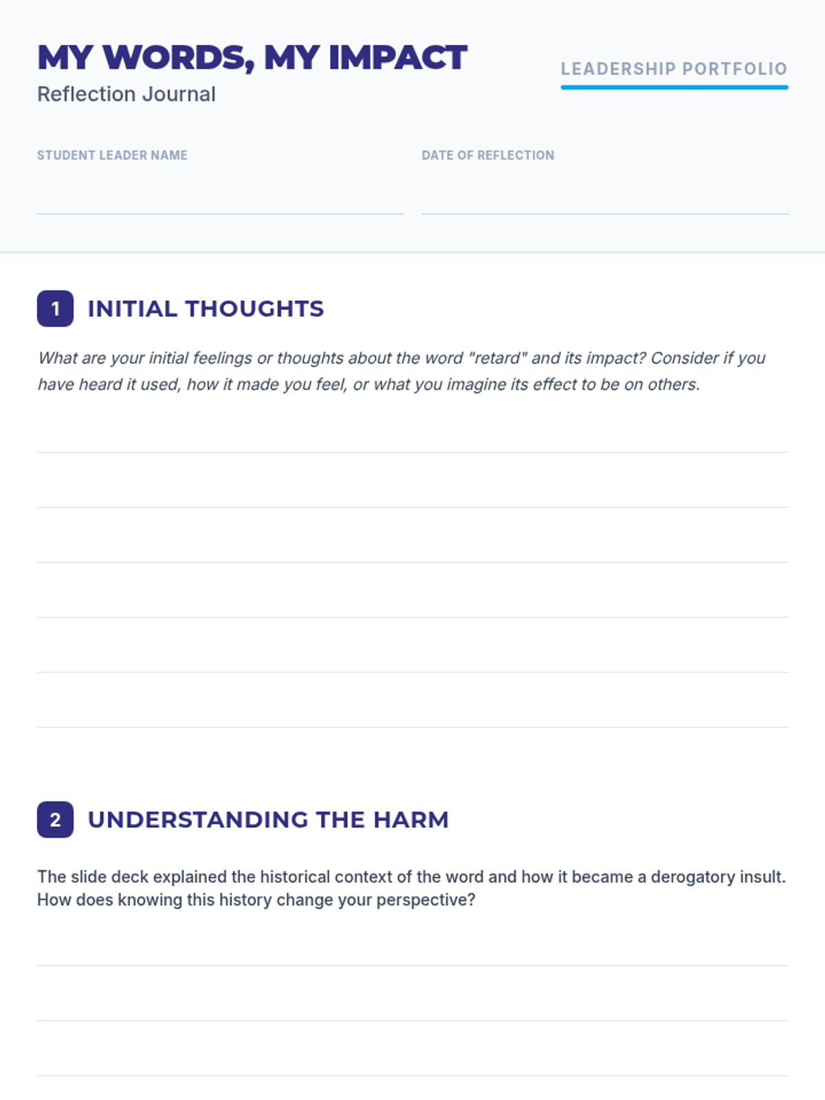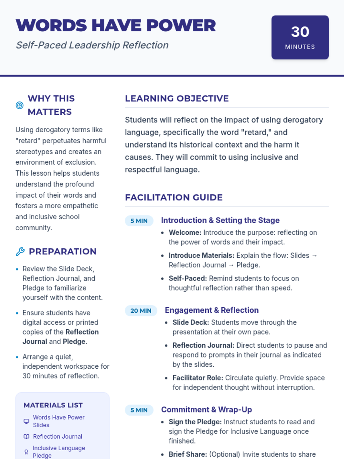 A 30-minute self-paced reflection for student leaders on the historical context and harmful impact of derogatory language, specifically focusing on the word 'retard', and committing to inclusive communication.