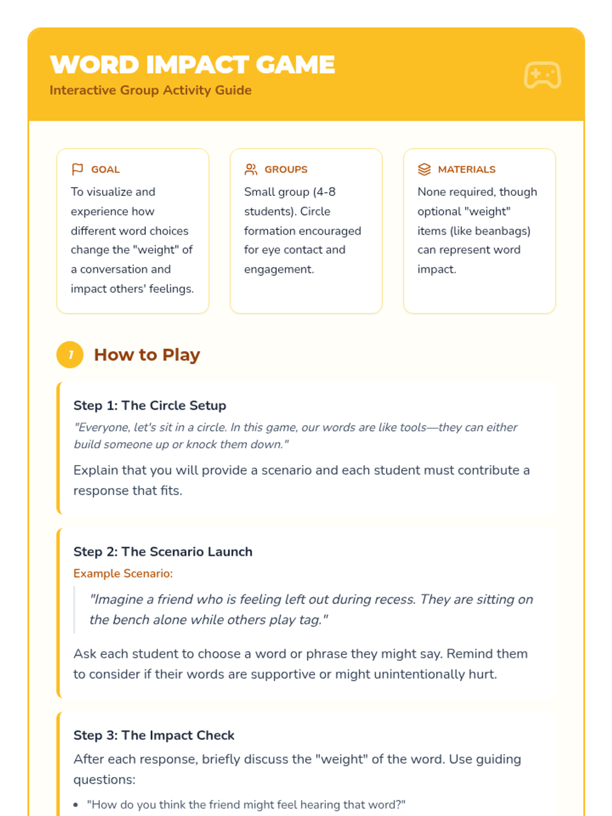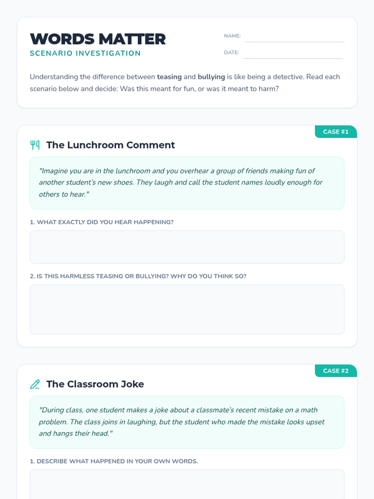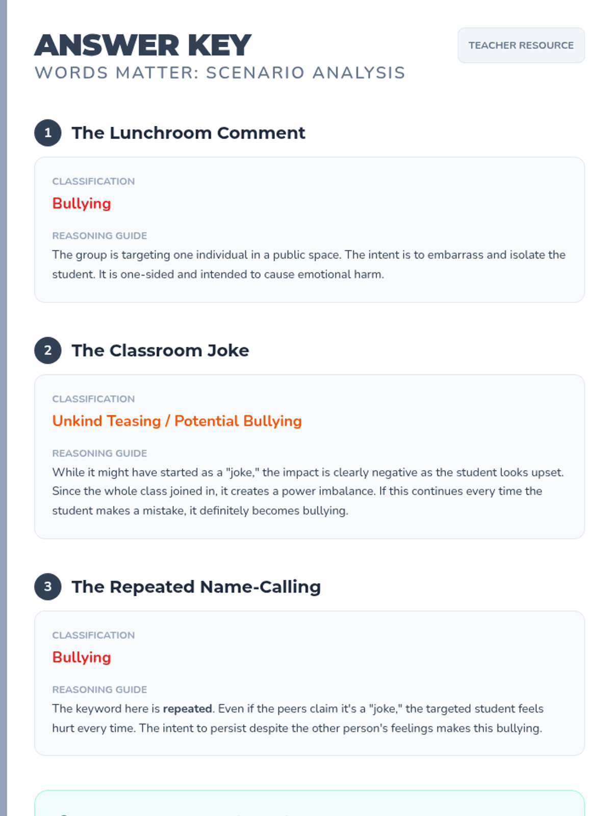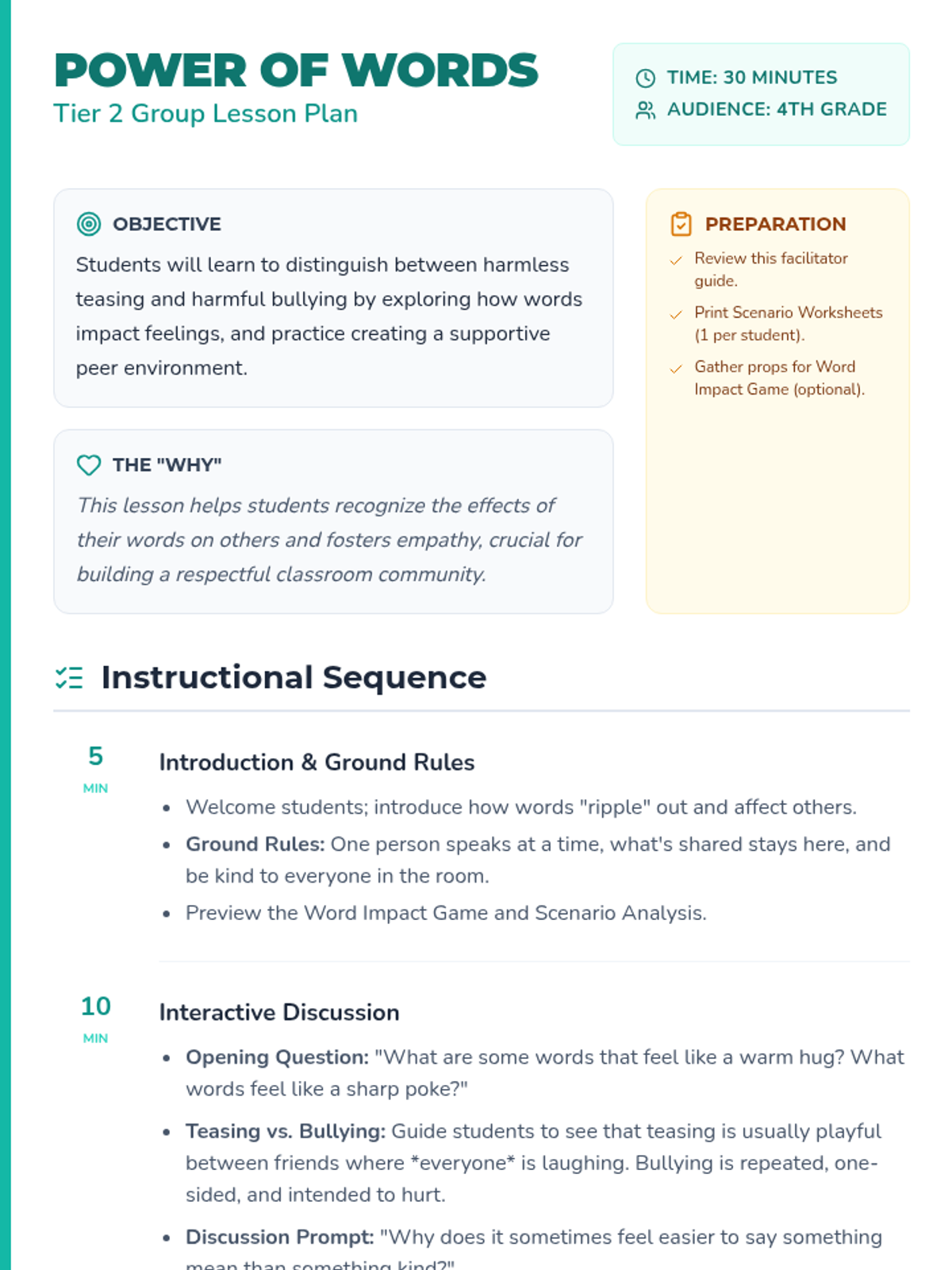 A 30-minute Tier 2 group intervention for 4th graders focused on the impact of words and distinguishing between teasing and bullying to foster a supportive classroom environment.