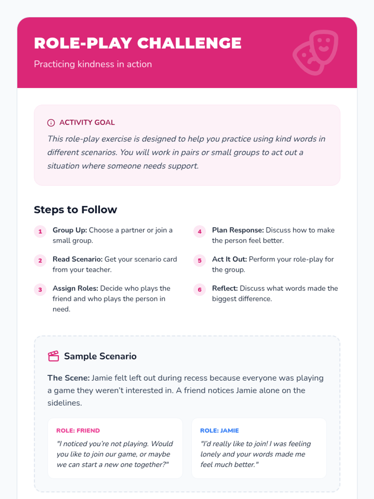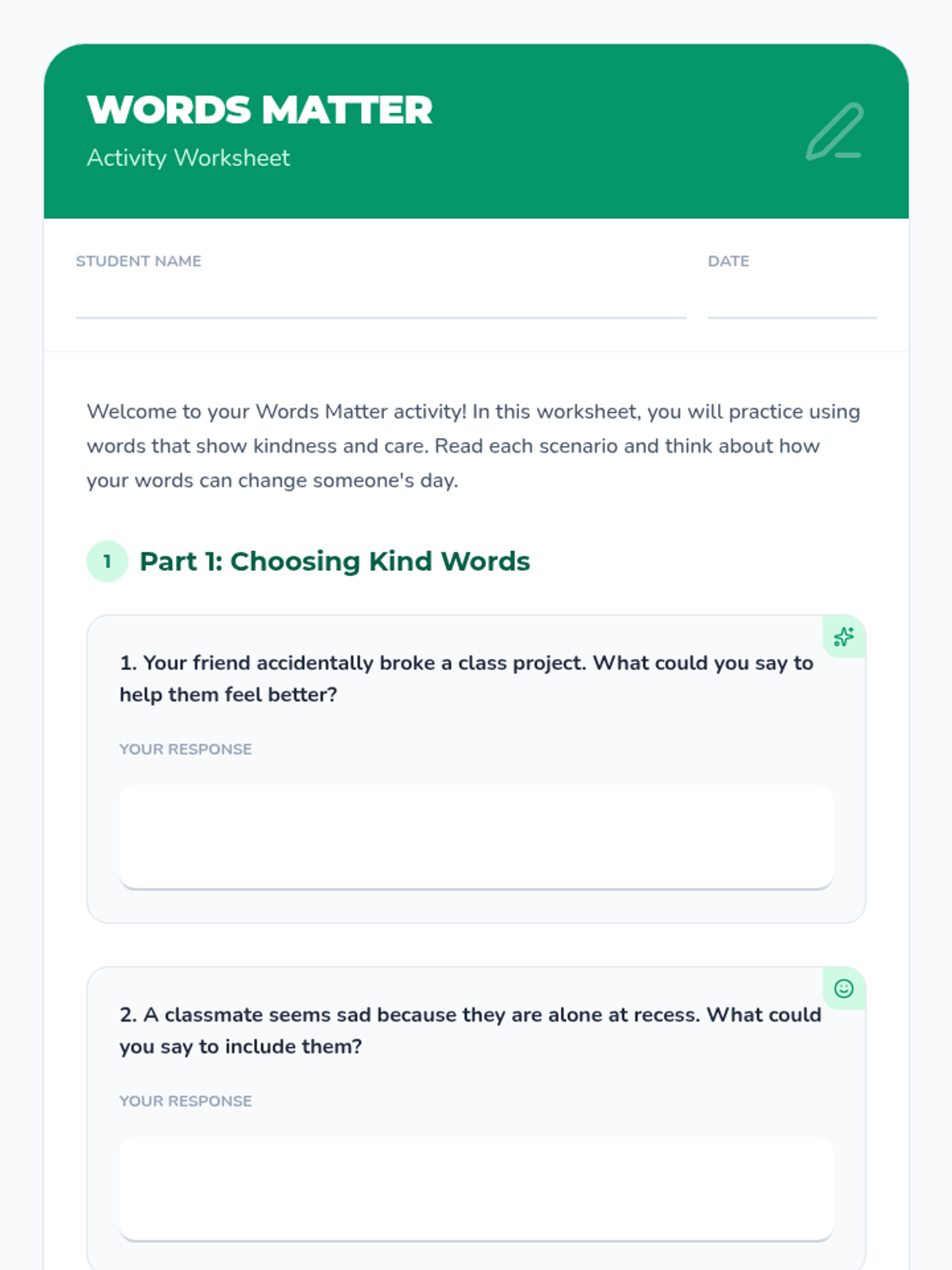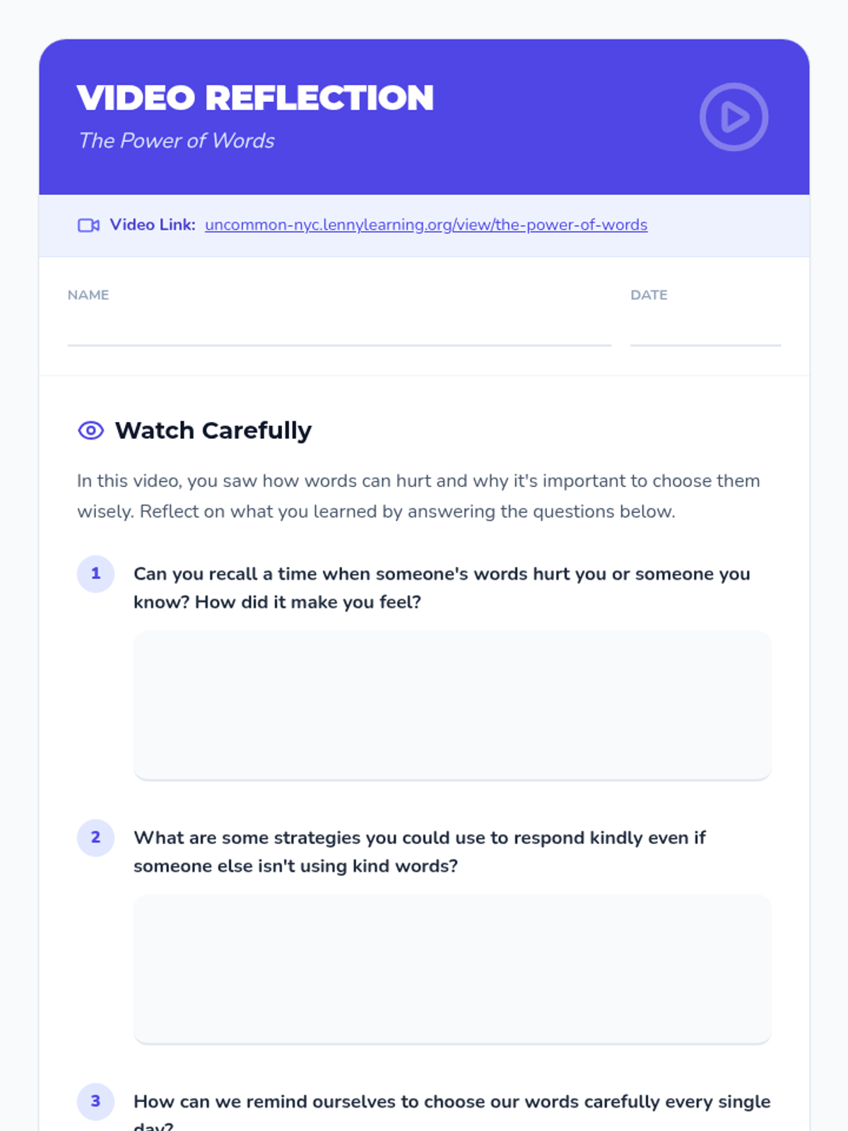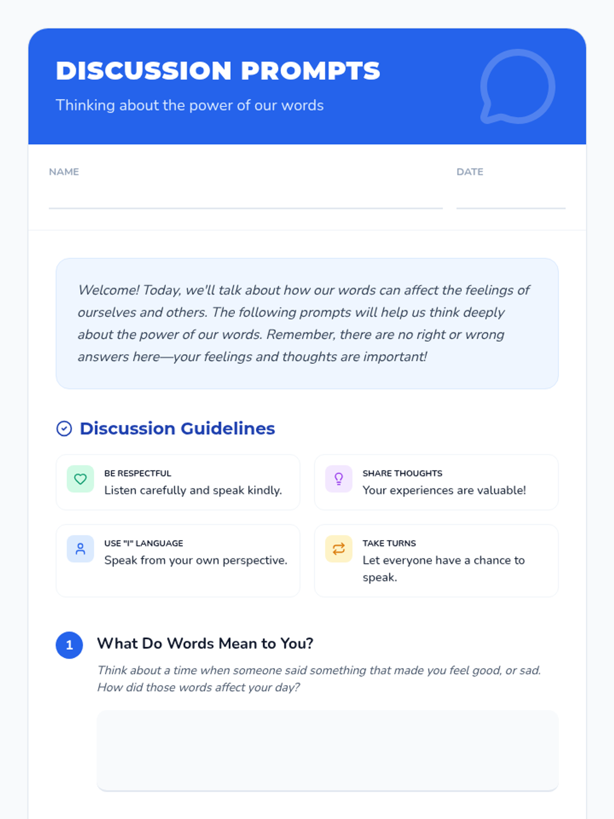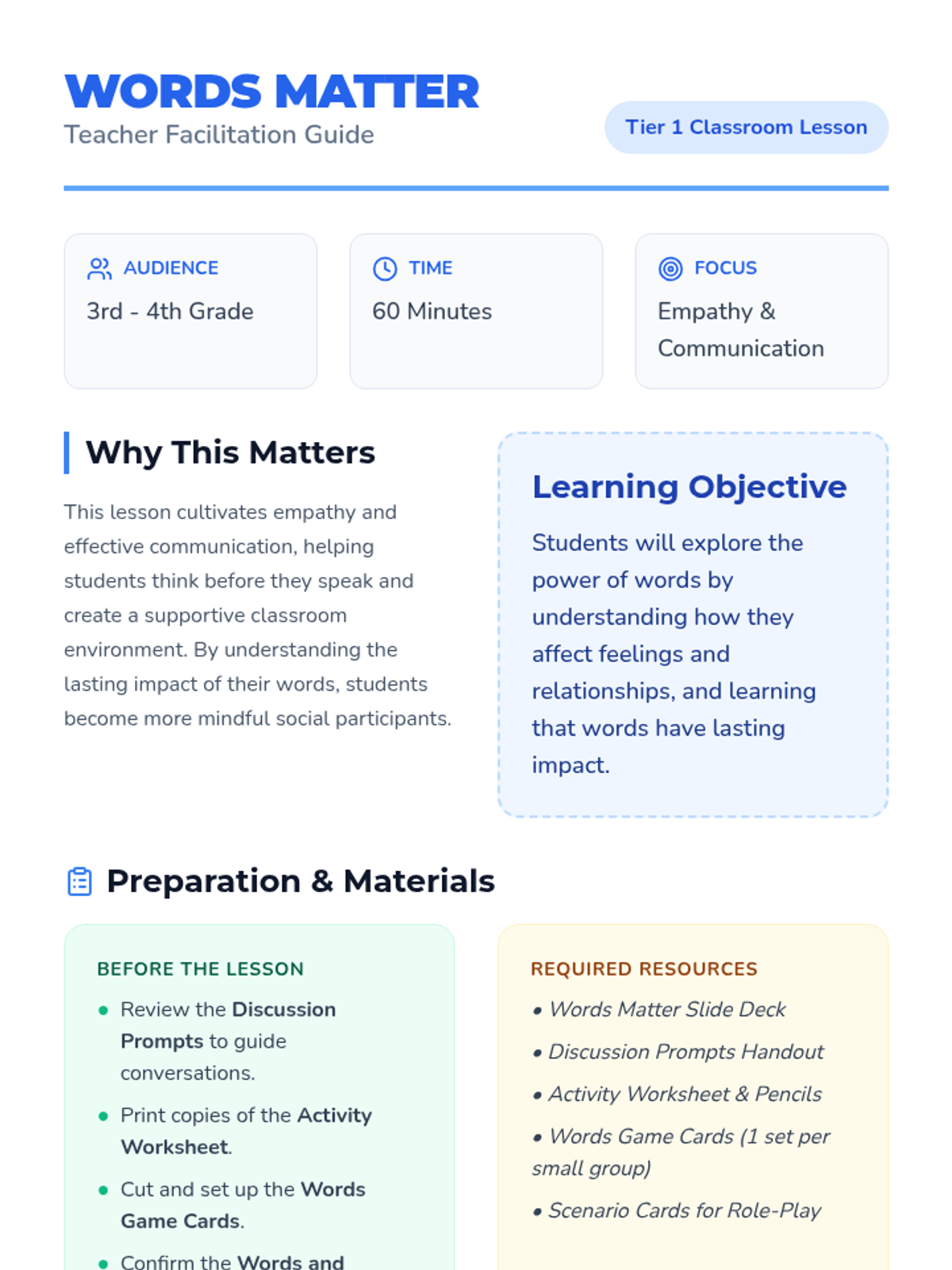 An interactive lesson for 3rd and 4th graders exploring how words impact emotions and relationships. Students learn that words have a lasting effect through discussion, role-play, and hands-on activities.