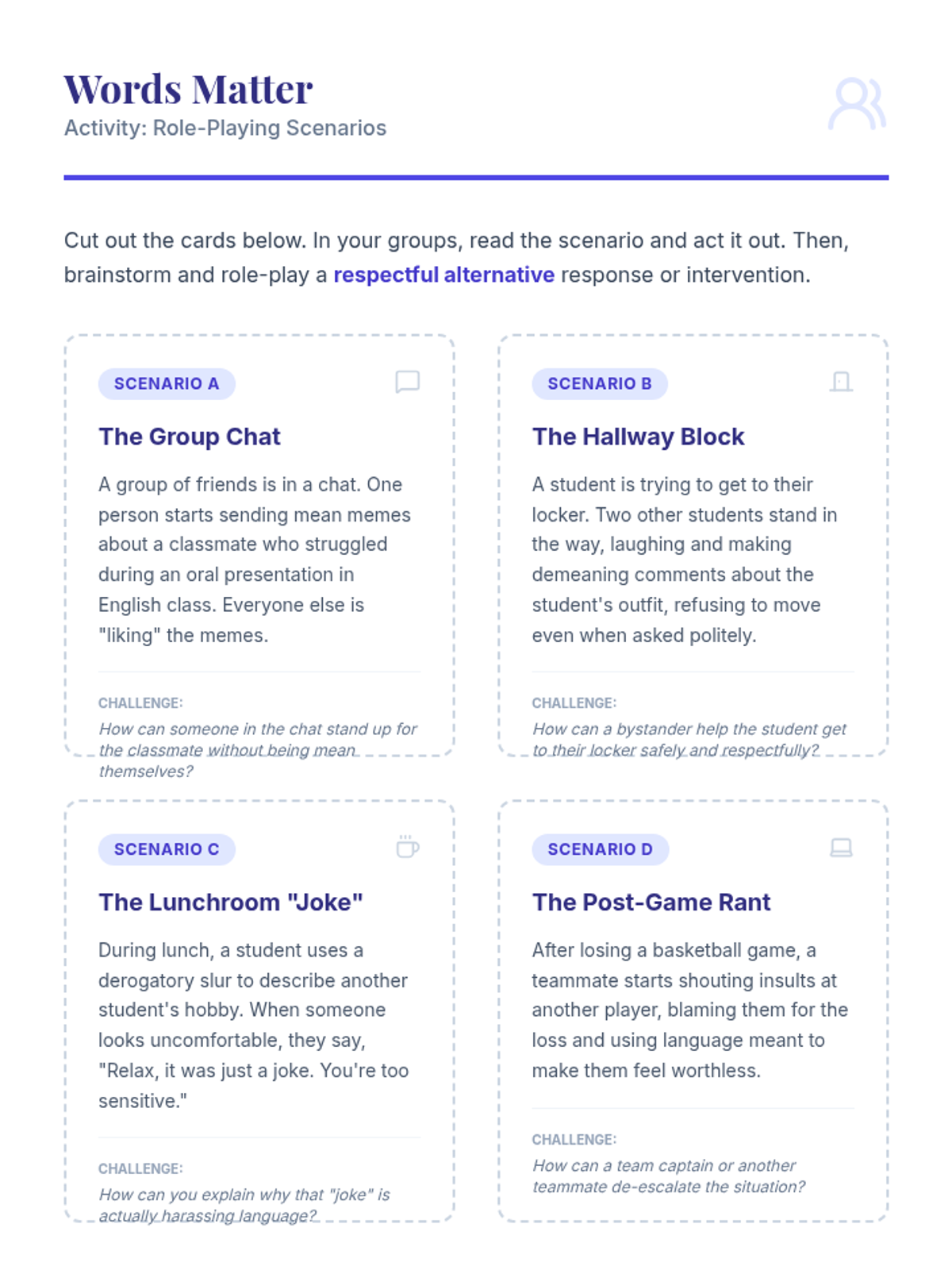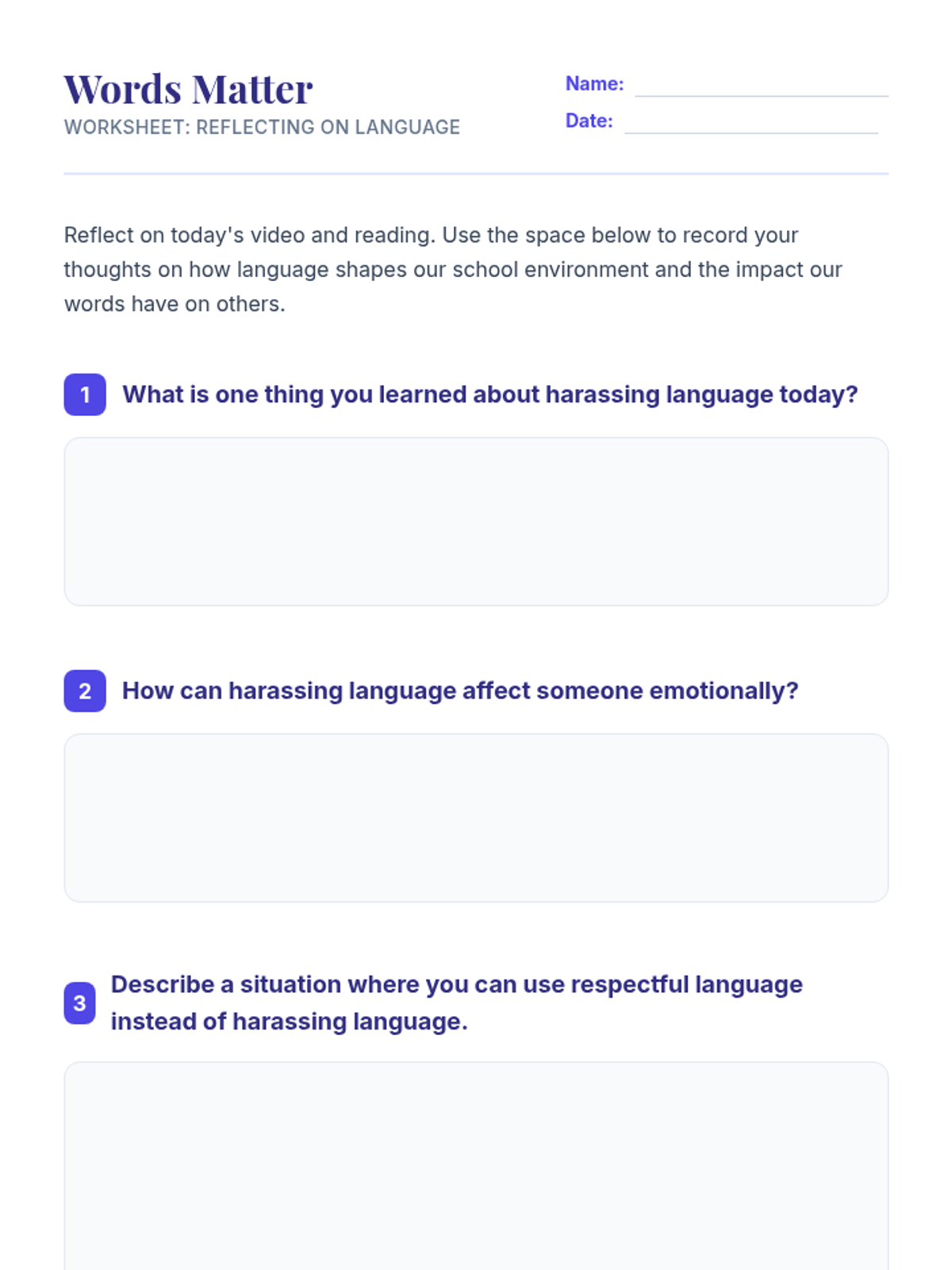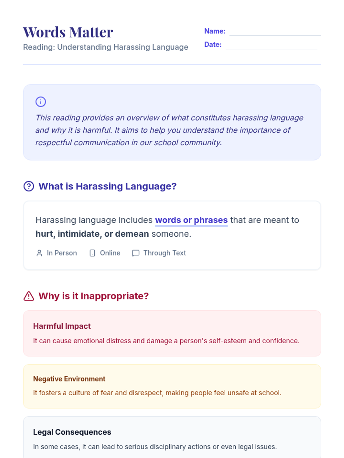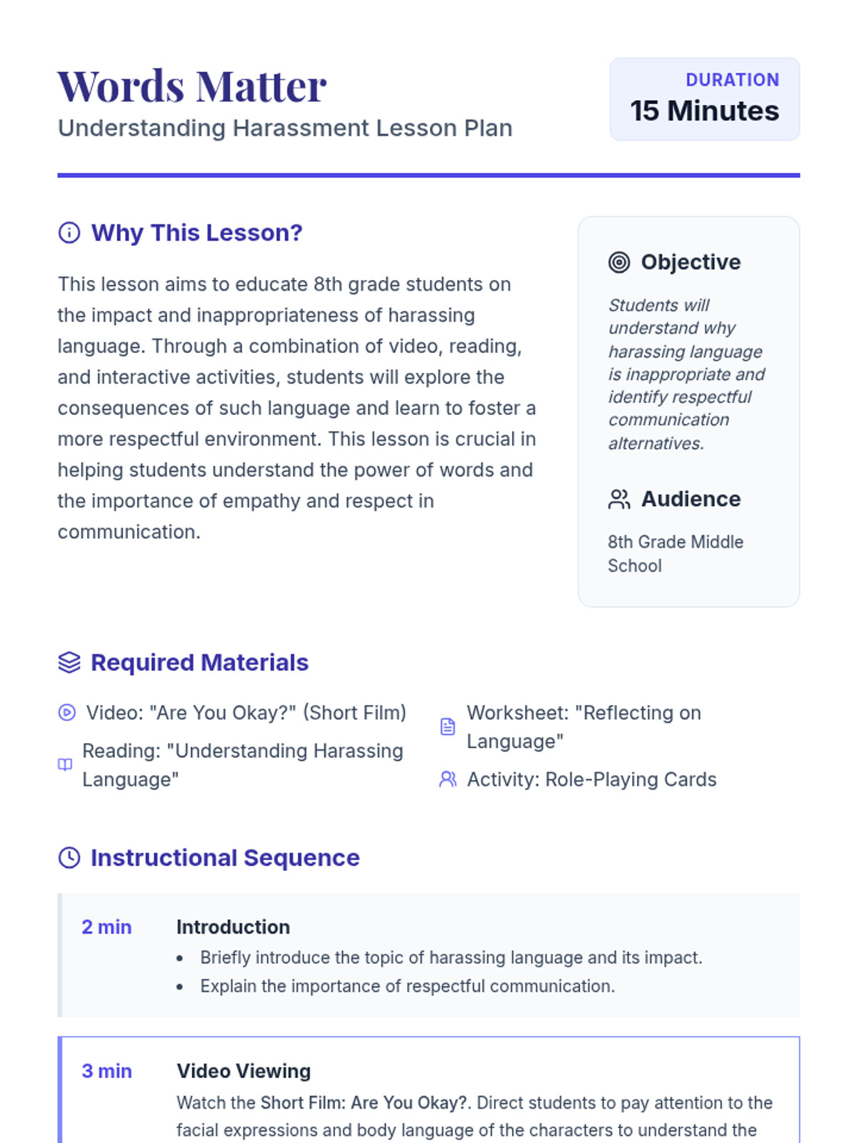 An 8th-grade lesson on identifying harassing language, understanding its emotional impact, and practicing respectful communication through video analysis and role-play.