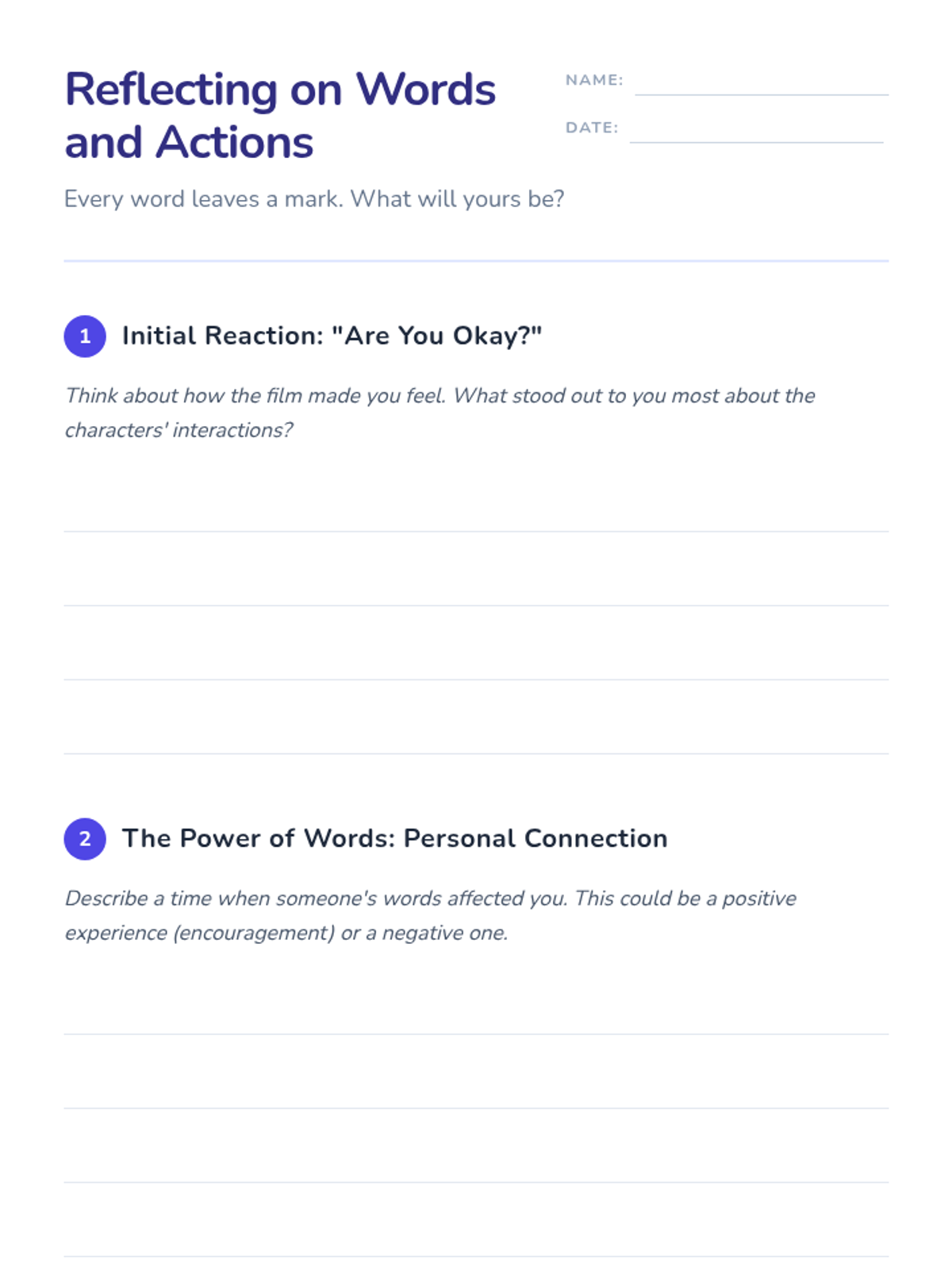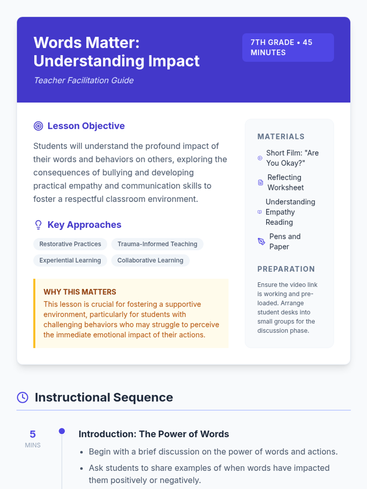 A 45-minute social-emotional learning lesson for 7th graders focused on the power of words, the impact of bullying, and developing empathy through video analysis and role-play.