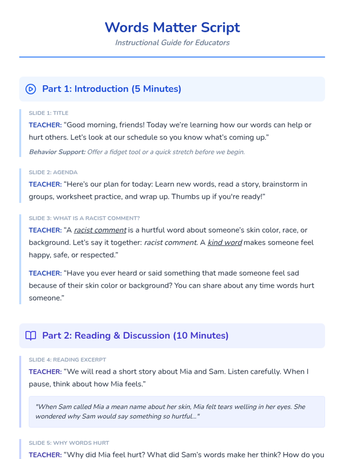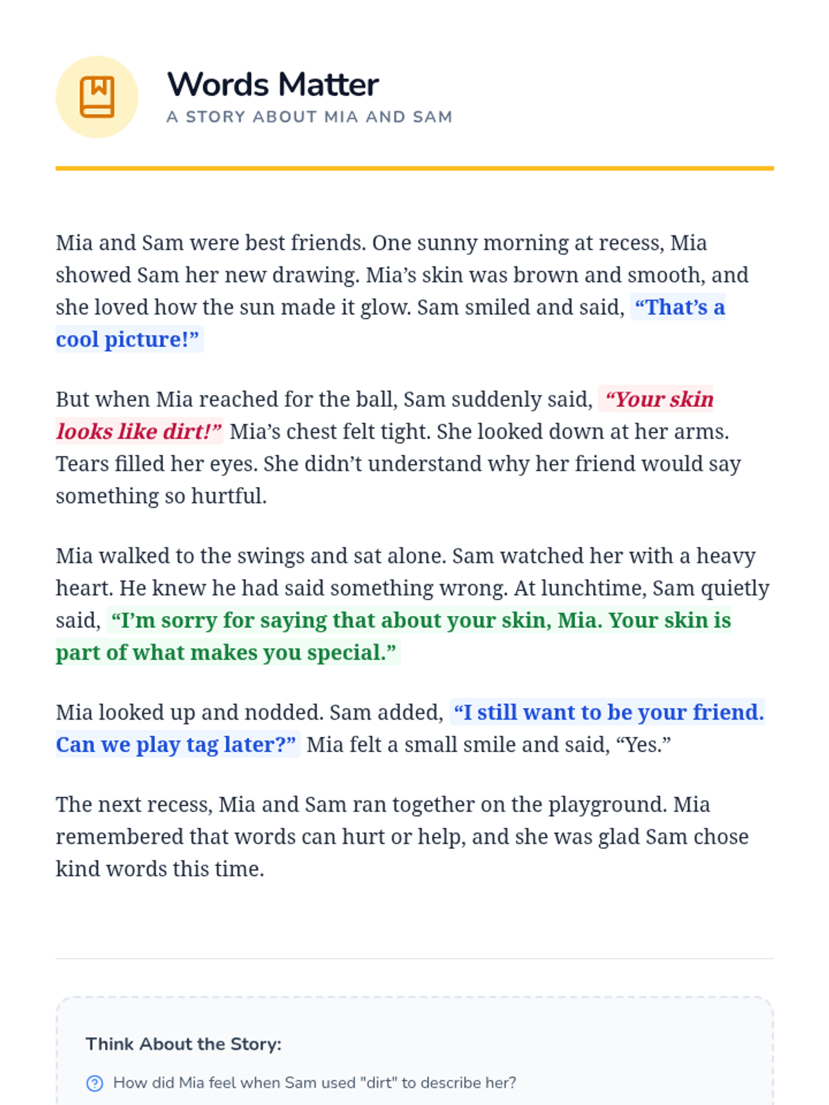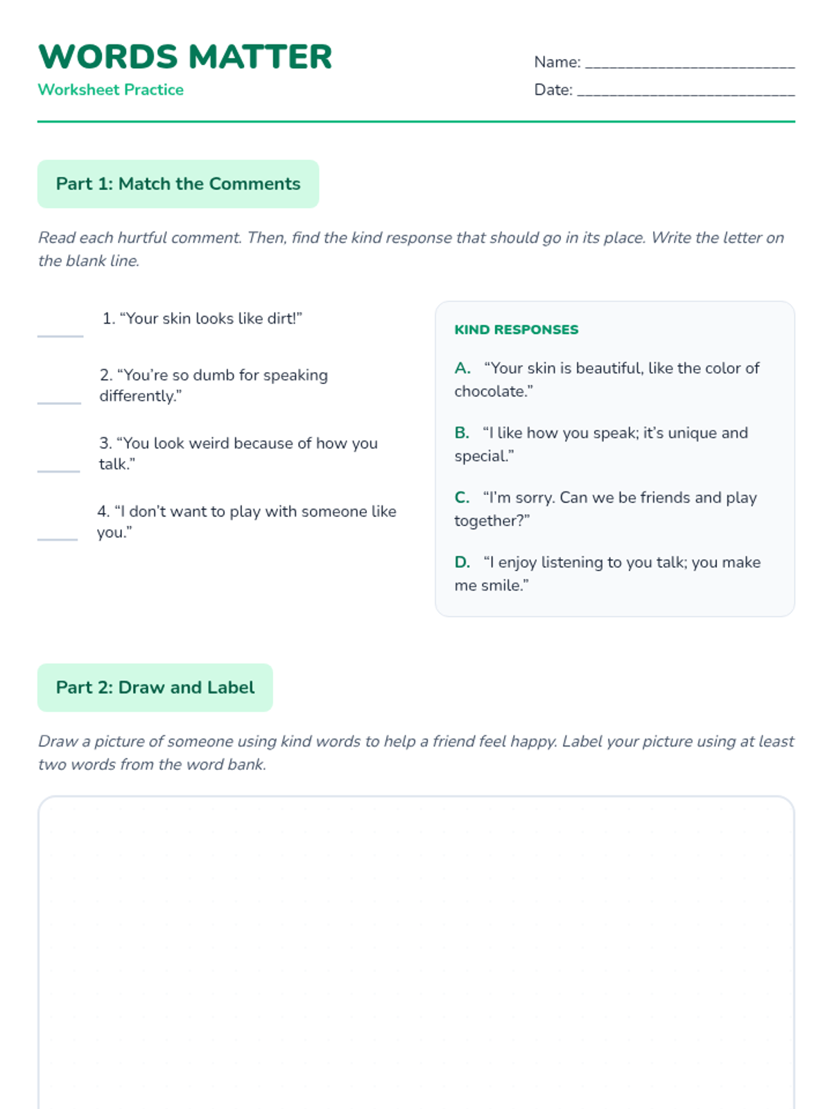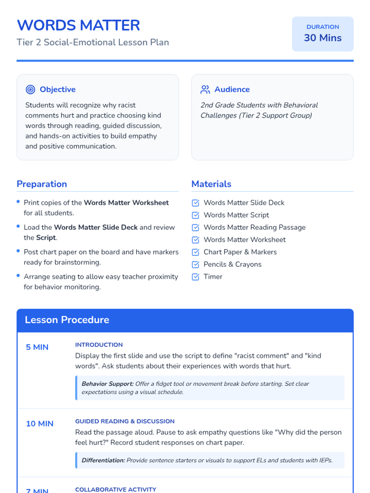 A 30-minute Tier 2 lesson for 2nd graders to help them recognize the impact of racist comments and practice using kind words to build empathy and positive communication.