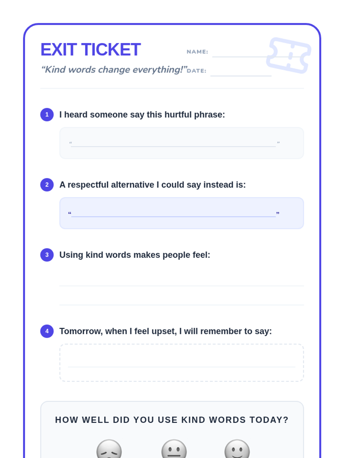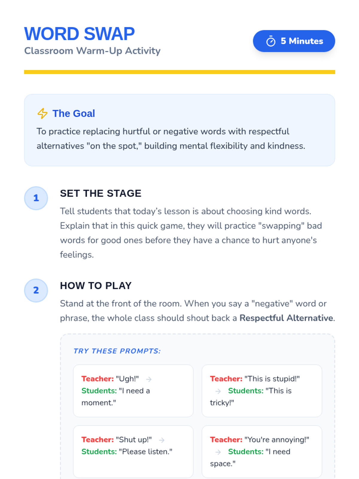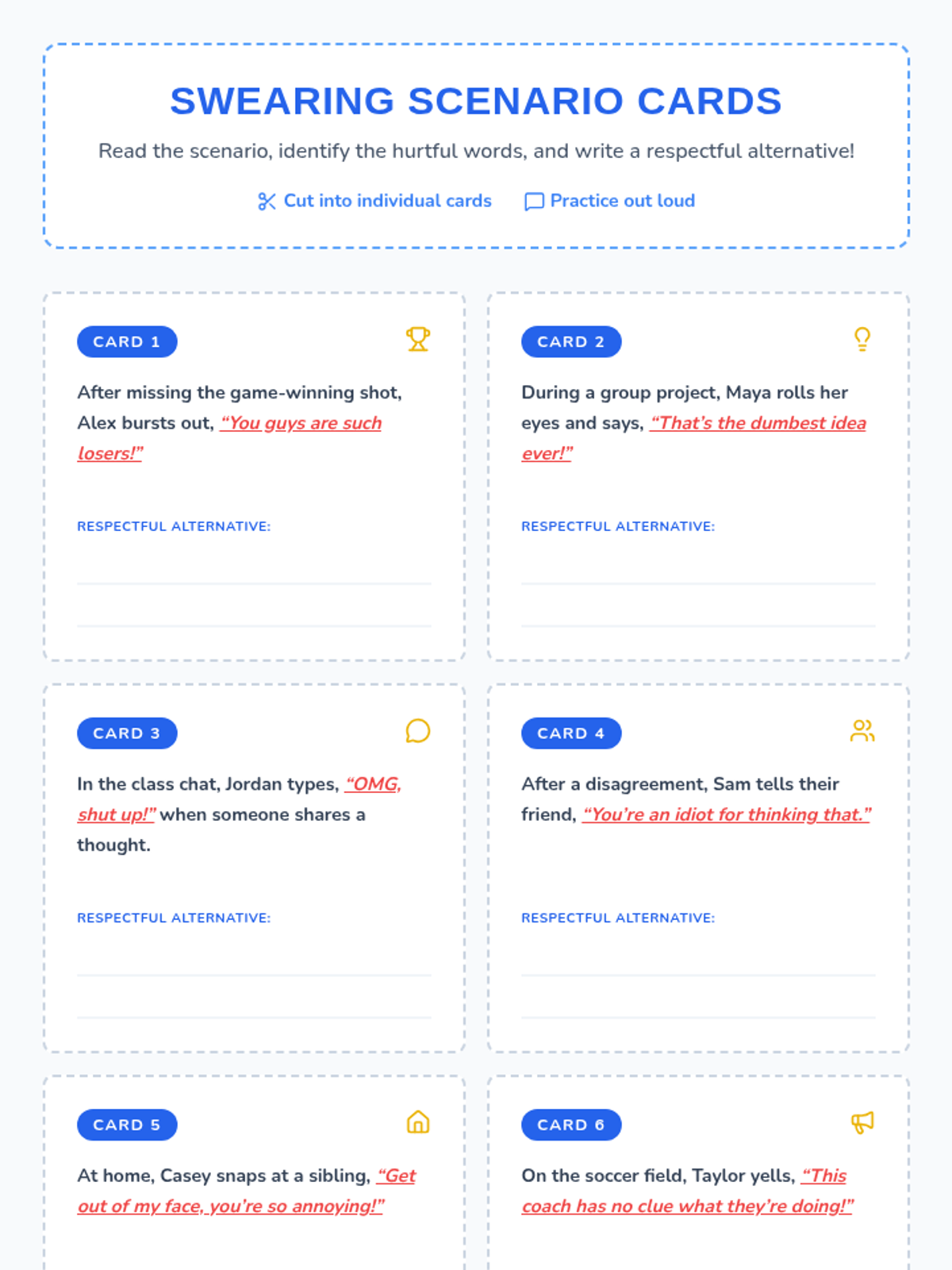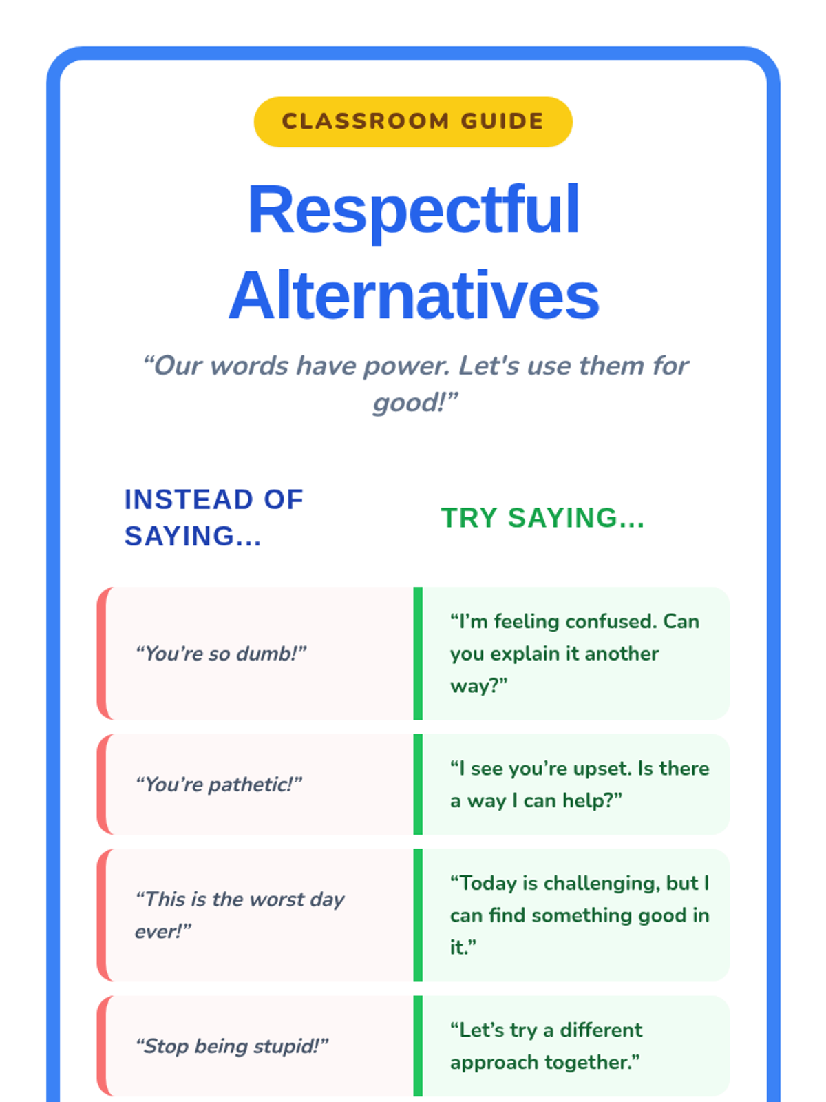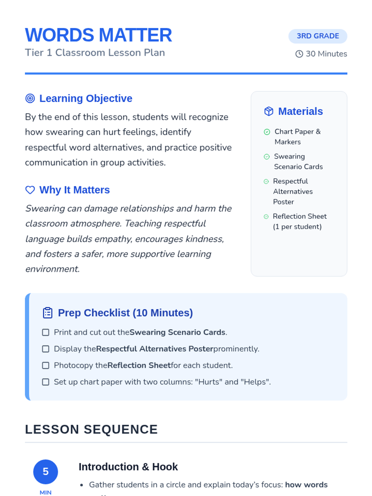 A 30-minute Tier 1 lesson for 3rd graders focused on exploring the impact of language, understanding why swearing can be hurtful, and learning respectful alternatives to build a supportive classroom culture.