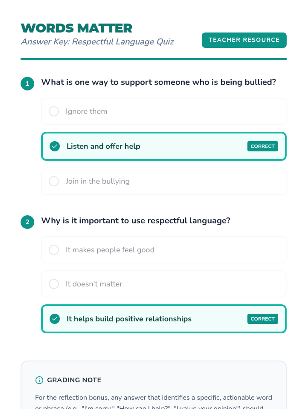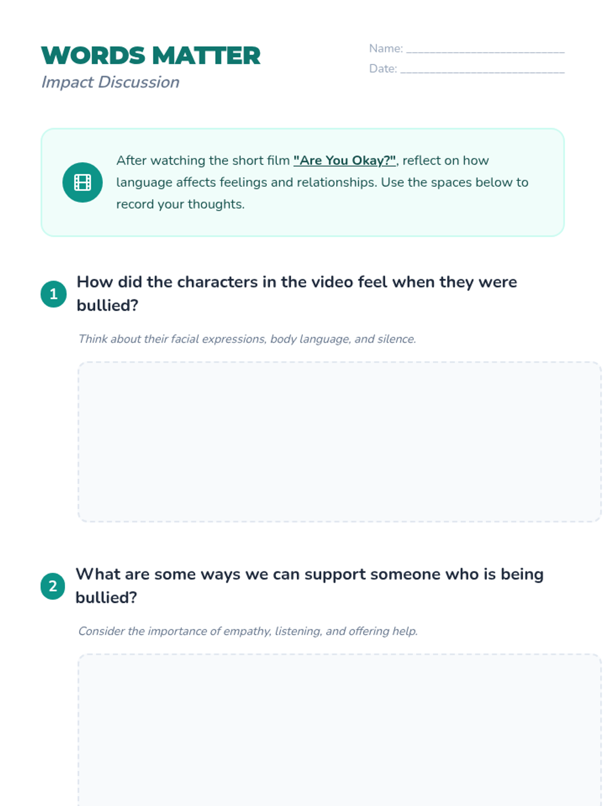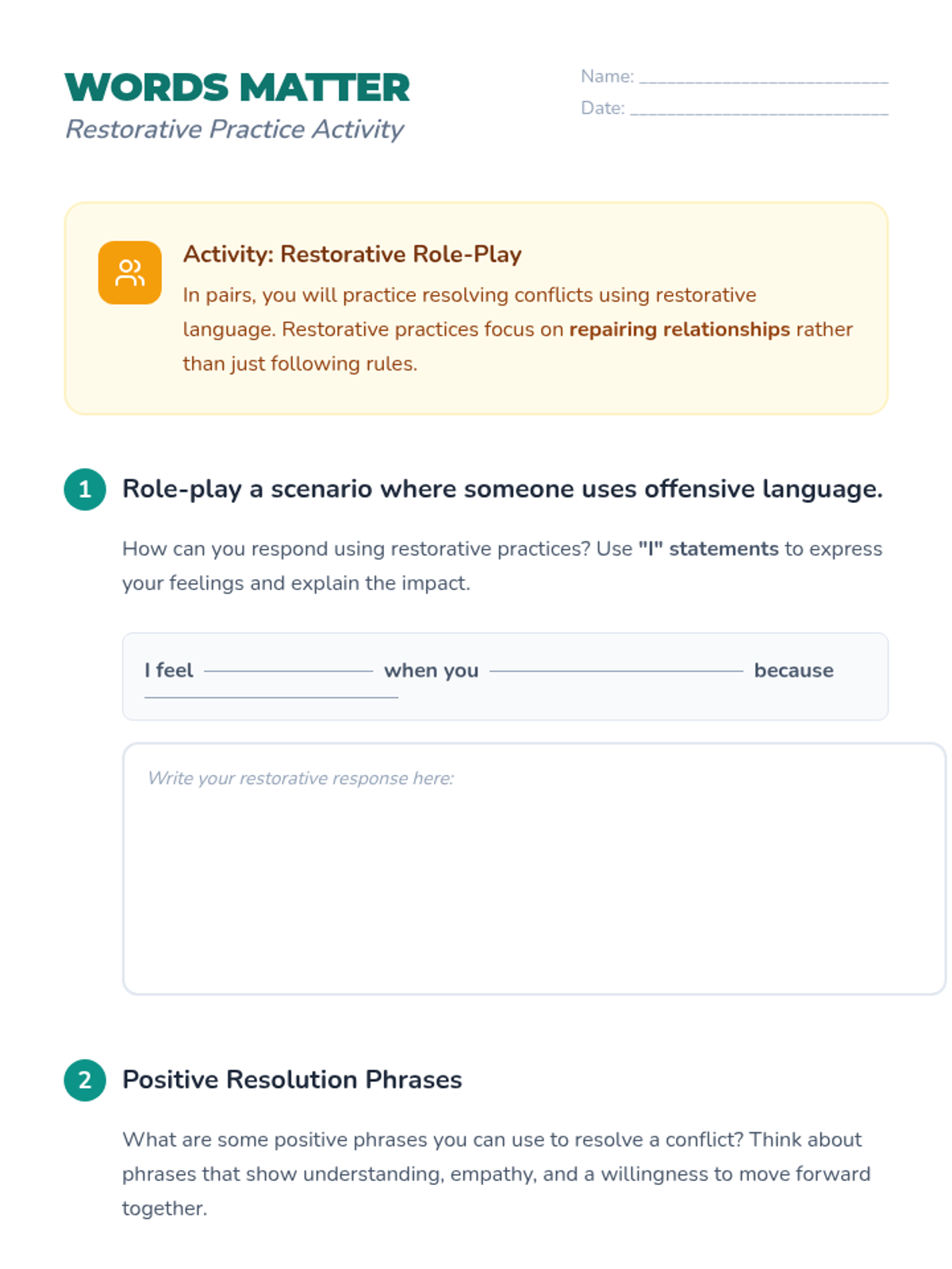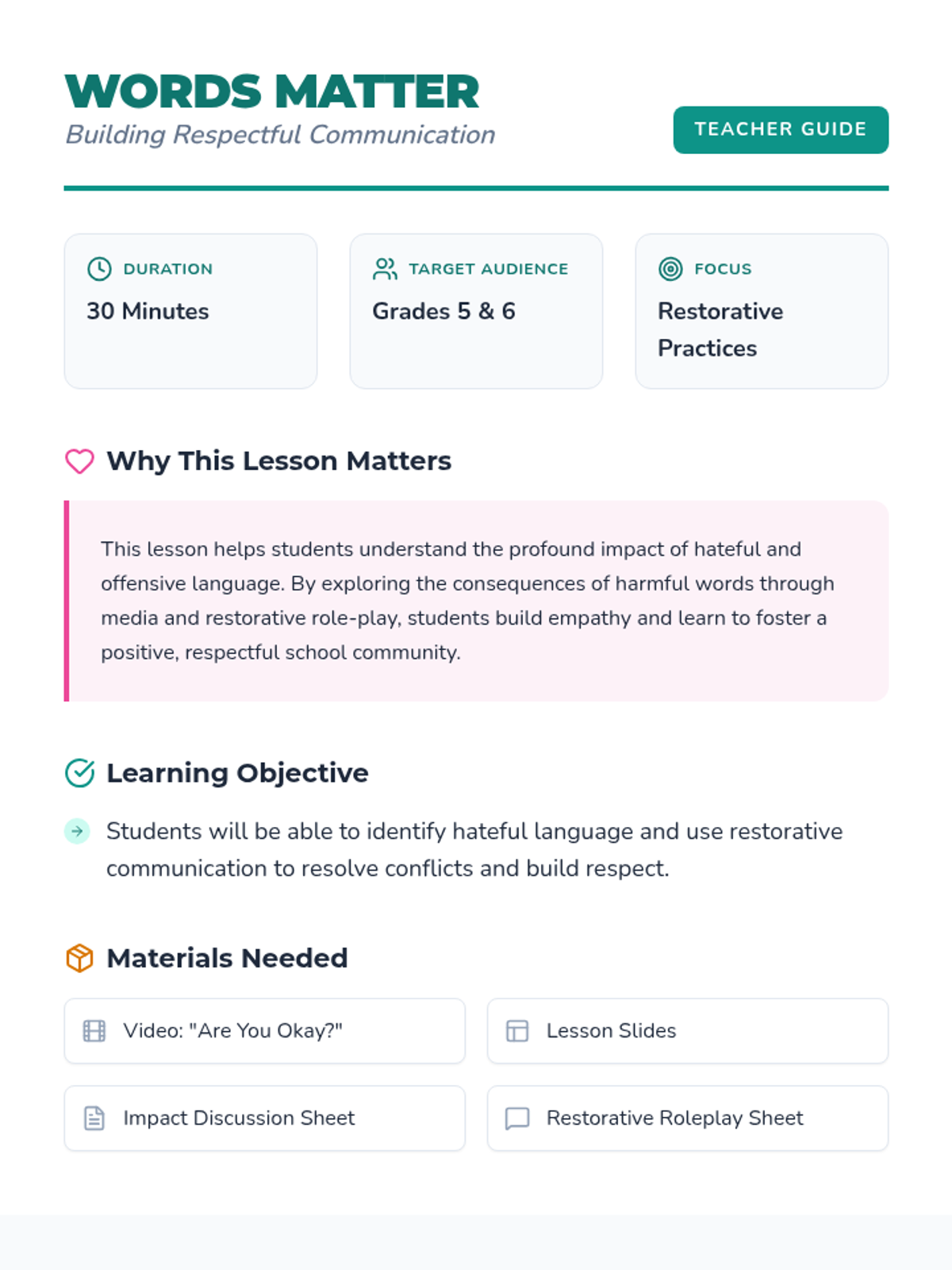 A 30-minute lesson for grades 5-6 exploring the impact of hateful language through a short film and restorative role-play. Students will practice empathy and restorative communication to build a more respectful school community.