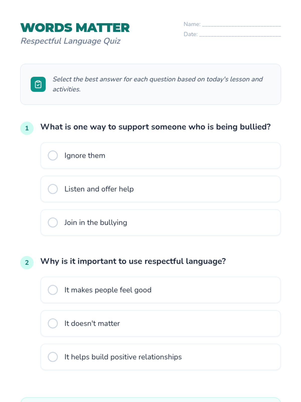 A lesson focused on the art of starting and sustaining conversations using respectful compliments and active listening. Students will engage in a 'Compliment Bingo' game and practice social dynamics through structured and open-ended role-plays.
