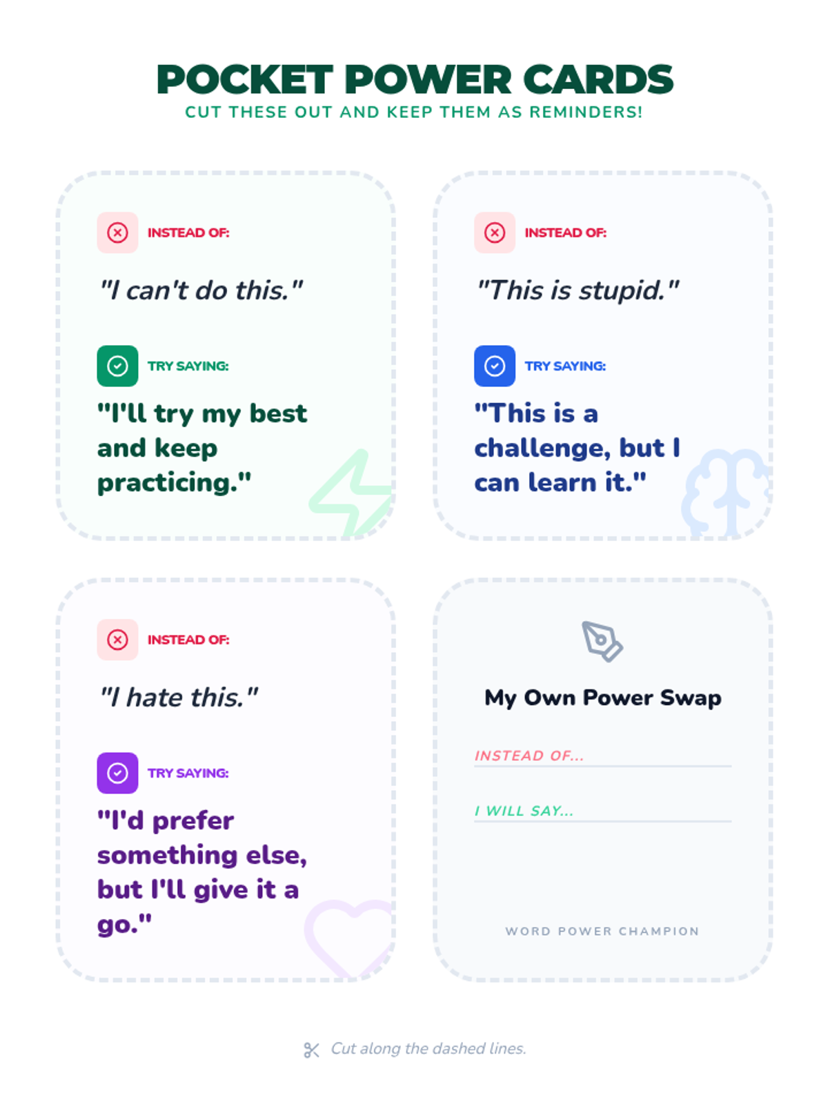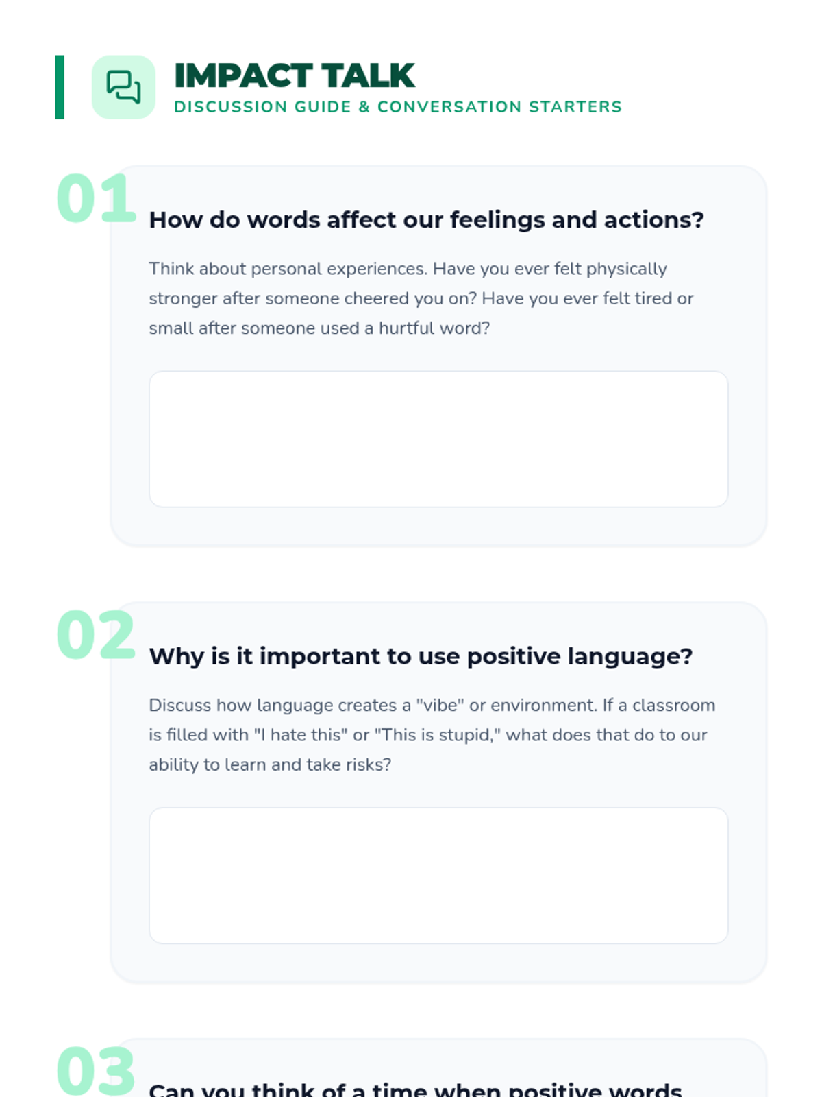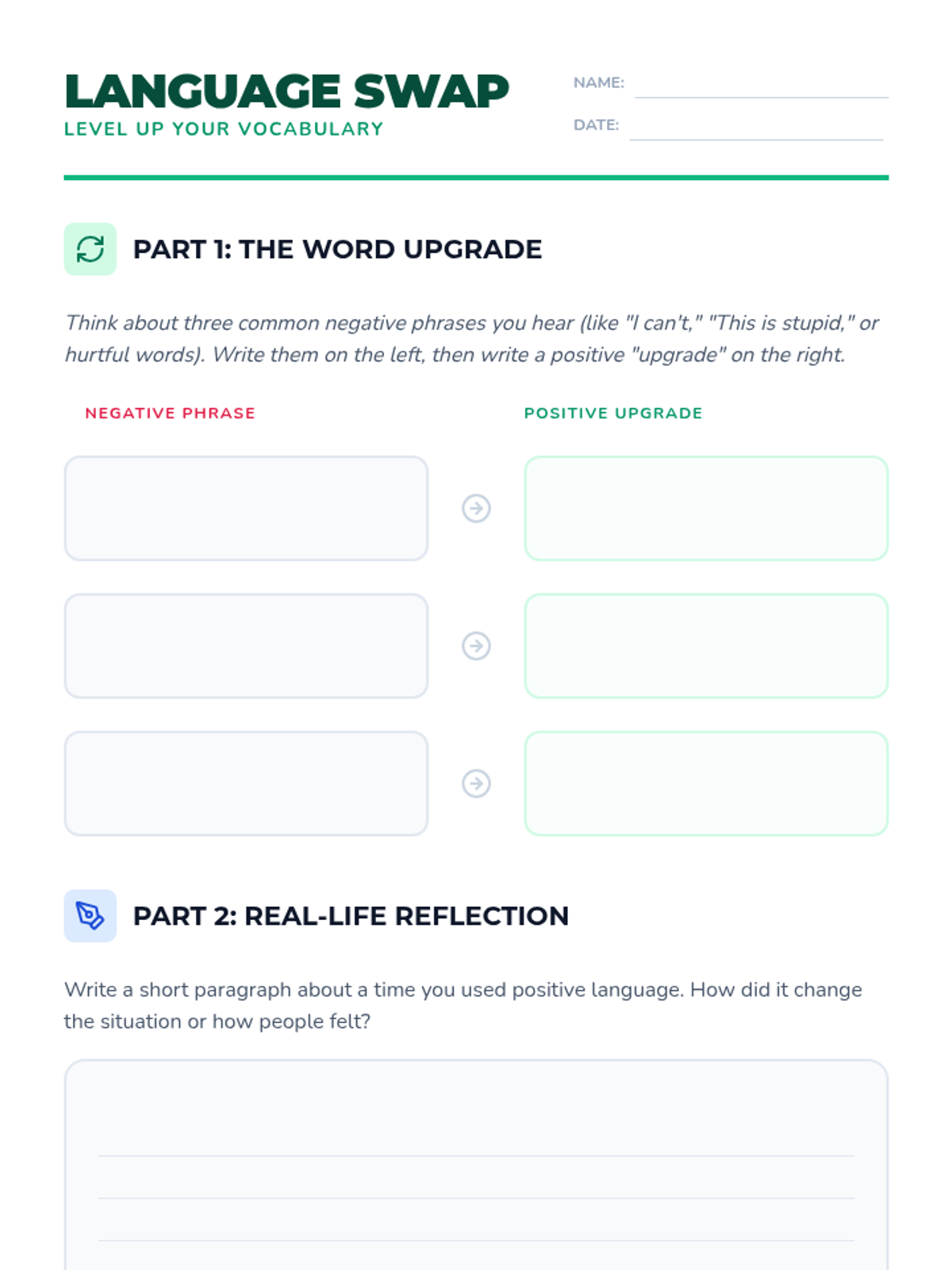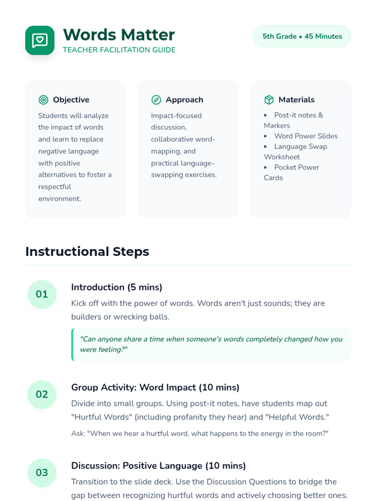Students explore the impact of words on feelings and environments, practicing how to swap negative language and profanity for positive, constructive alternatives.