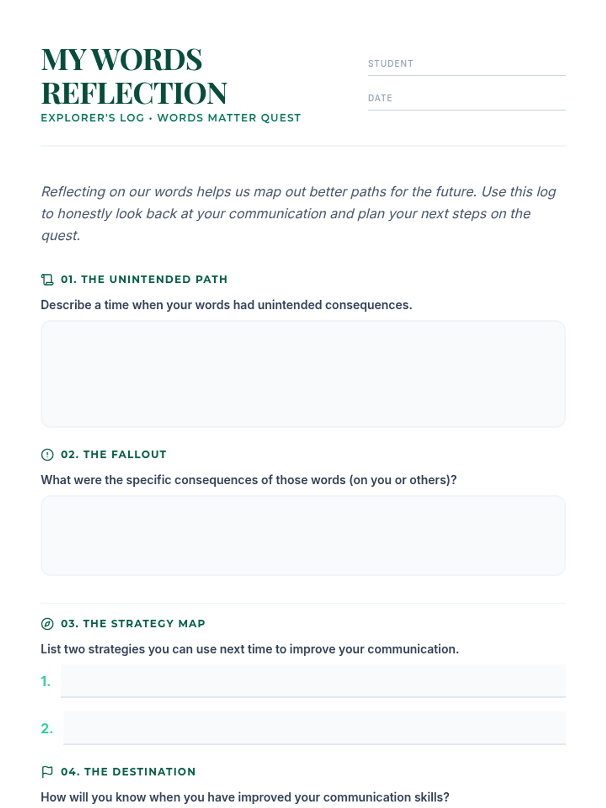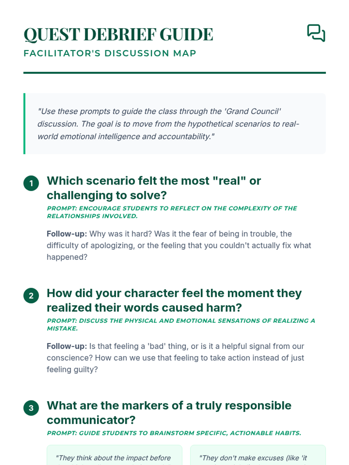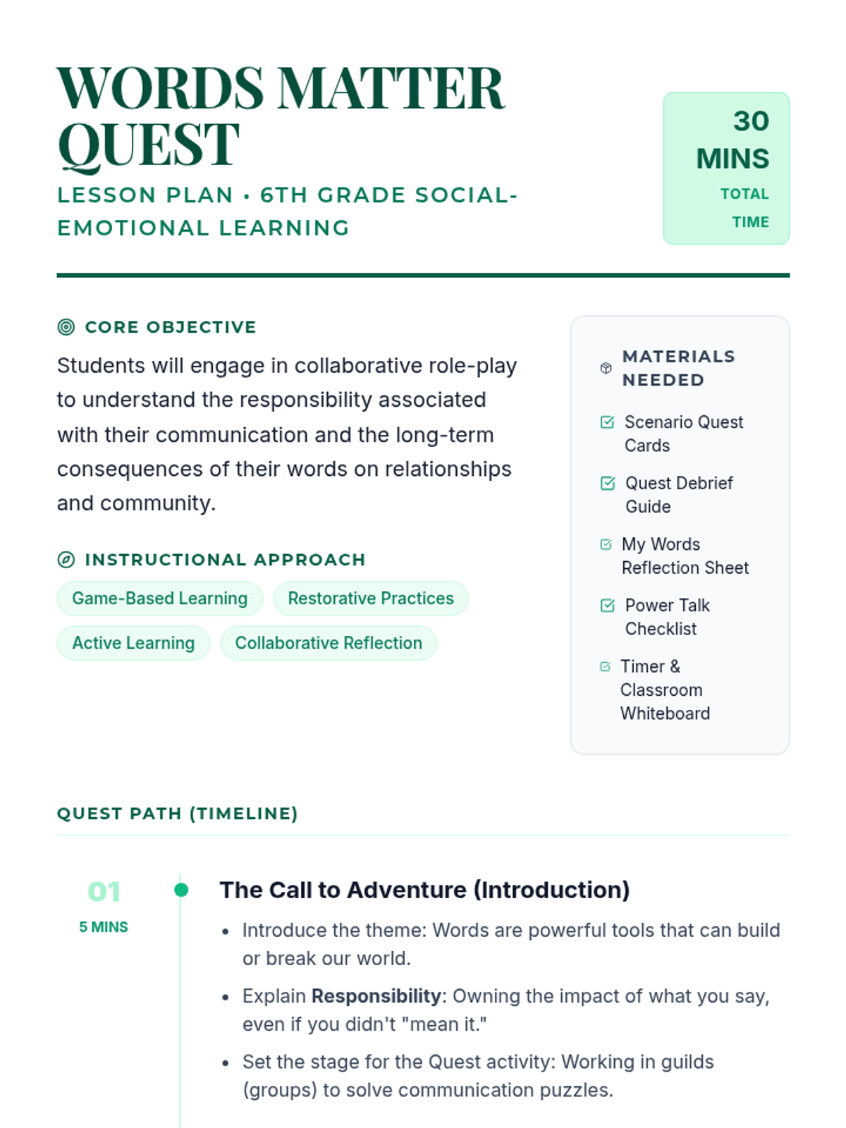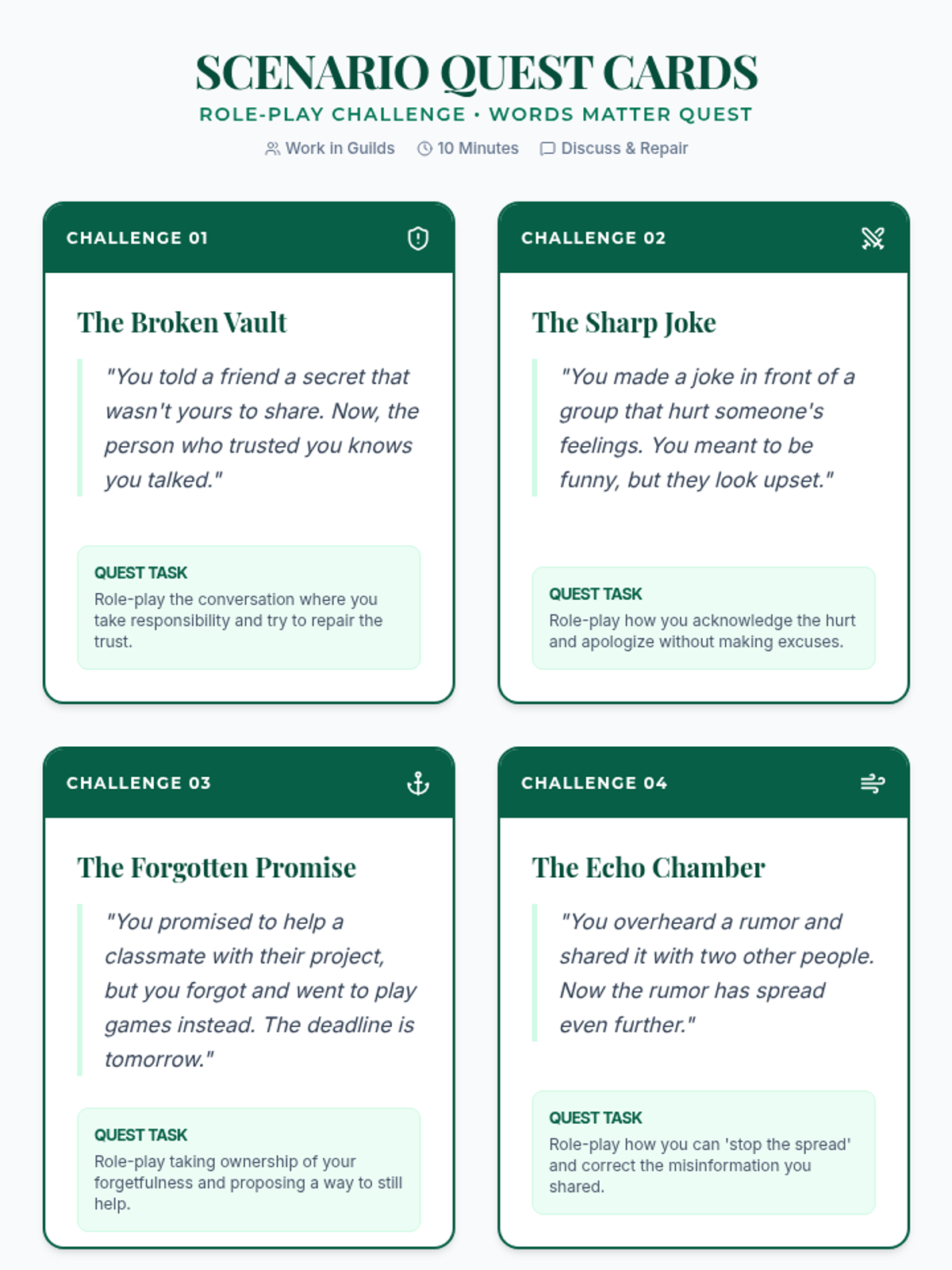 A collaborative game-based lesson for 6th graders to explore the impact of their words and practice responsible communication through scenario-based role-play and reflection.
