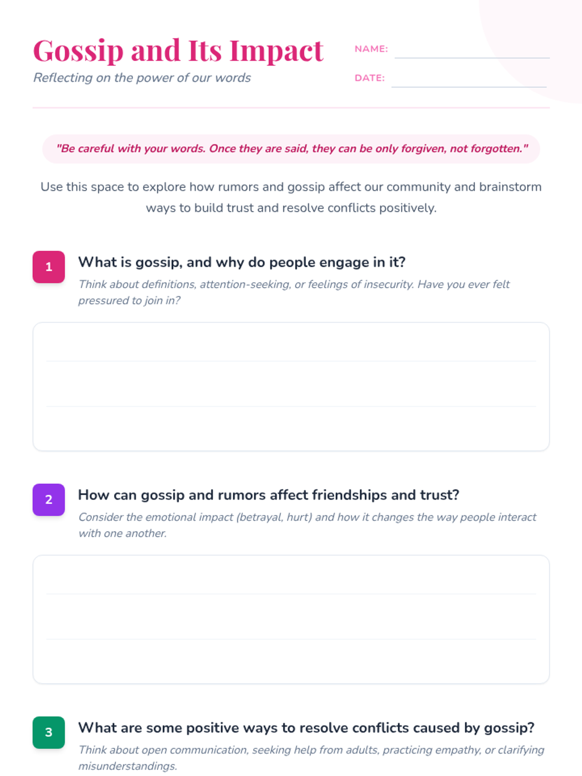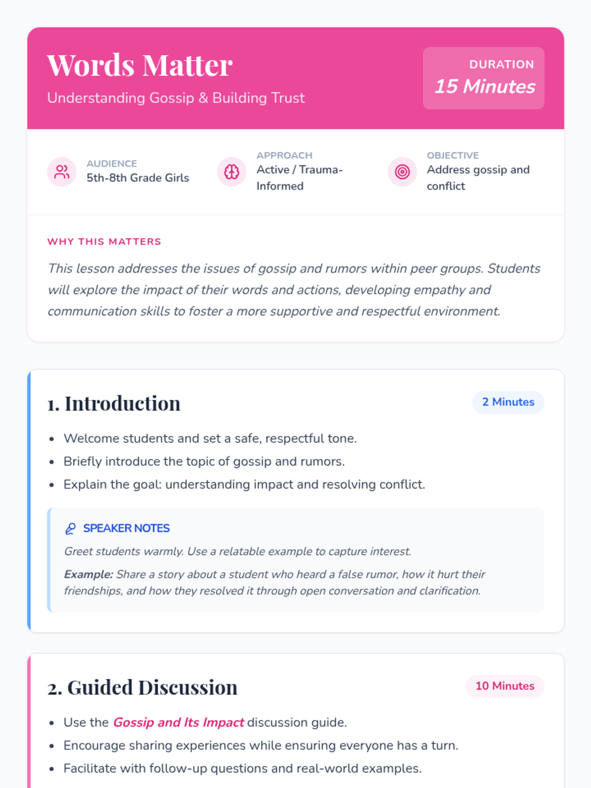 A 15-minute interactive lesson for 5th-8th grade girls exploring the impact of gossip and rumors, focusing on empathy, trust, and conflict resolution strategies.