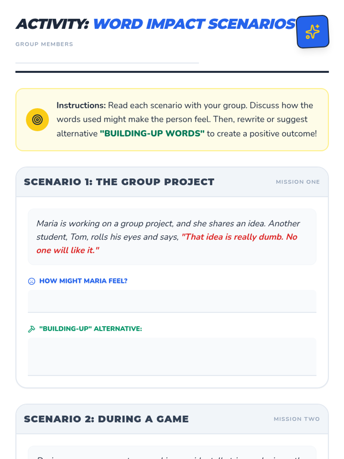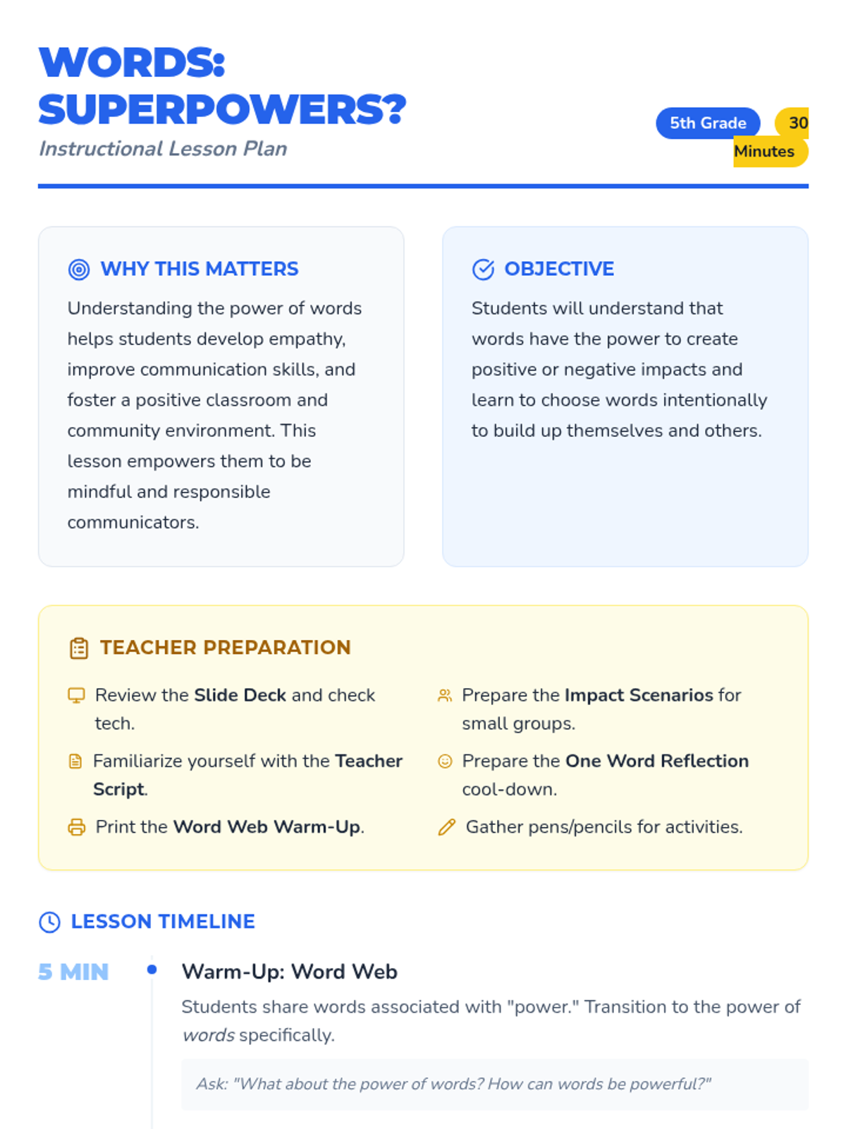 An engaging 30-minute lesson for 5th-grade students exploring the power of words to build up or tear down, fostering empathy and intentional communication.