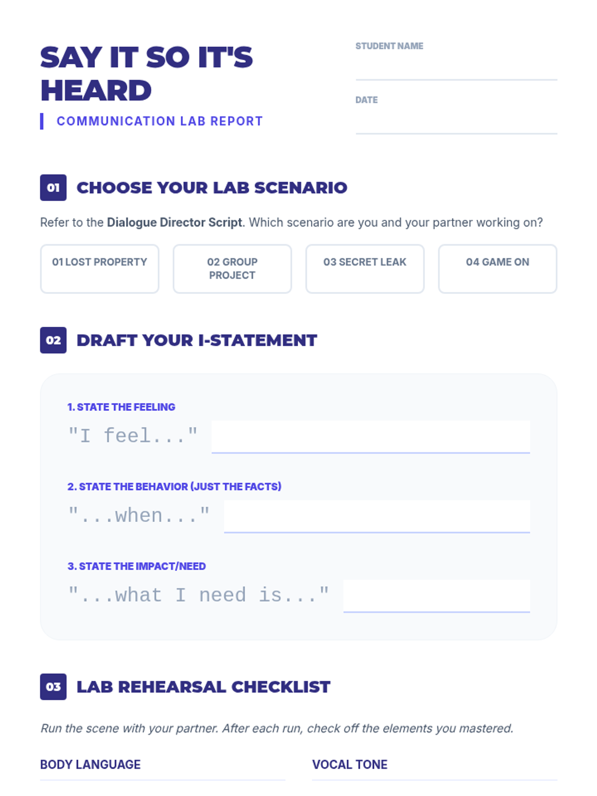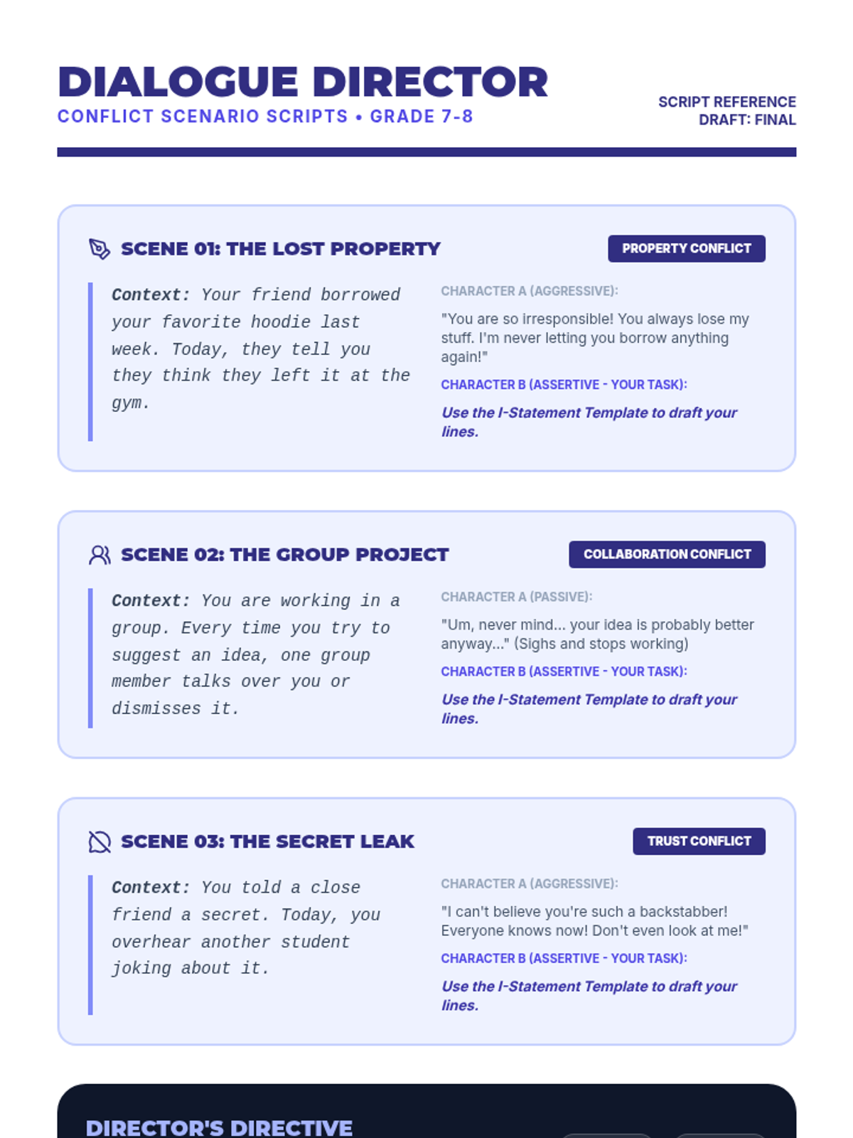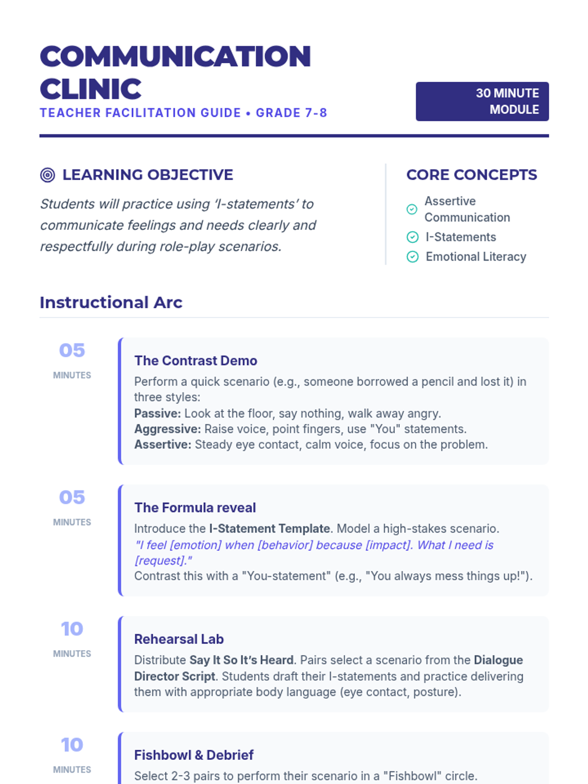 A 30-minute interactive lesson for middle schoolers to master assertive communication using I-statements through role-play and modeling.