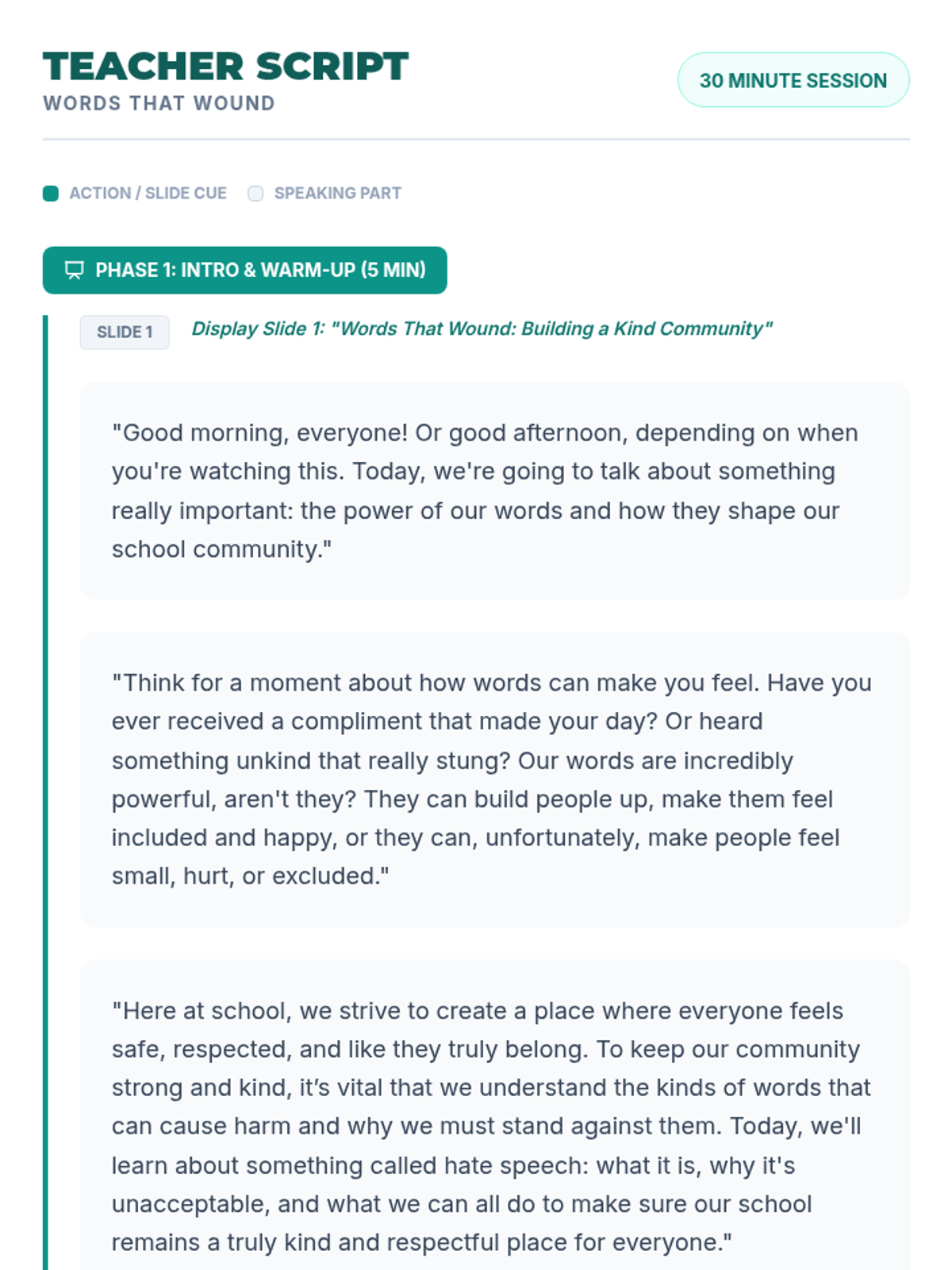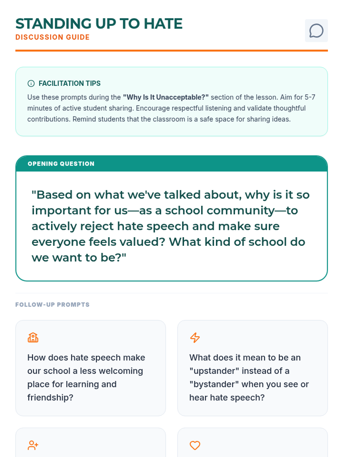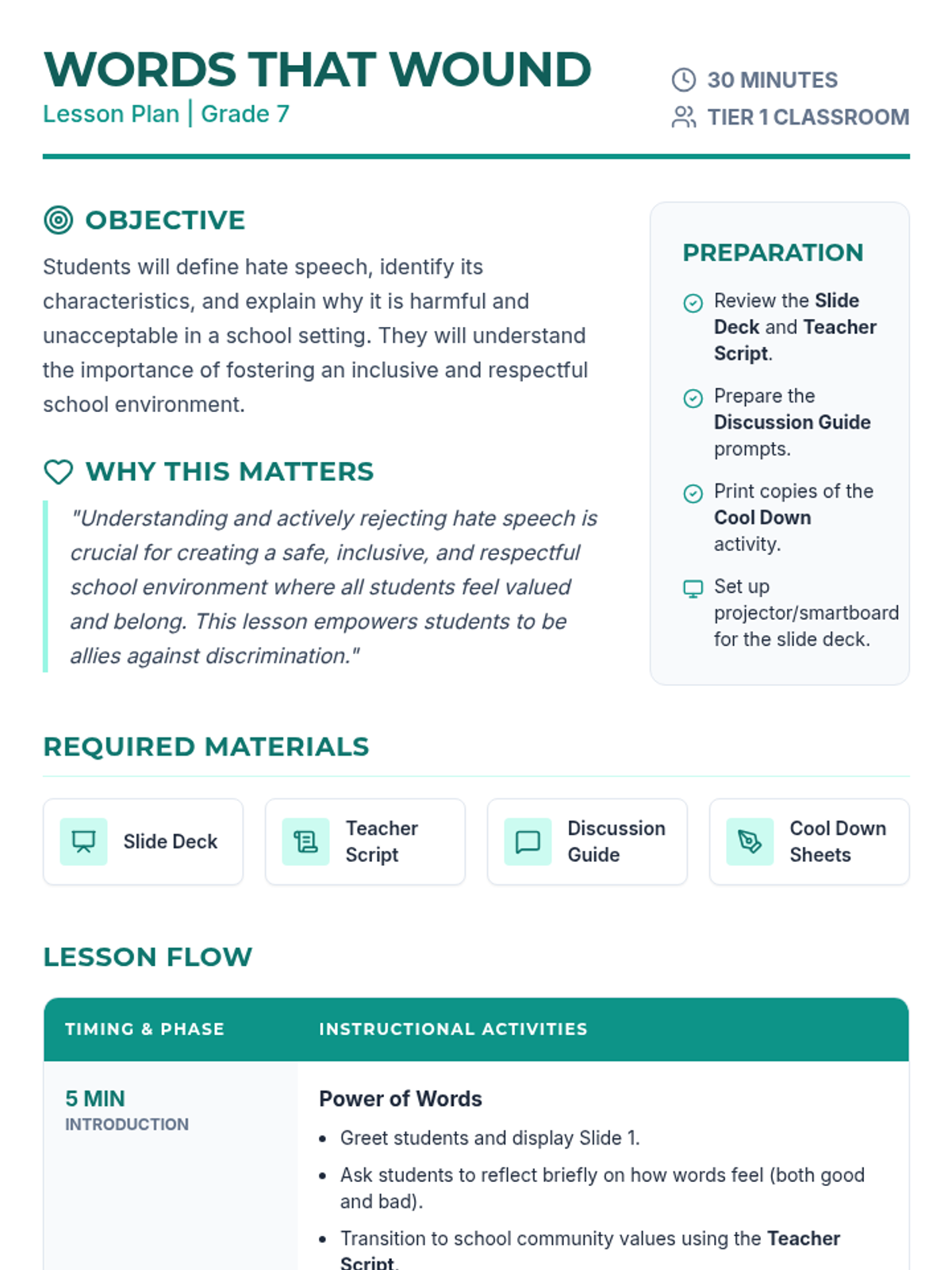 A single-session 30-minute lesson for 7th graders that defines hate speech, identifies its impact, and empowers students to foster a respectful and inclusive school environment.