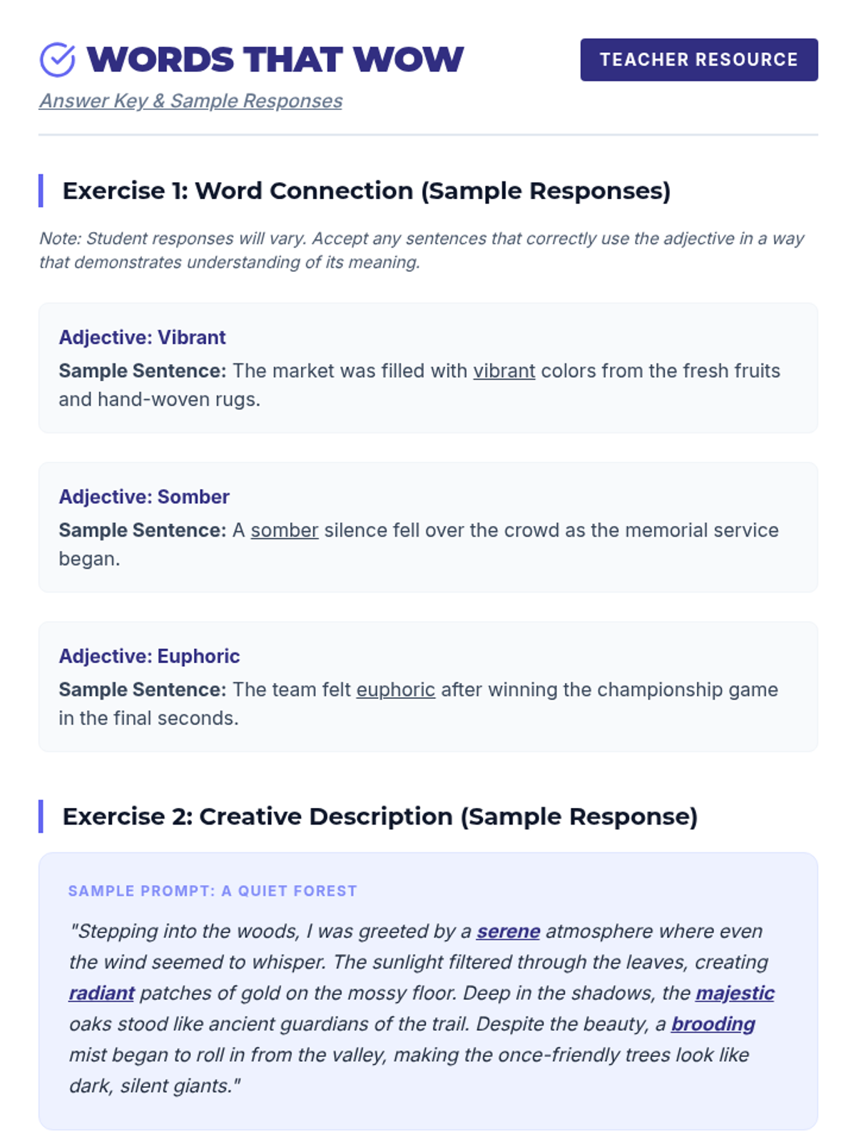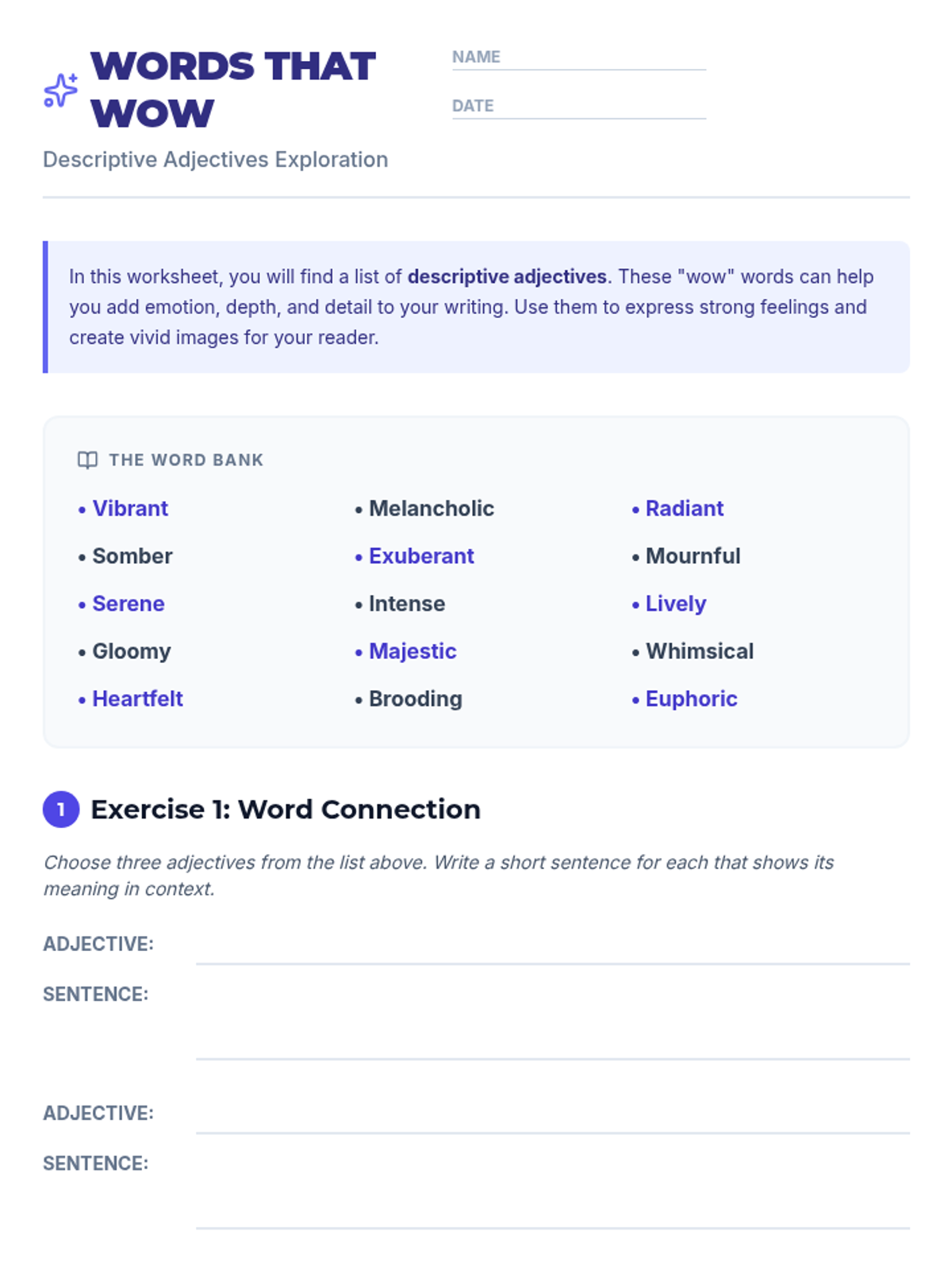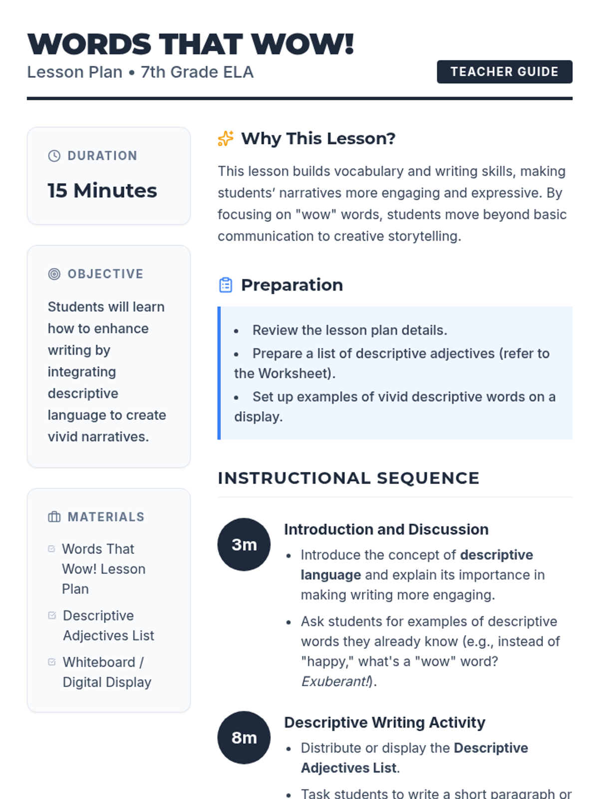 A 15-minute introductory session focused on using vivid descriptive adjectives to enhance narrative writing and create 'wow' moments for the reader.