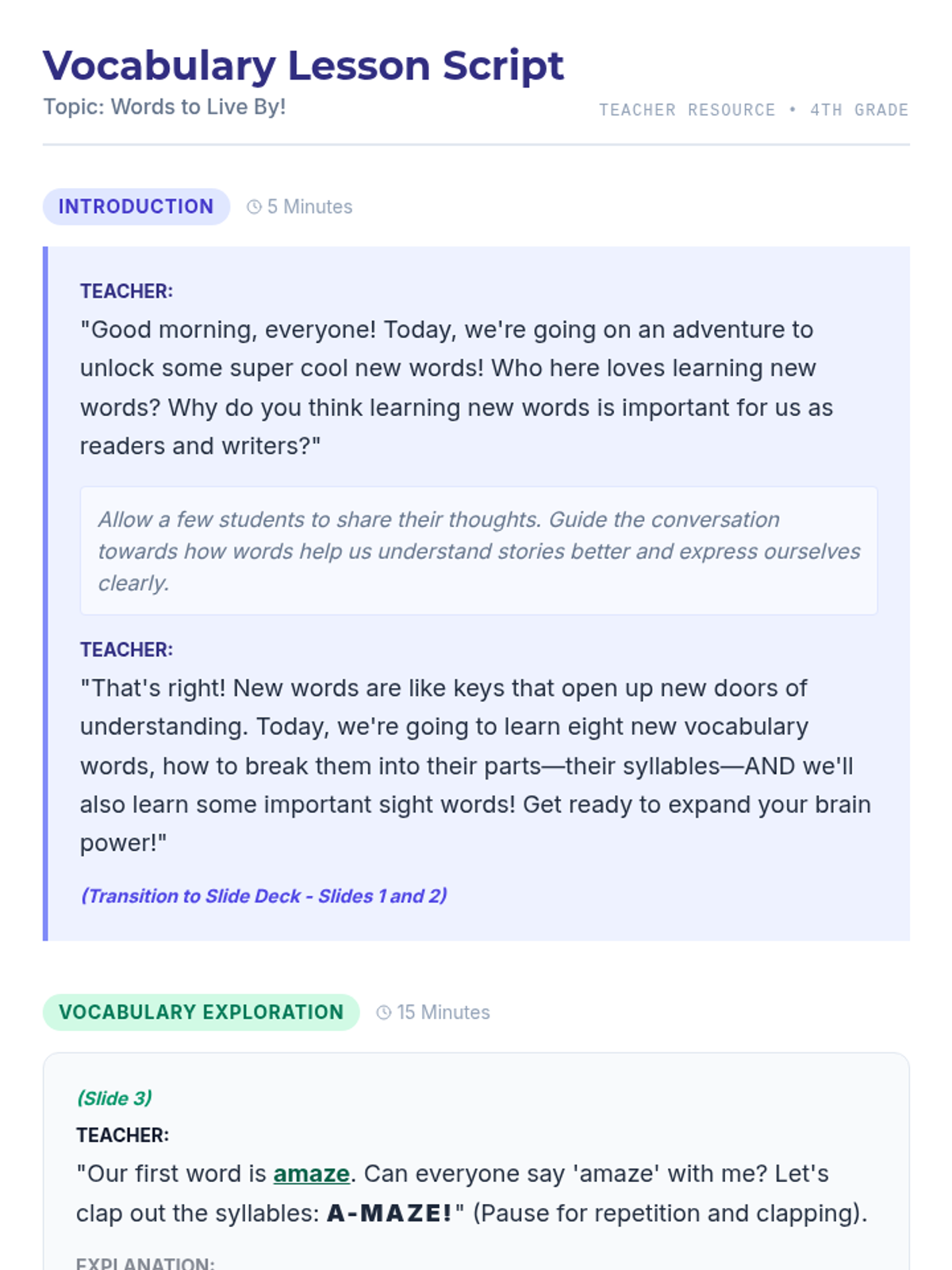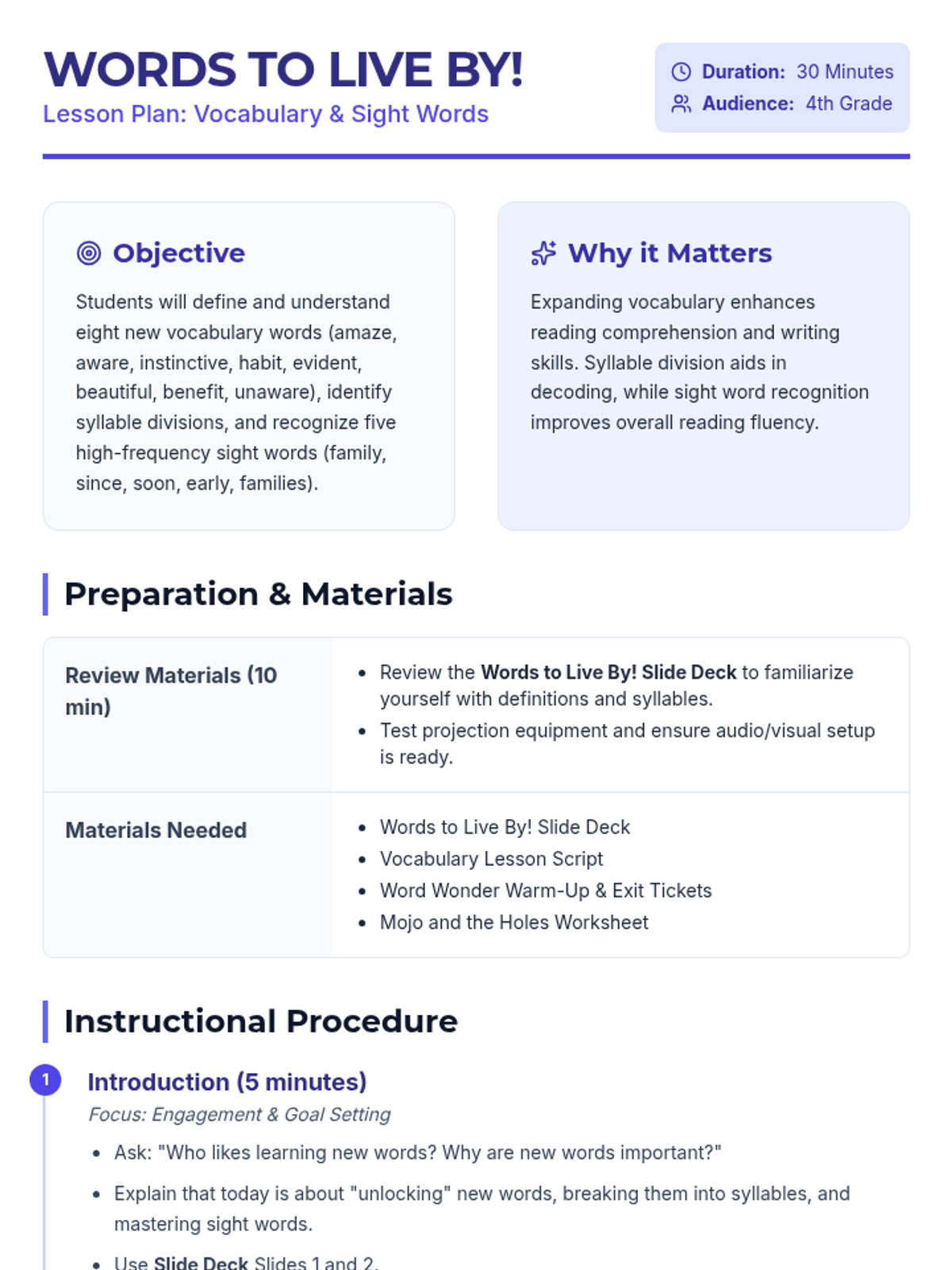 This lesson introduces 4th-grade students to eight new vocabulary words and five sight words, focusing on syllable division, definitions, and practical usage through direct instruction and engaging activities.