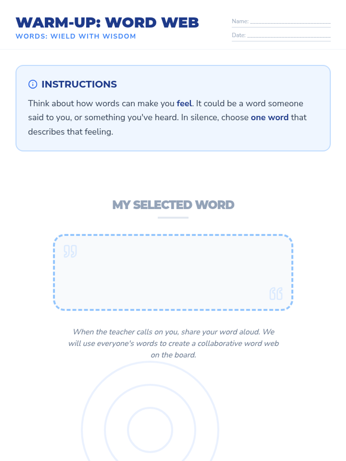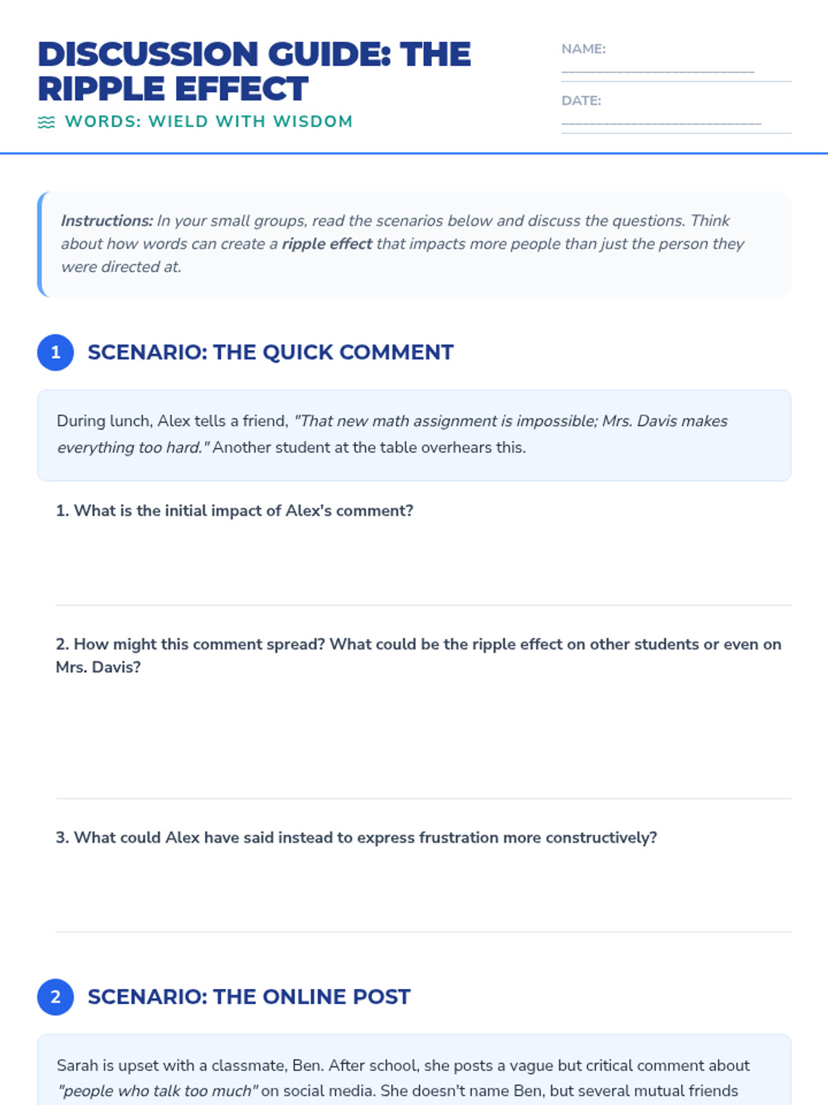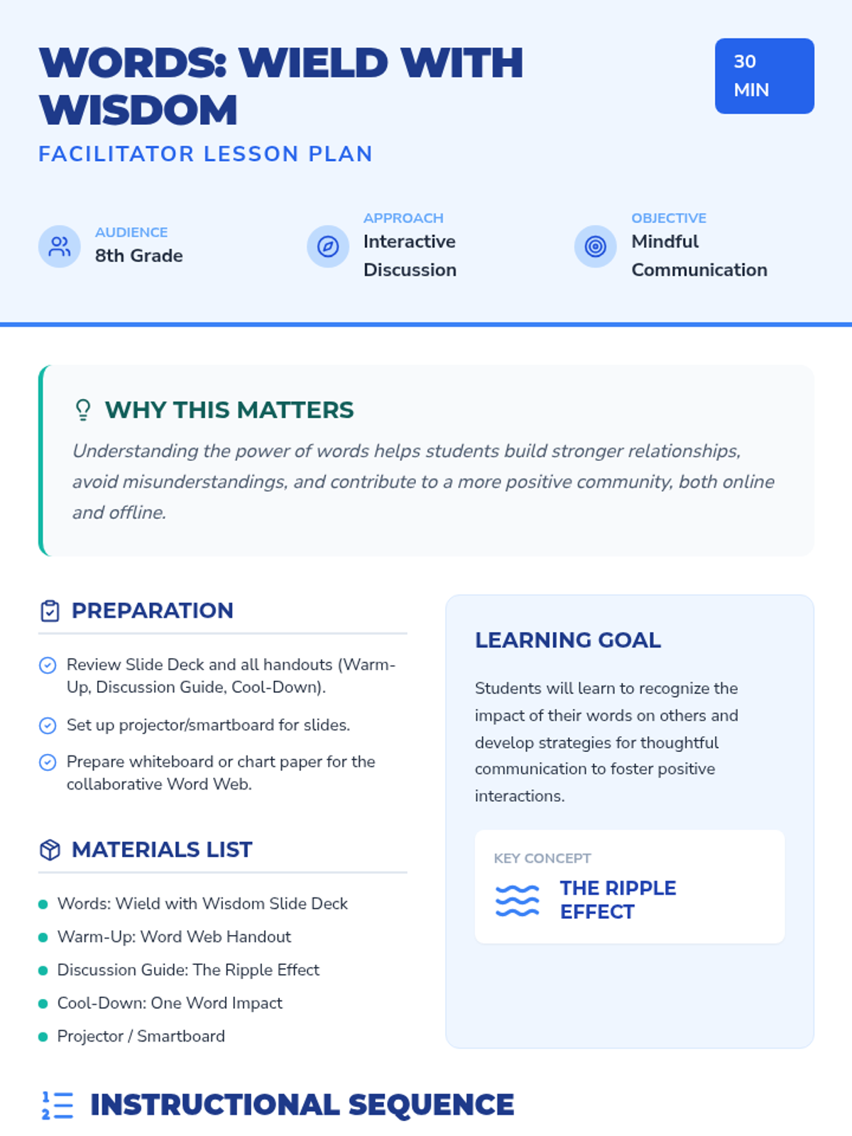 A 30-minute lesson for 8th graders exploring the impact of language and strategies for mindful communication through the concept of the 'Ripple Effect'.