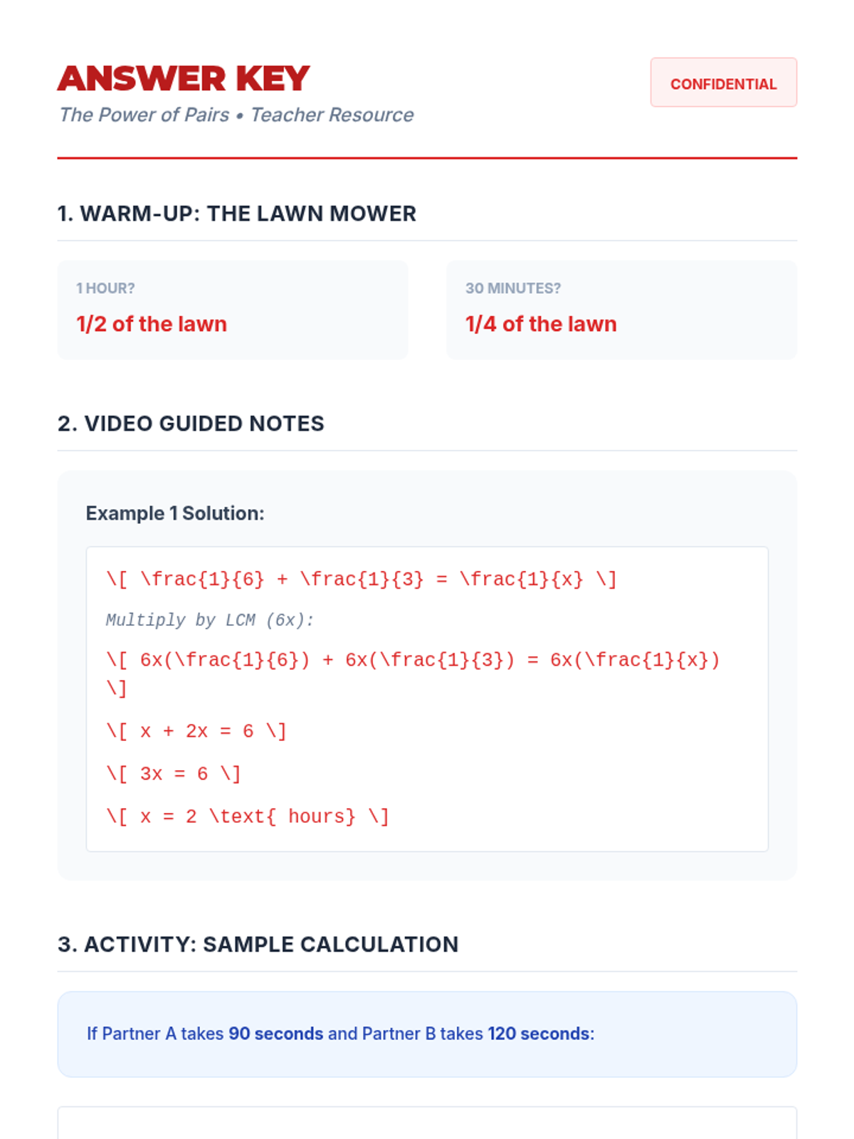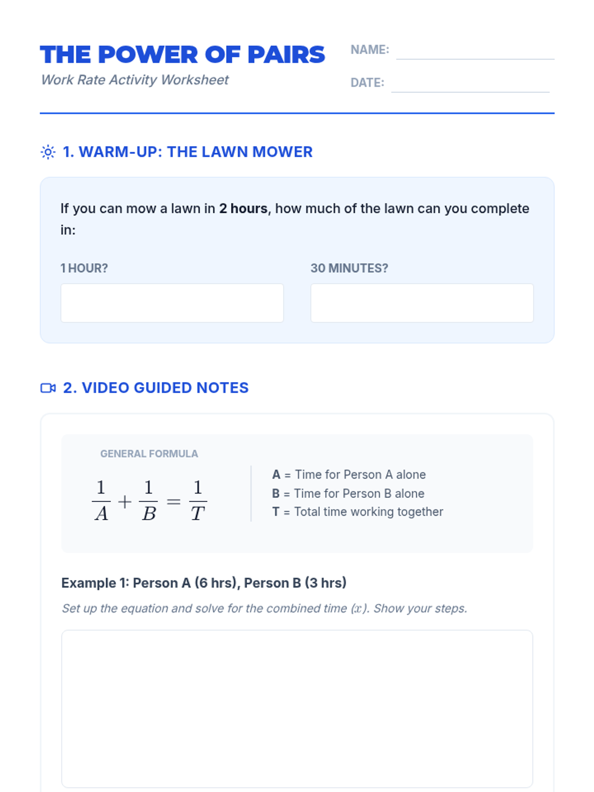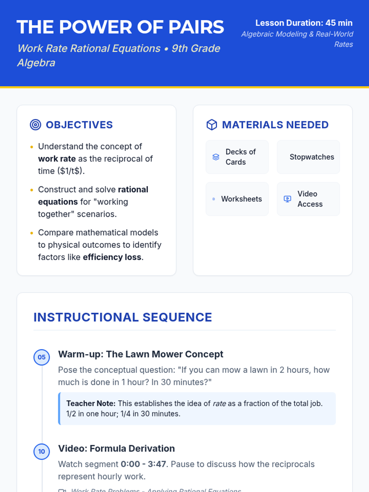 A lesson focused on work rate problems where students derive the work rate formula, watch a video demonstration, and conduct a hands-on activity with playing cards to compare mathematical predictions with real-world results.