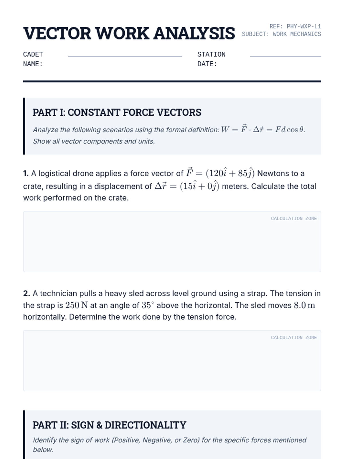 Differentiate between constant and variable forces using dot products and graphical area analysis.