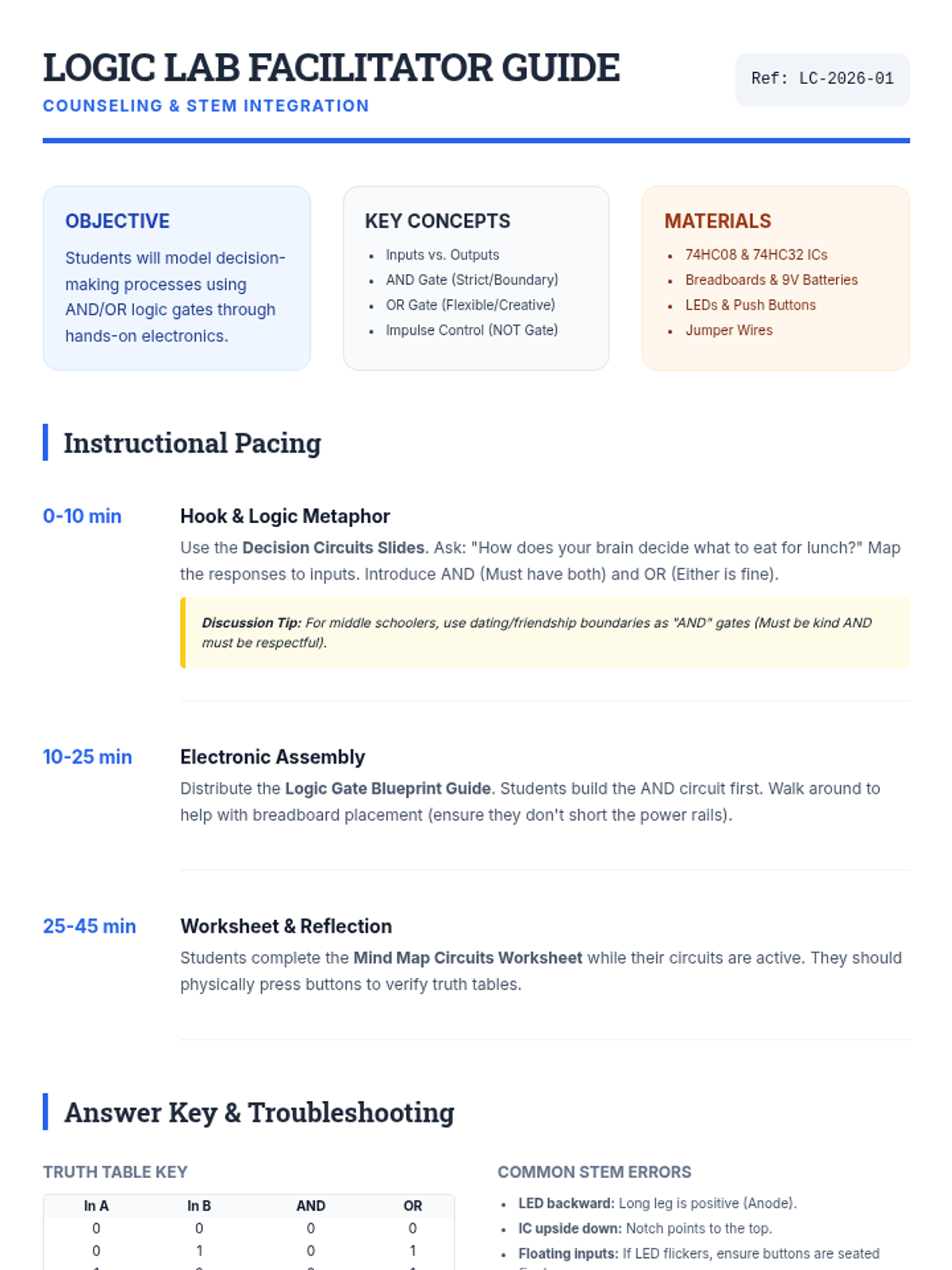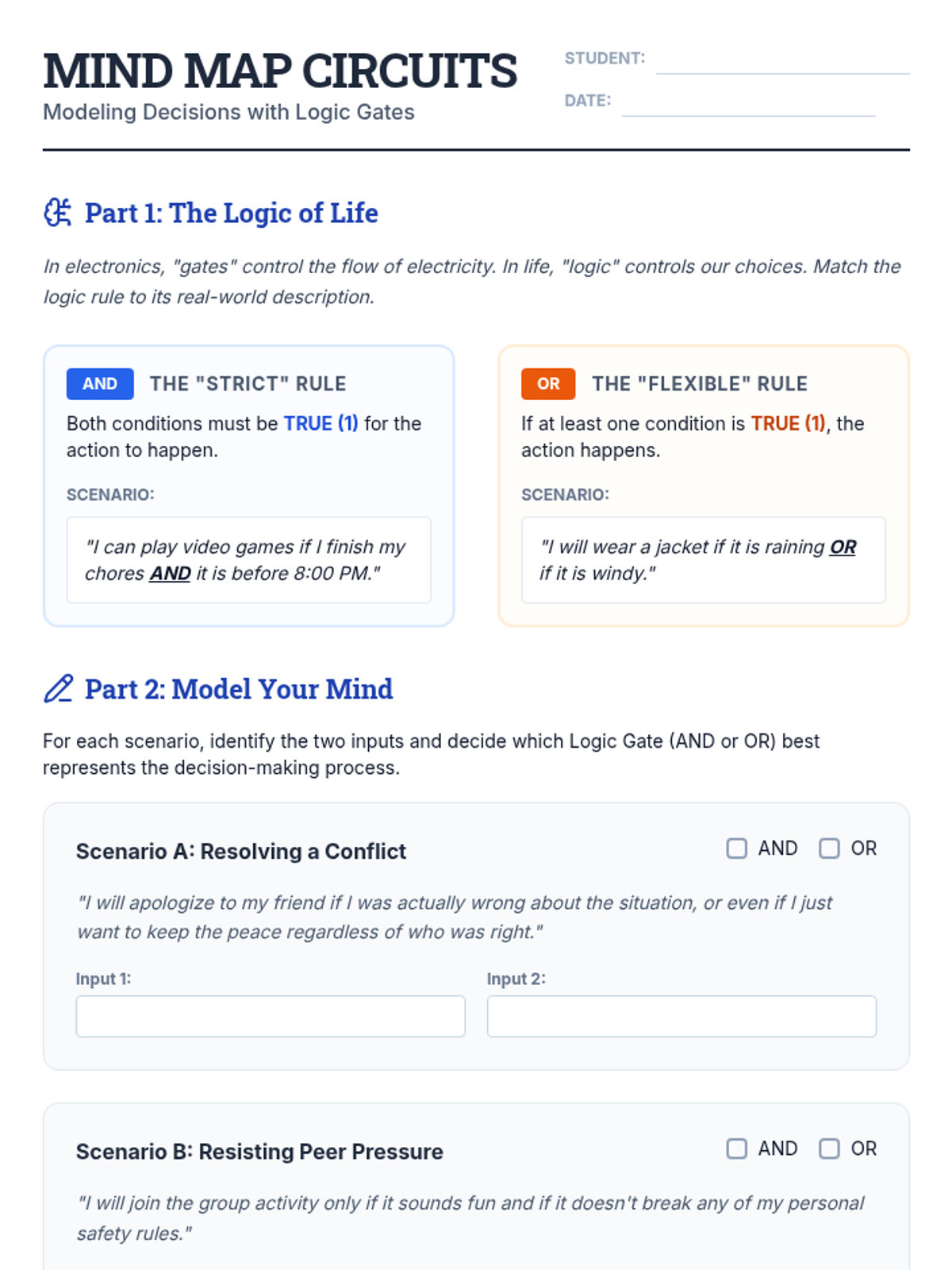 A hands-on STEM and guidance lesson where students use electronic logic gates (AND/OR) to model and solve real-life decision-making scenarios, bridging technical skills with social-emotional reasoning.