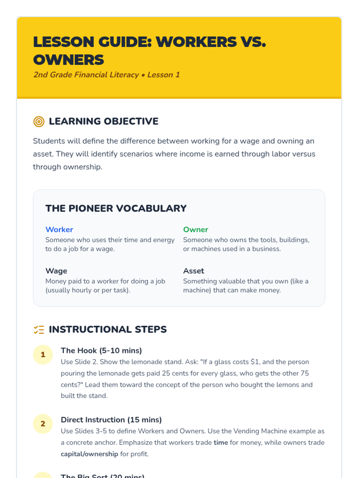 Students explore the difference between working for money (being paid a wage) and owning something that makes money (like a vending machine or a lemonade stand).