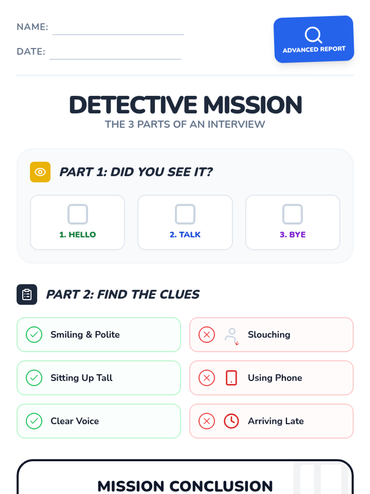 A foundational lesson on understanding and observing job interviews for students with developmental and cognitive disabilities. Students act as 'Interview Detectives' to identify positive and negative interview behaviors through visual observation and simple categorization.