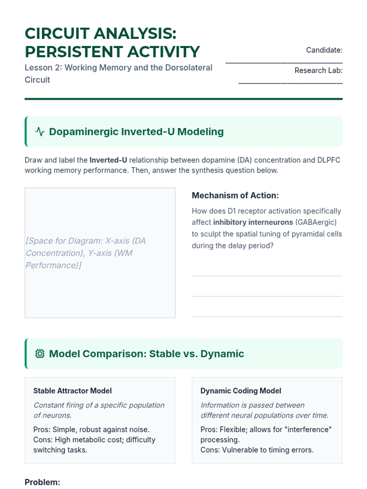 Focus on the cellular basis of working memory, persistent activity in delay periods, and the role of dopamine modulation in the DLPFC and its relation to fluid intelligence.