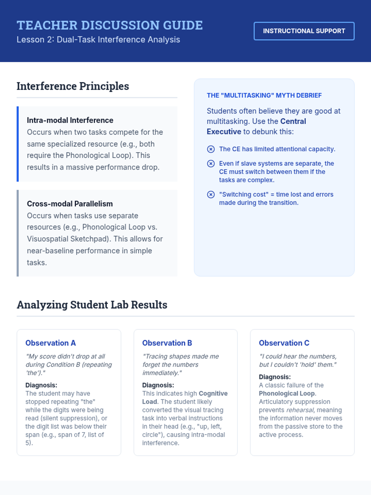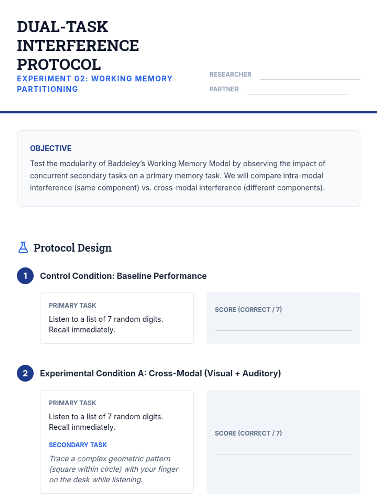 An examination of Baddeley's Working Memory model through dual-task paradigms that isolate the phonological loop and visuospatial sketchpad.