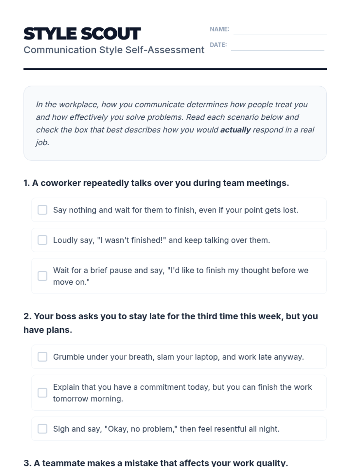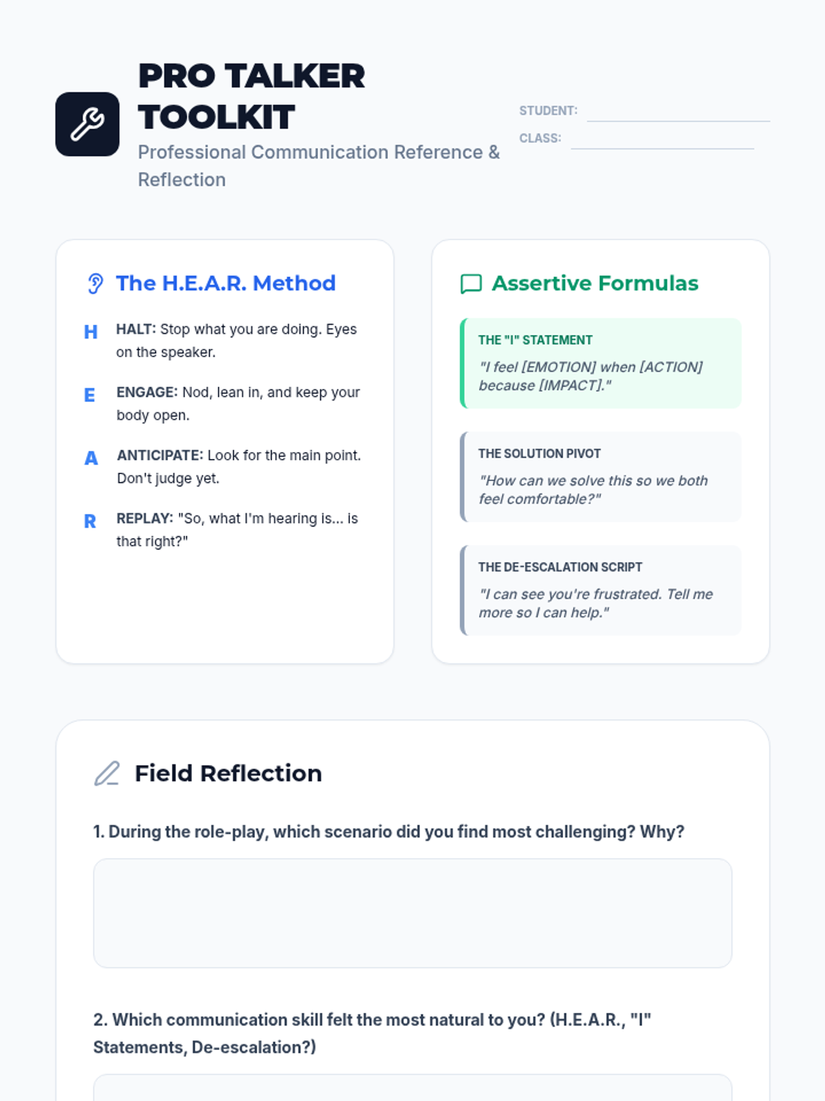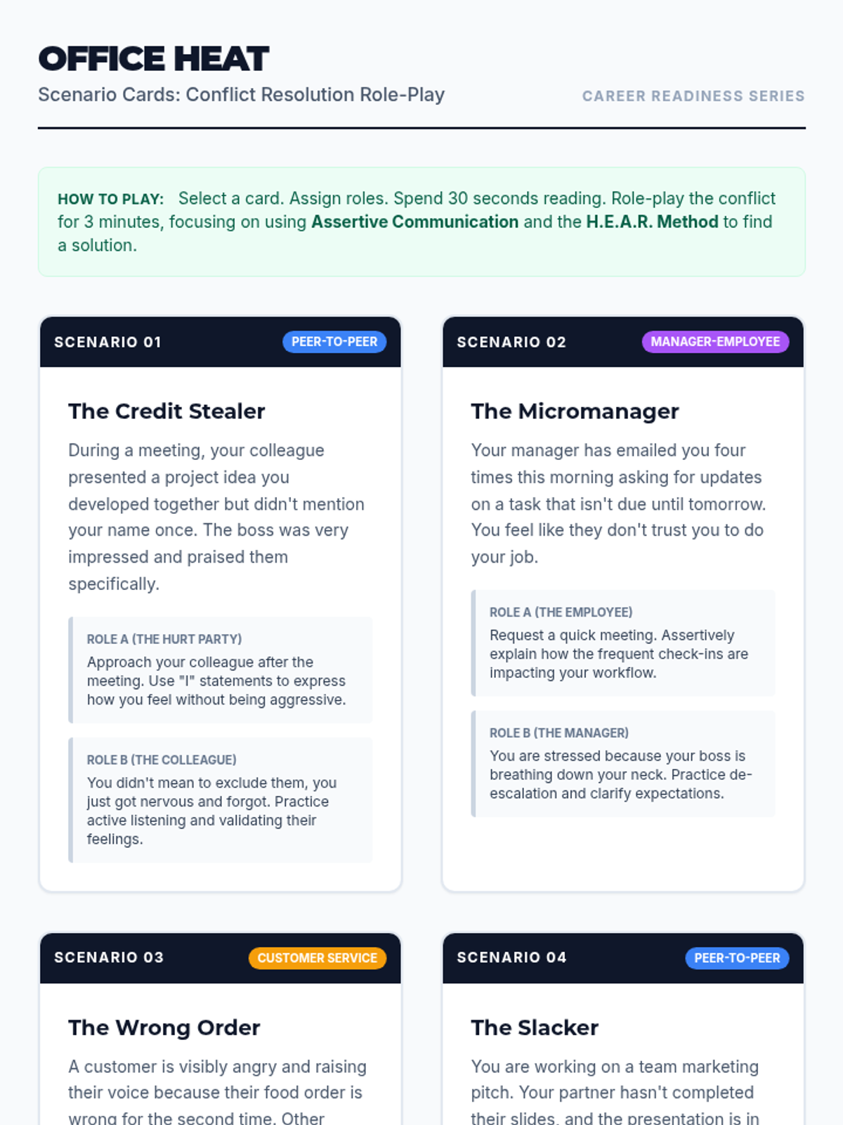 A high school lesson focused on mastering workplace communication and conflict resolution. Students will identify their communication styles, learn de-escalation techniques, and practice navigating professional friction through realistic role-play scenarios.