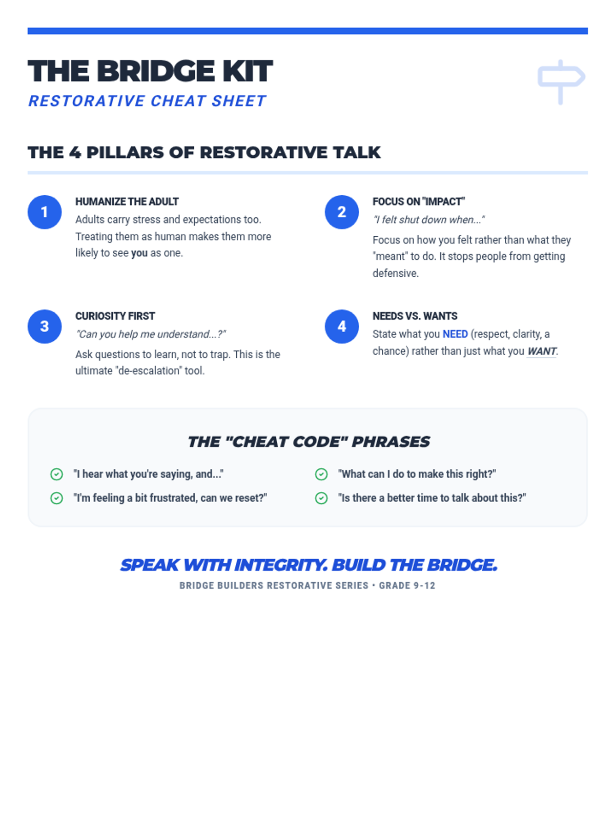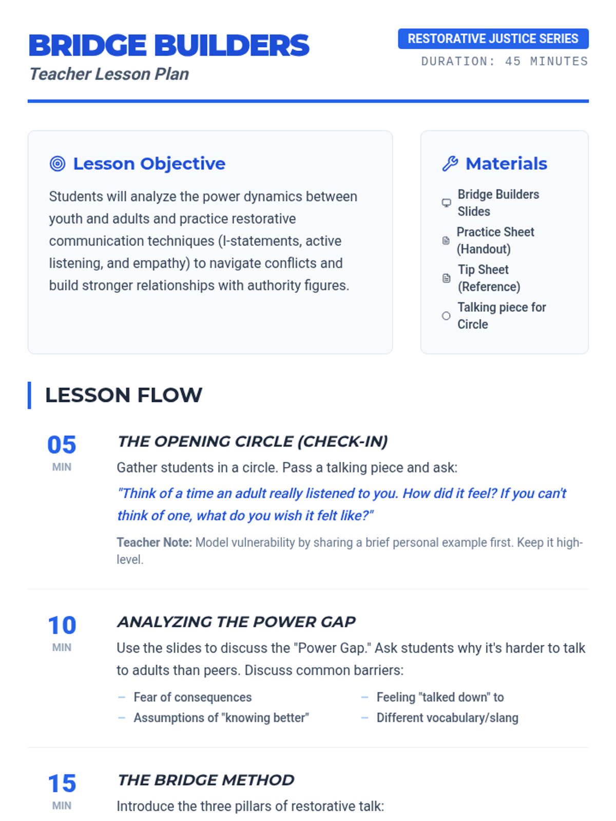 A 45-minute lesson focused on empowering high school students to communicate effectively and restoratively with adults, focusing on power dynamics and empathy.