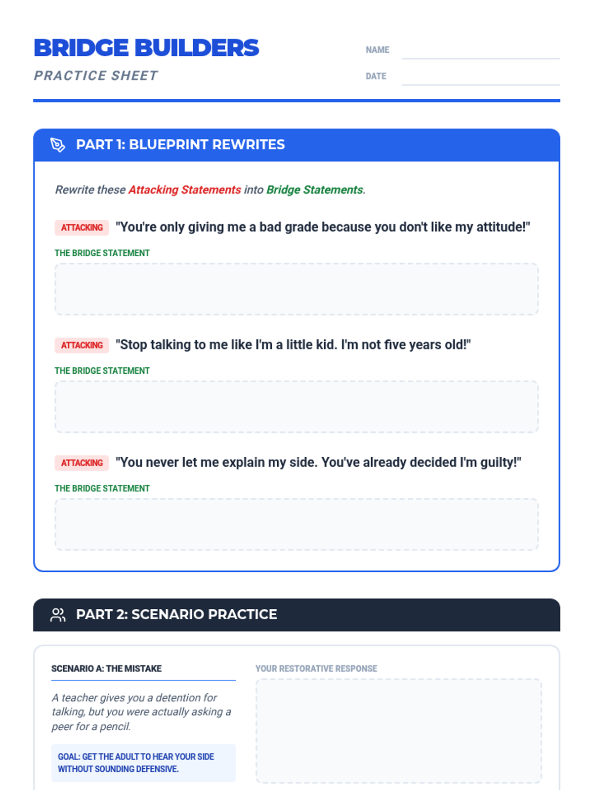A restorative justice and empathy-building lesson designed for individual intervention with students displaying bullying or exclusionary behaviors. The materials focus on self-reflection, perspective-taking, and developing healthier social habits.