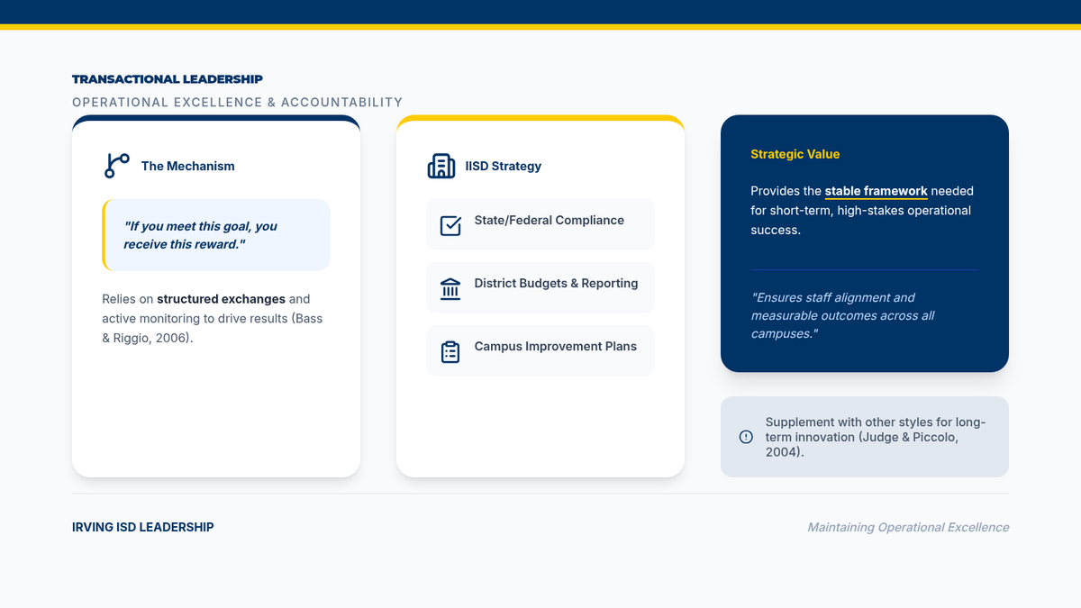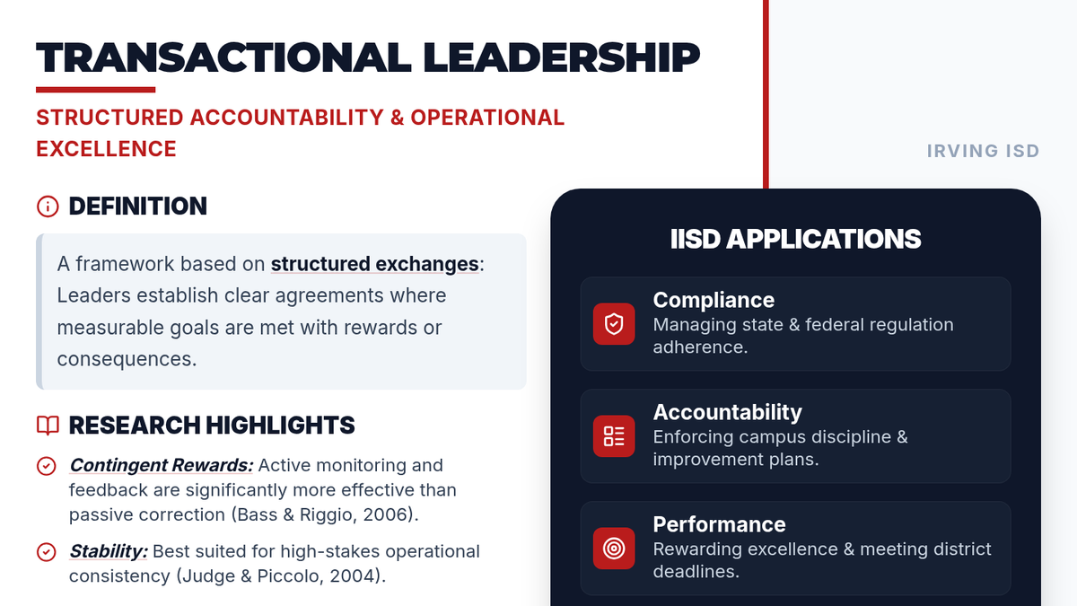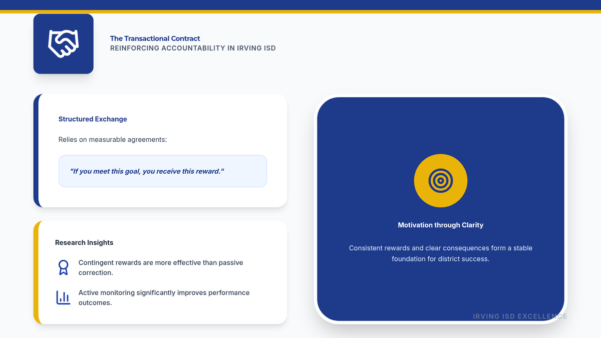 A focused presentation on the mechanics and application of Transactional Leadership within the context of Irving ISD, emphasizing operational excellence and structured accountability.