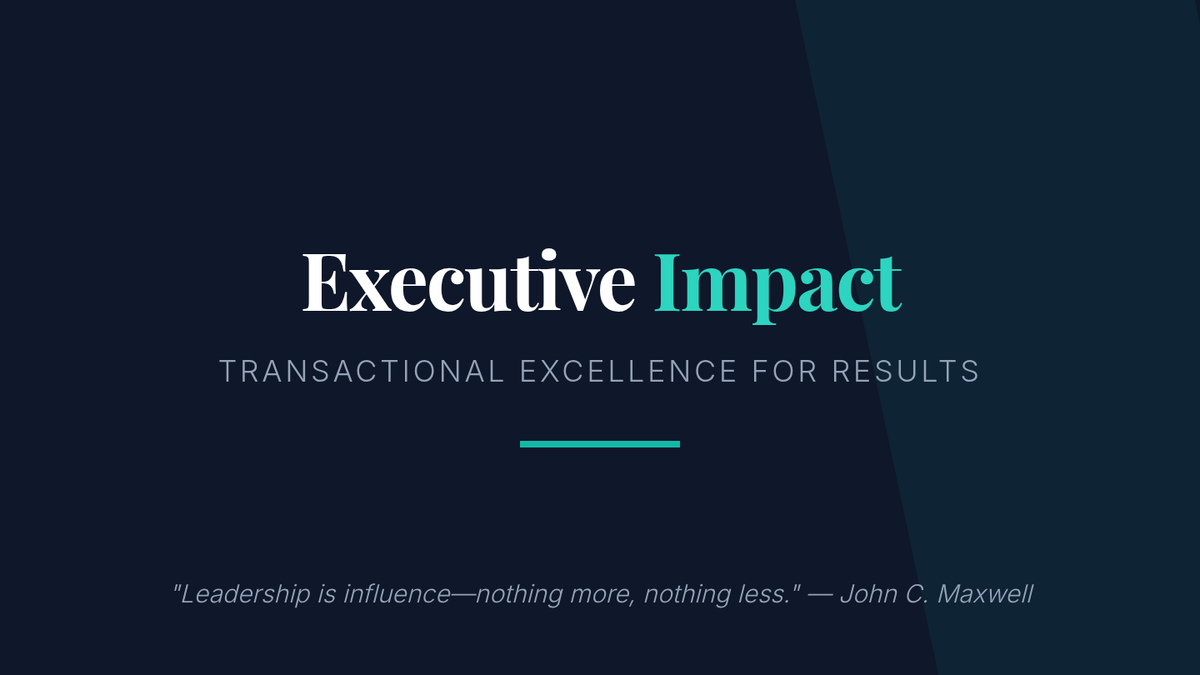A high-level presentation for senior executives focusing on the strategic benefits of transactional leadership and result-oriented management, framed through the lens of John Maxwell's leadership philosophy.