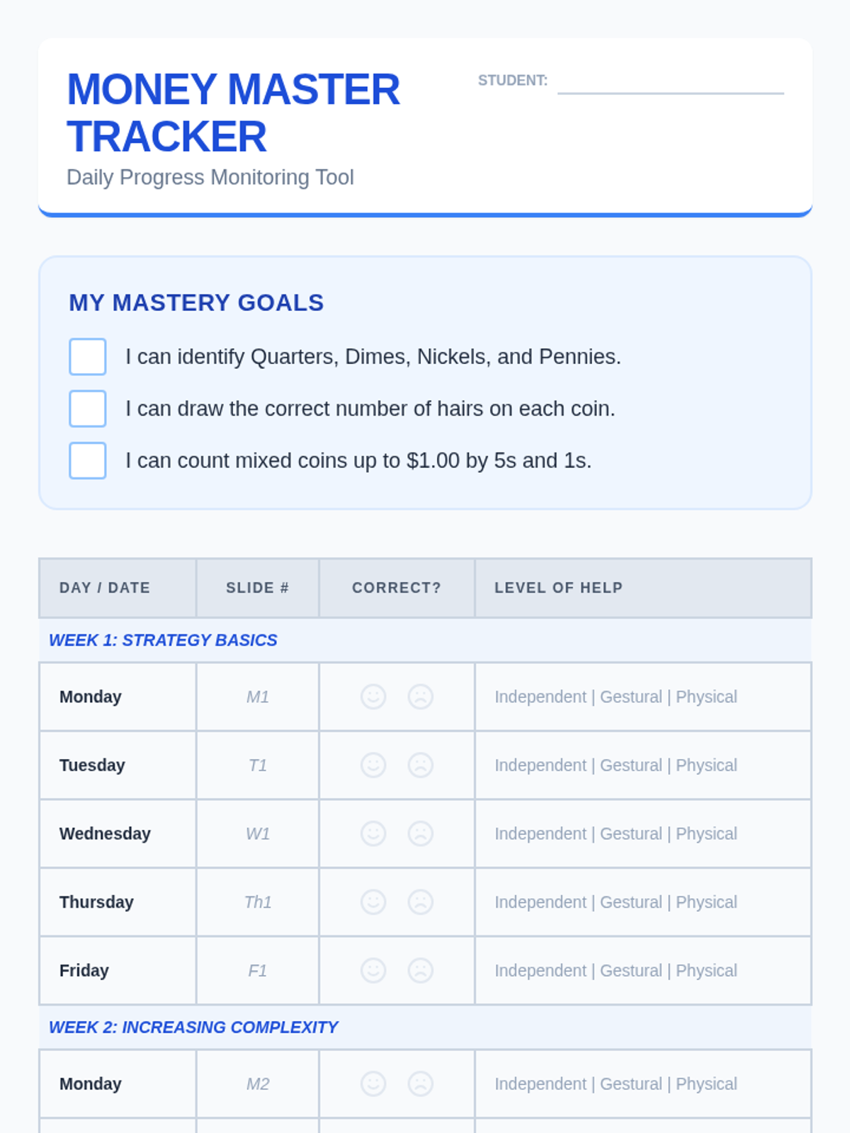 A comprehensive lesson designed to help high school special needs students master counting mixed coins up to $1.00 using the Hairy Money visual strategy. Includes instructional slides, practice worksheets, and printable manipulatives.