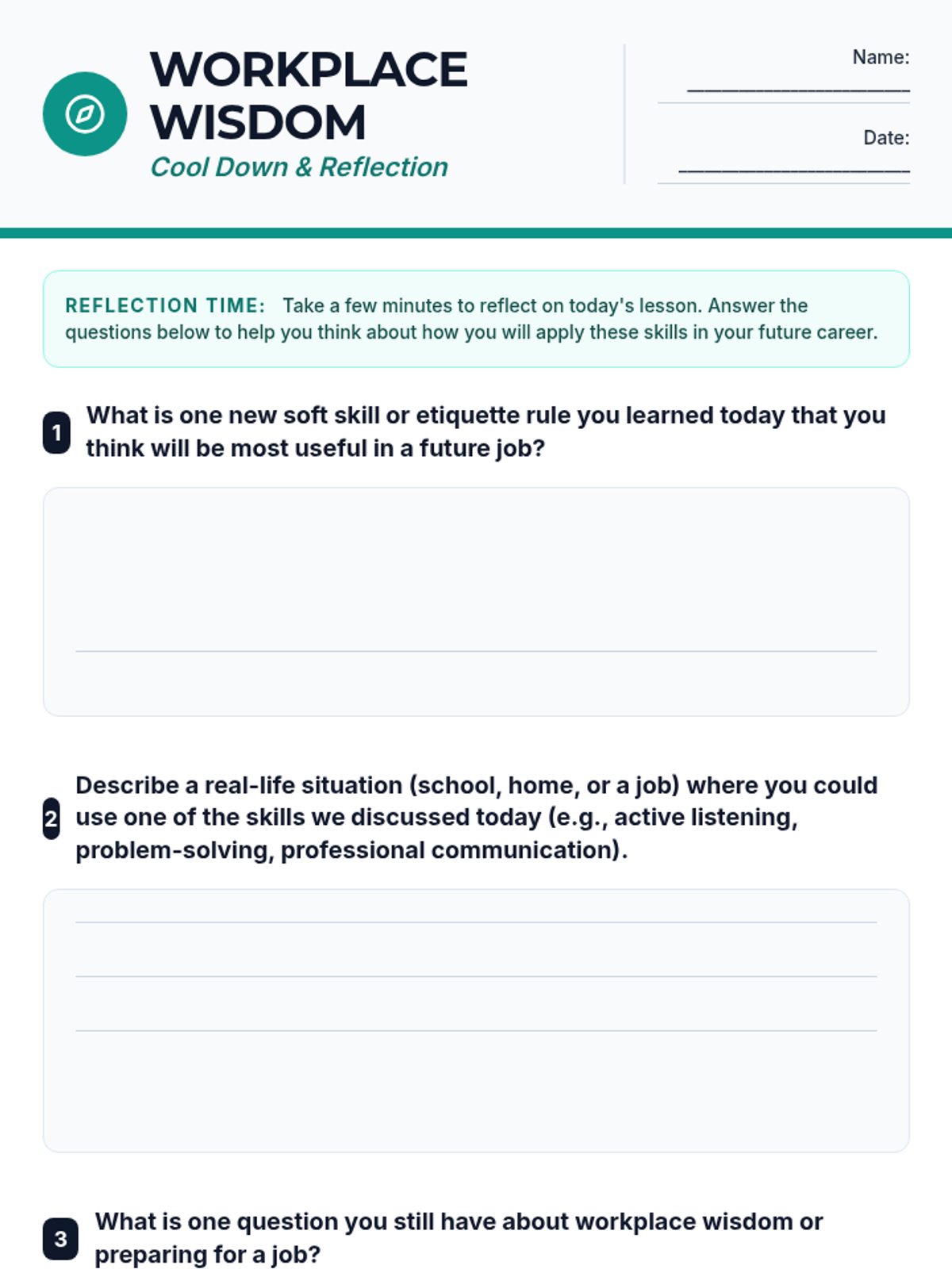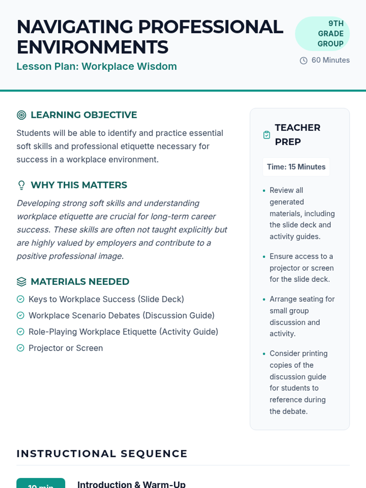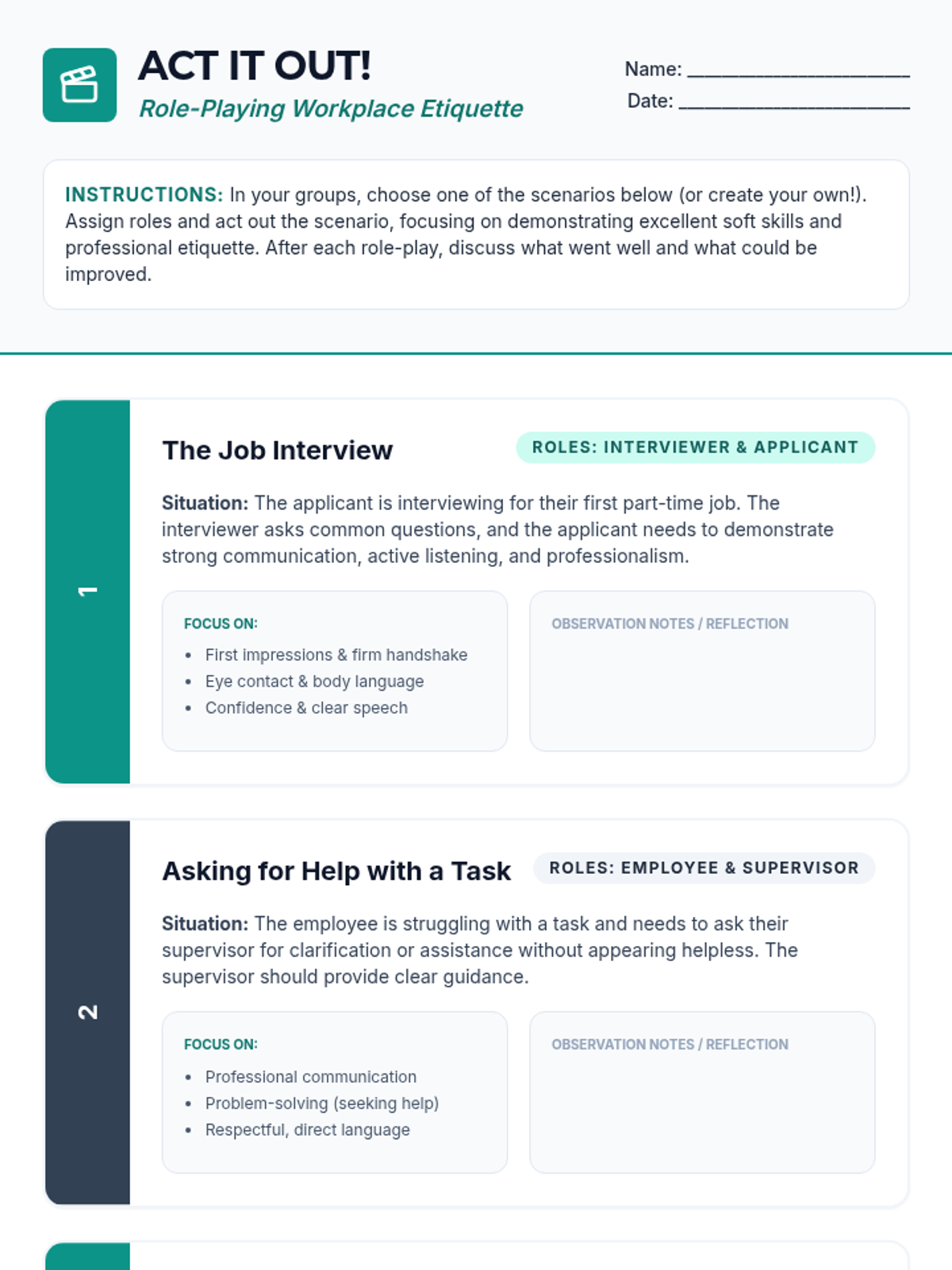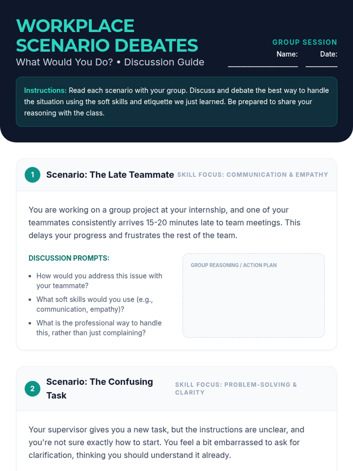This lesson explores essential soft skills and professional etiquette needed for success in any workplace. It helps small groups develop crucial social and communication skills for employment through interactive discussions, role-playing, and scenario analysis.