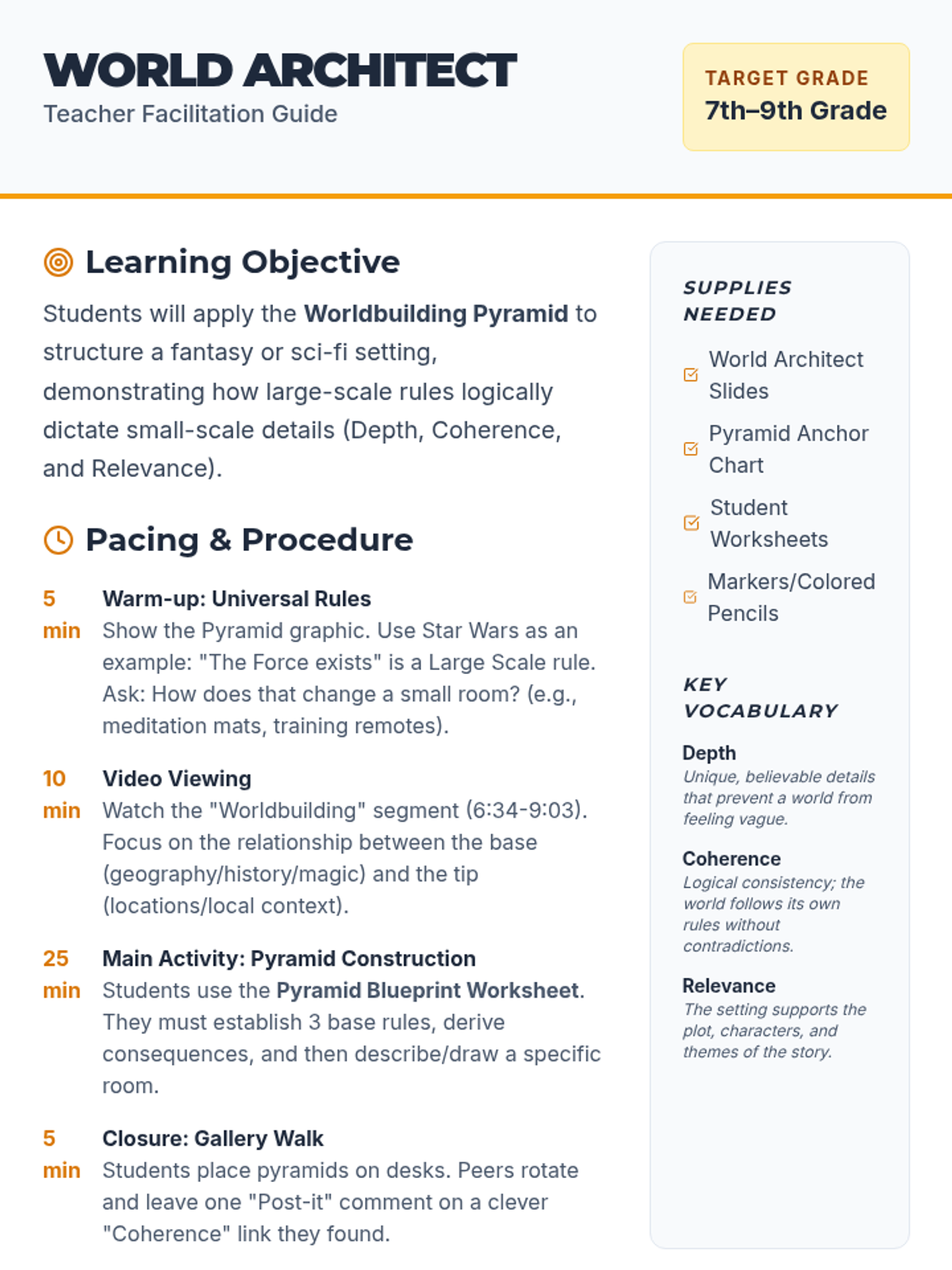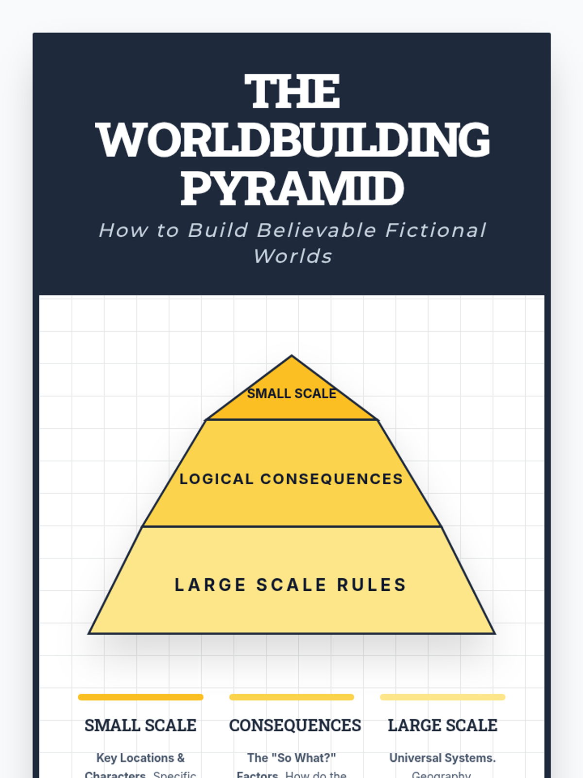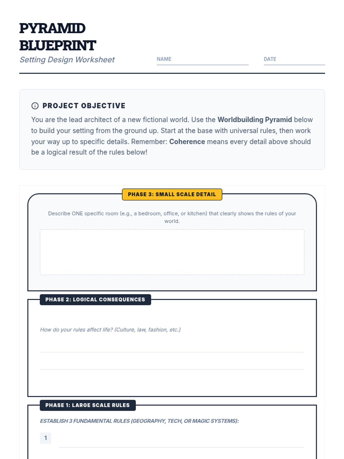 Students will learn the principles of worldbuilding (Depth, Coherence, Relevance) and use the Worldbuilding Pyramid to design a fantasy or sci-fi setting, moving from large-scale rules to small-scale details.