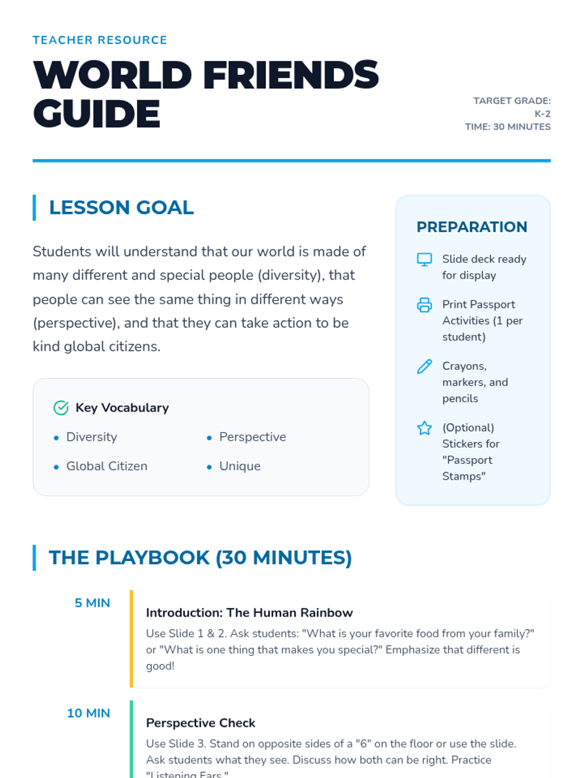 A 30-minute introductory lesson for K-2 students focused on embracing diversity, understanding different viewpoints, and acting as kind global citizens through interactive discussion and creative expression.