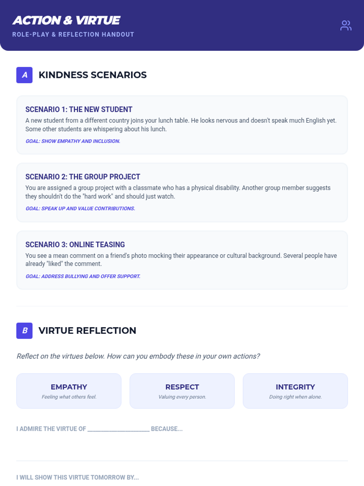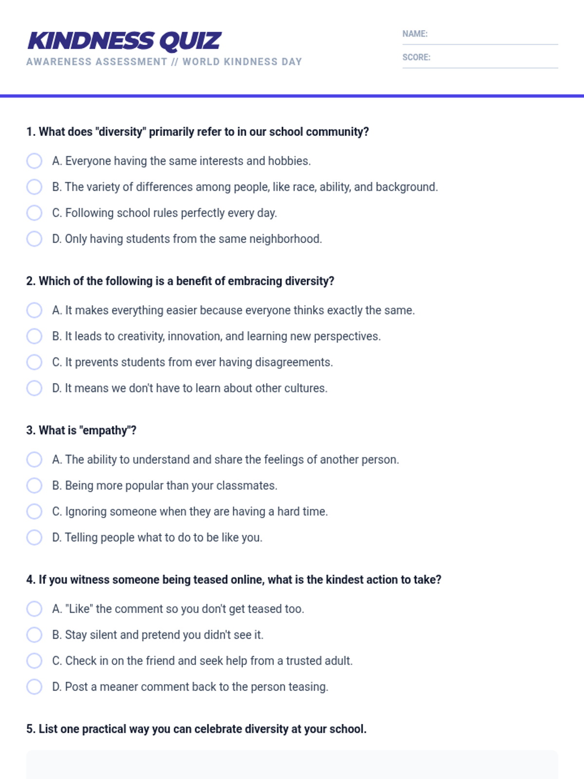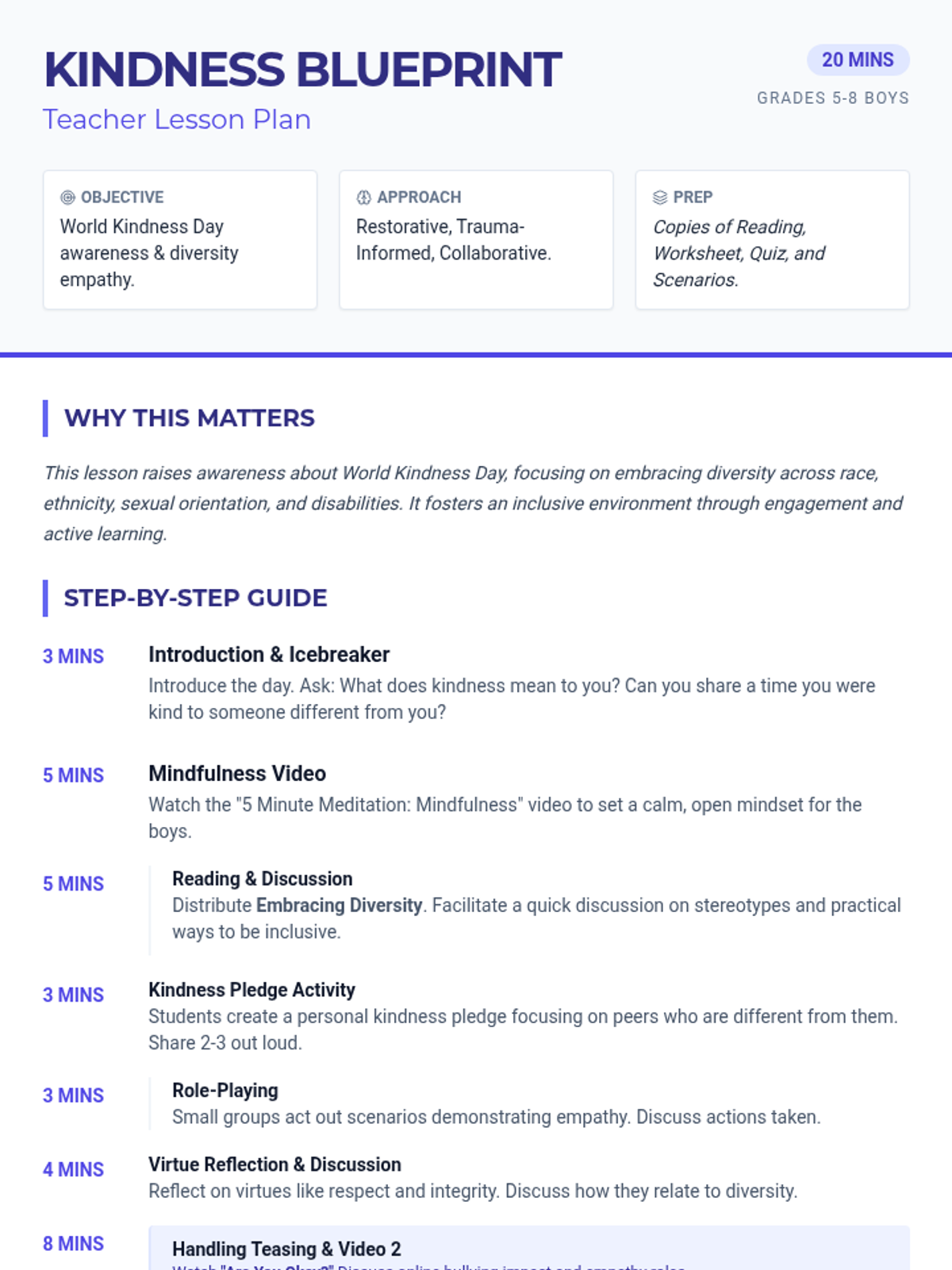 A 20-minute lesson for 5-8th grade boys focused on World Kindness Day, diversity, and empathy. Students engage in mindfulness, reflection, role-playing, and commitment-setting to foster an inclusive school culture.
