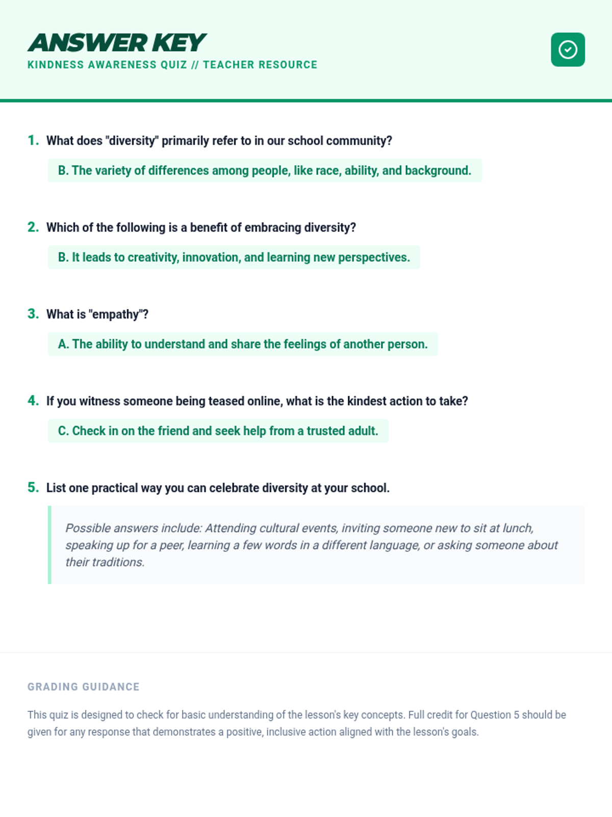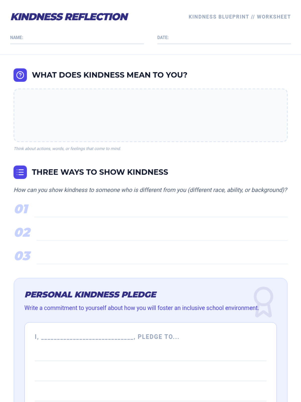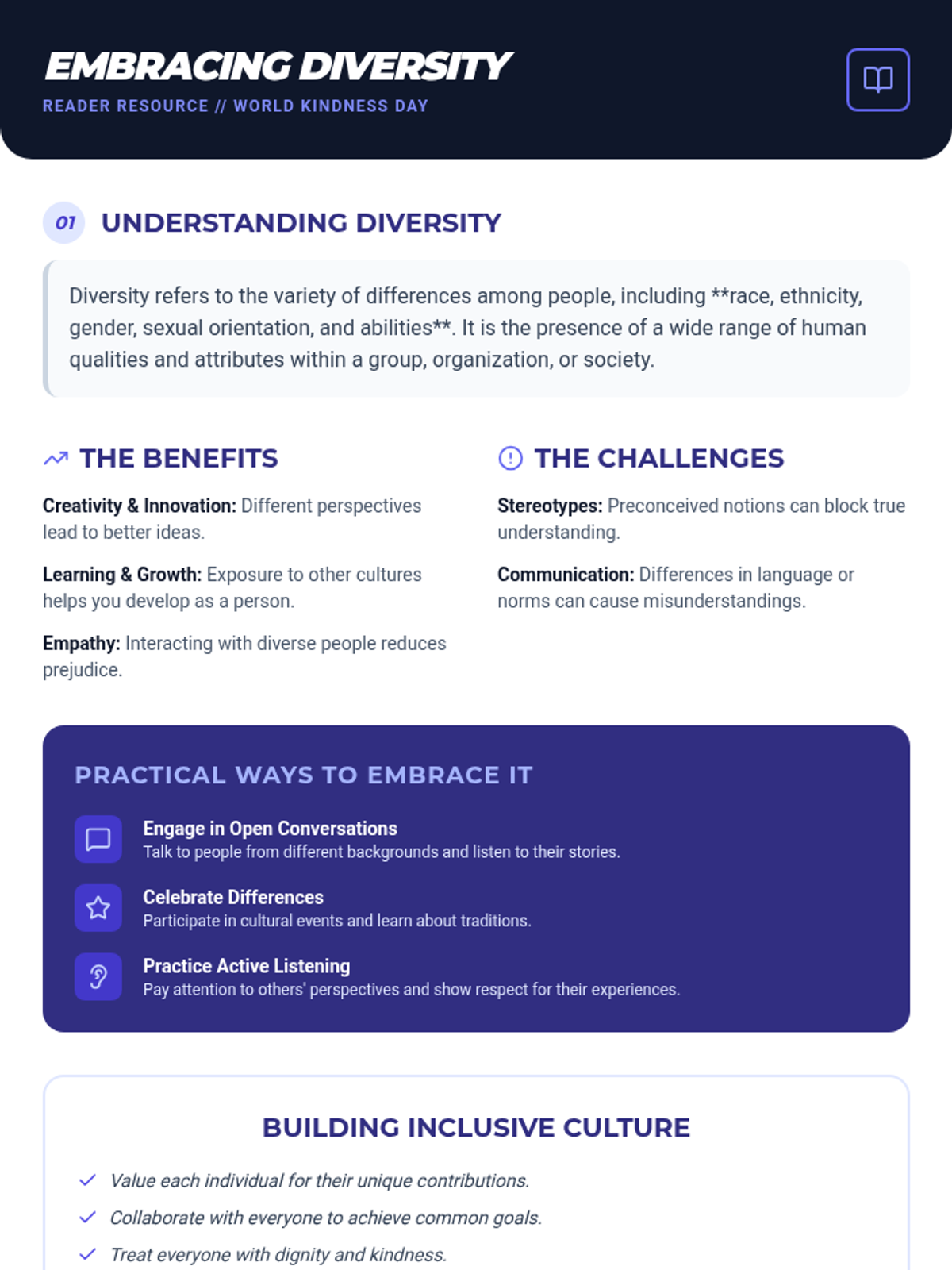 A 20-minute lesson for 5-8th grade boys focused on World Kindness Day, diversity, and empathy. Students engage in mindfulness, reflection, role-playing, and commitment-setting to foster an inclusive school culture.