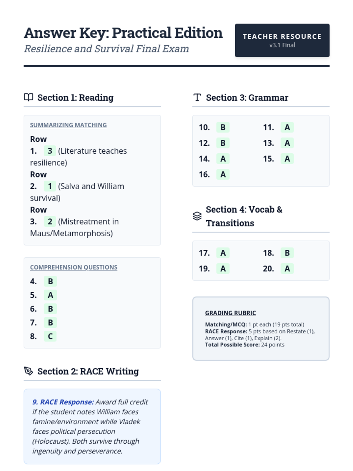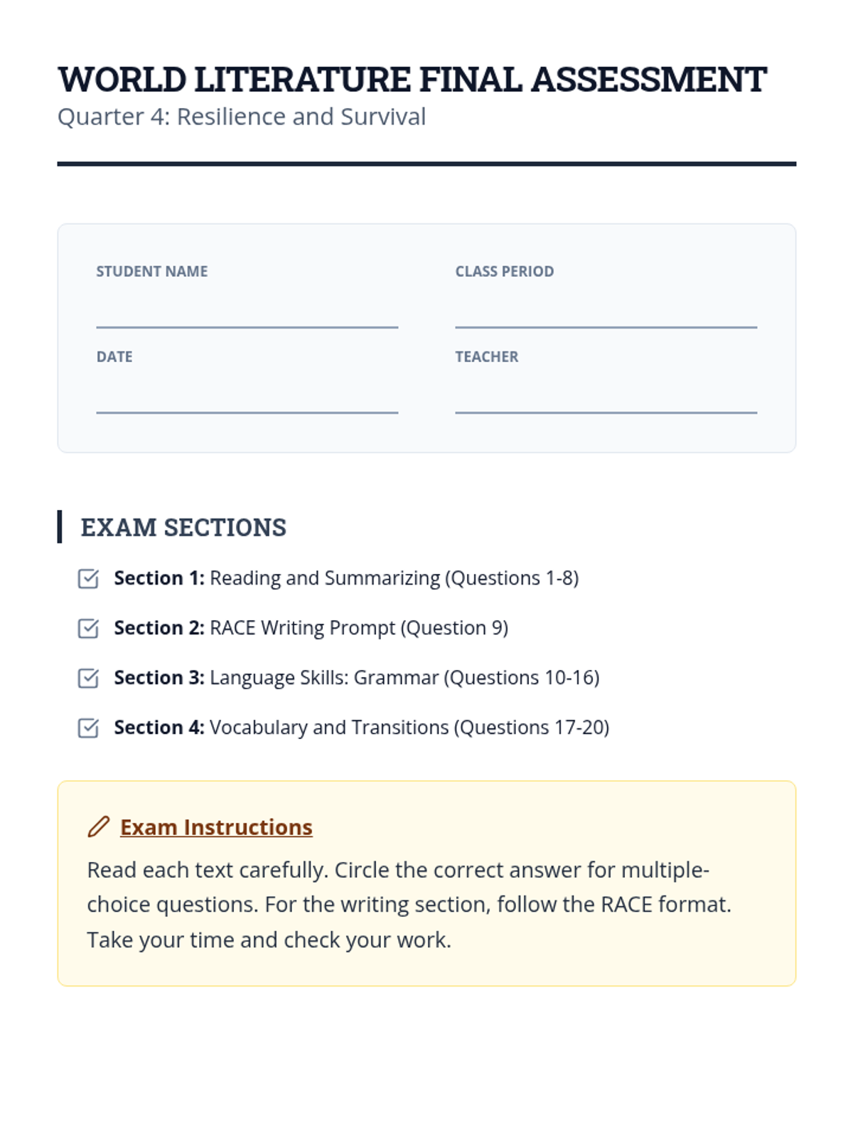 A comprehensive assessment for World Literature covering four major texts: The Boy Who Harnessed the Wind, MAUS, A Long Walk to Water, and Metamorphosis. The assessment tests reading comprehension, grammar, vocabulary, and written analysis using the RACE format.