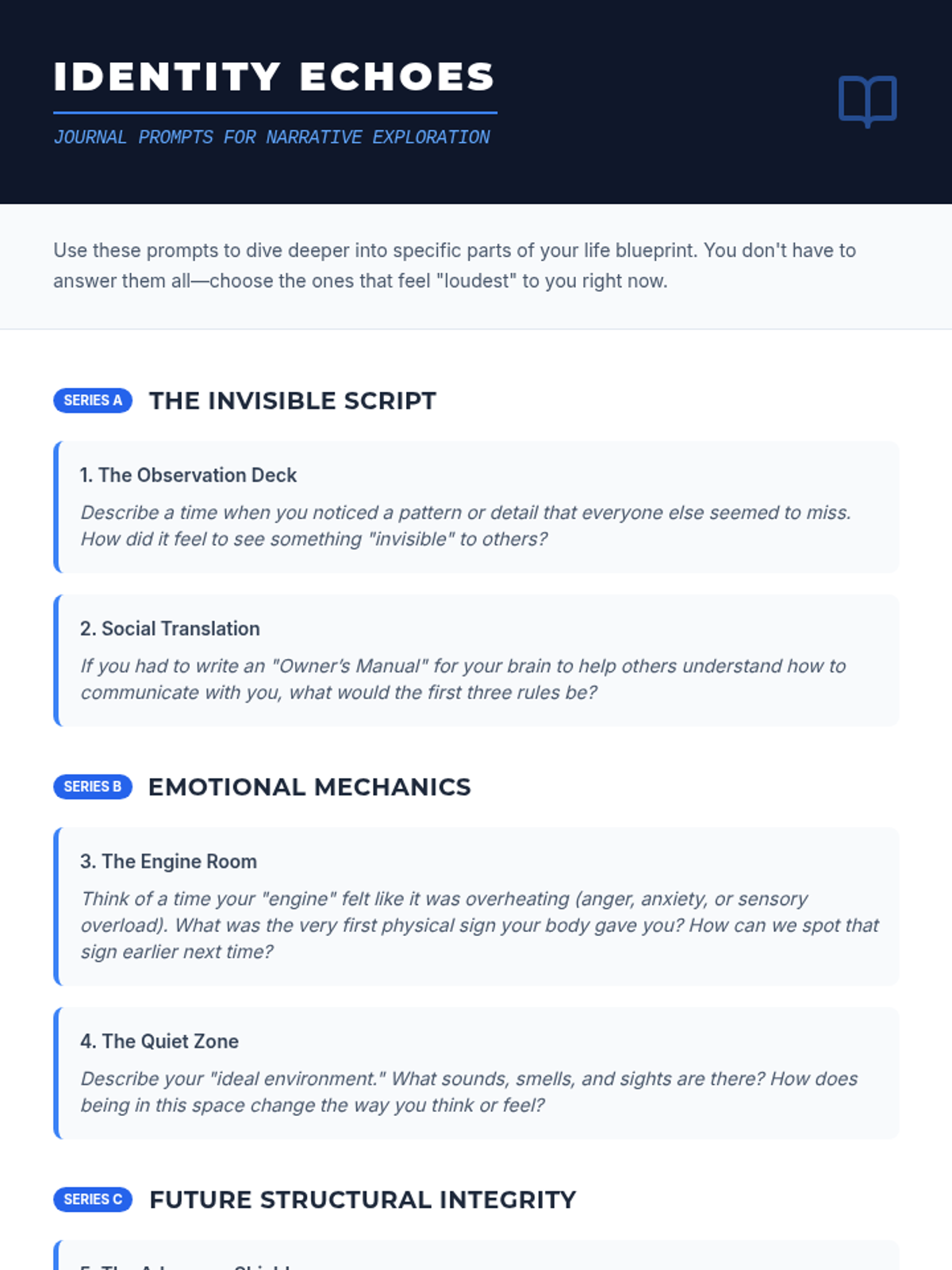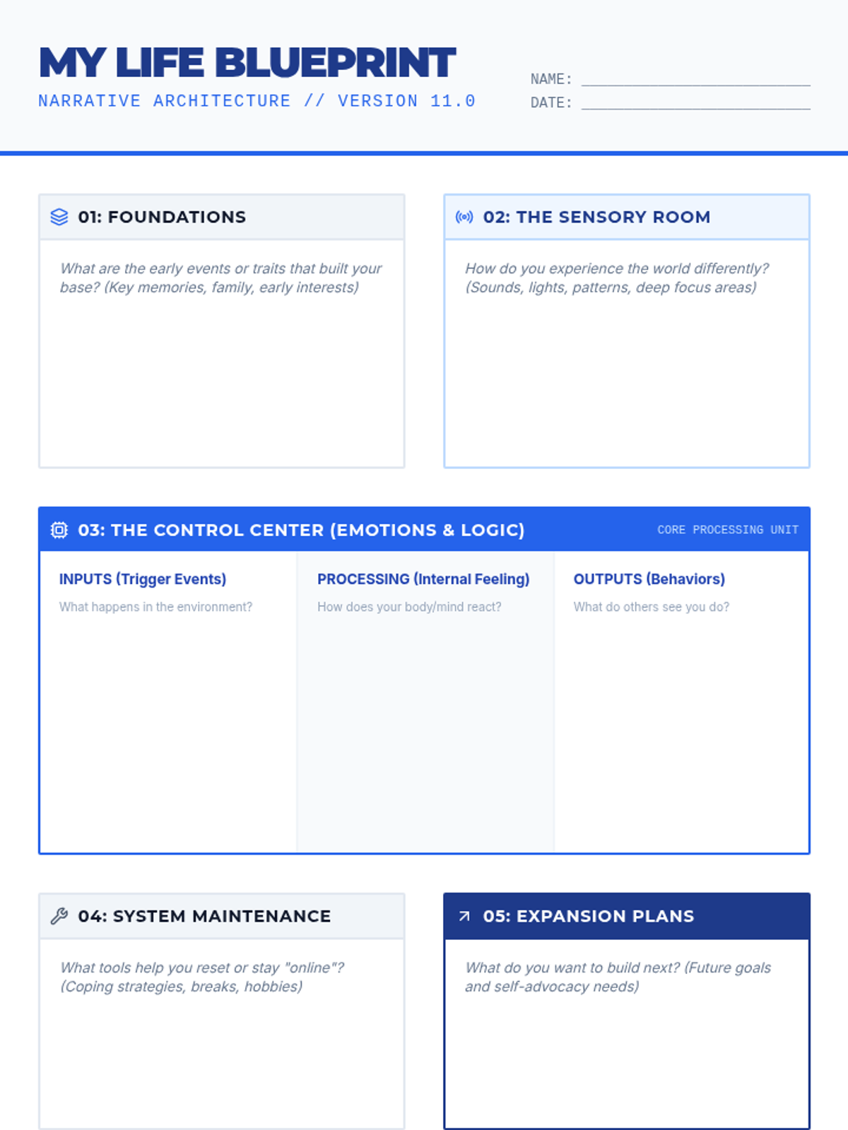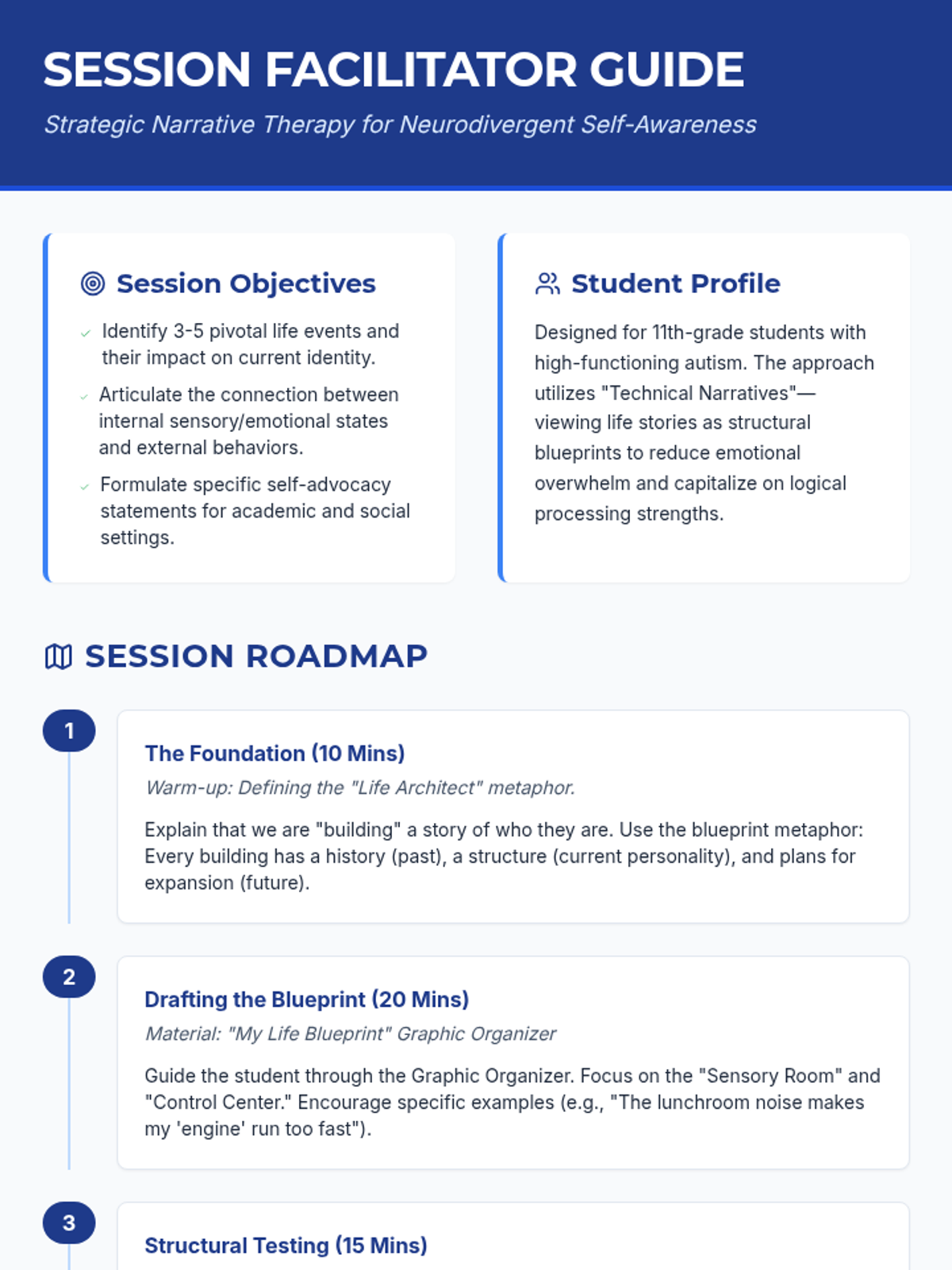 A counseling session designed for 11th-grade students with high-functioning autism to explore their personal narratives, fostering self-awareness through structured reflection on their unique perspectives, emotional patterns, and self-advocacy needs.